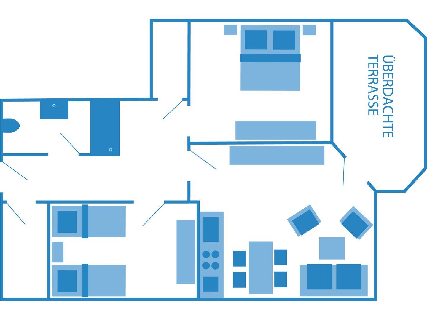 Zwei separate Schlafzimmer sorgen für Privatsphäre: eines ist mit einem bequemen Doppelbett ausgestattet, das zweite mit zwei Einzelbetten. Der helle Wohnbereich mit angrenzender Küchenzeile und Essplatz lädt zum Verweilen ein. Direkt vom Wohnzimmer aus gelangen Sie auf die sonnige Südterrasse, die mit Gartenmöbeln ausgestattet ist – perfekt für ein Frühstück im Freien oder entspannte Stunden nach einem Strandtag.