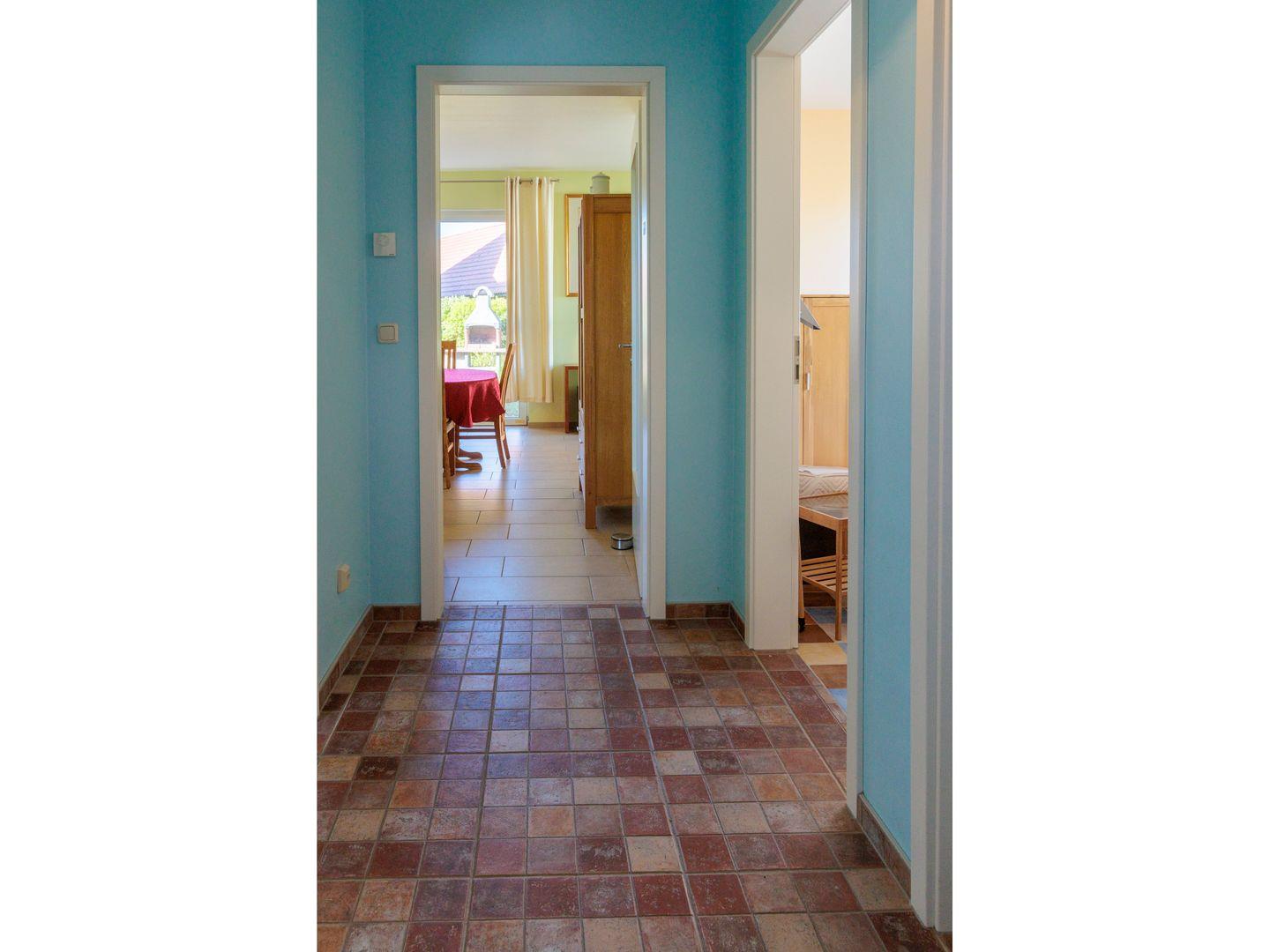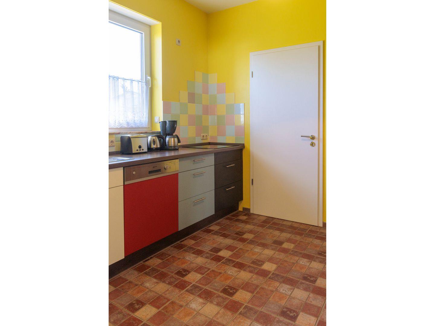 Das in Bahamasrot gehaltene Ferienhaus ist 81 m² groß & verfügt über zwei separate Eingänge zu jeweils einer Ferienwohnung.