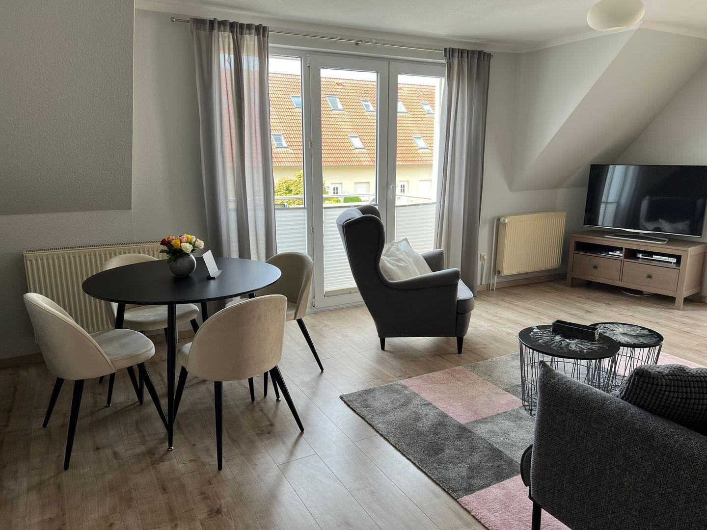 Stilvolle Einrichtung des Wohnzimmers im Ferienhaus zur Wellenwiese, Gesamtgröße 50 m² für 2 Personen. Die Maisonettewohnung ist über eine Außentreppe zu erreichen, wurde erst kürzlich renoviert und hell und freundlich eingerichtet.
