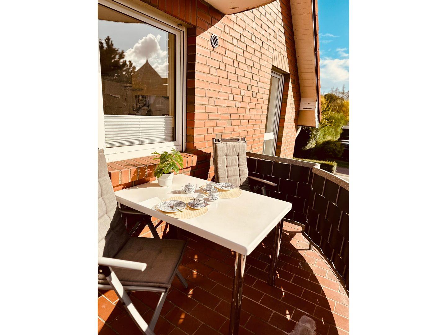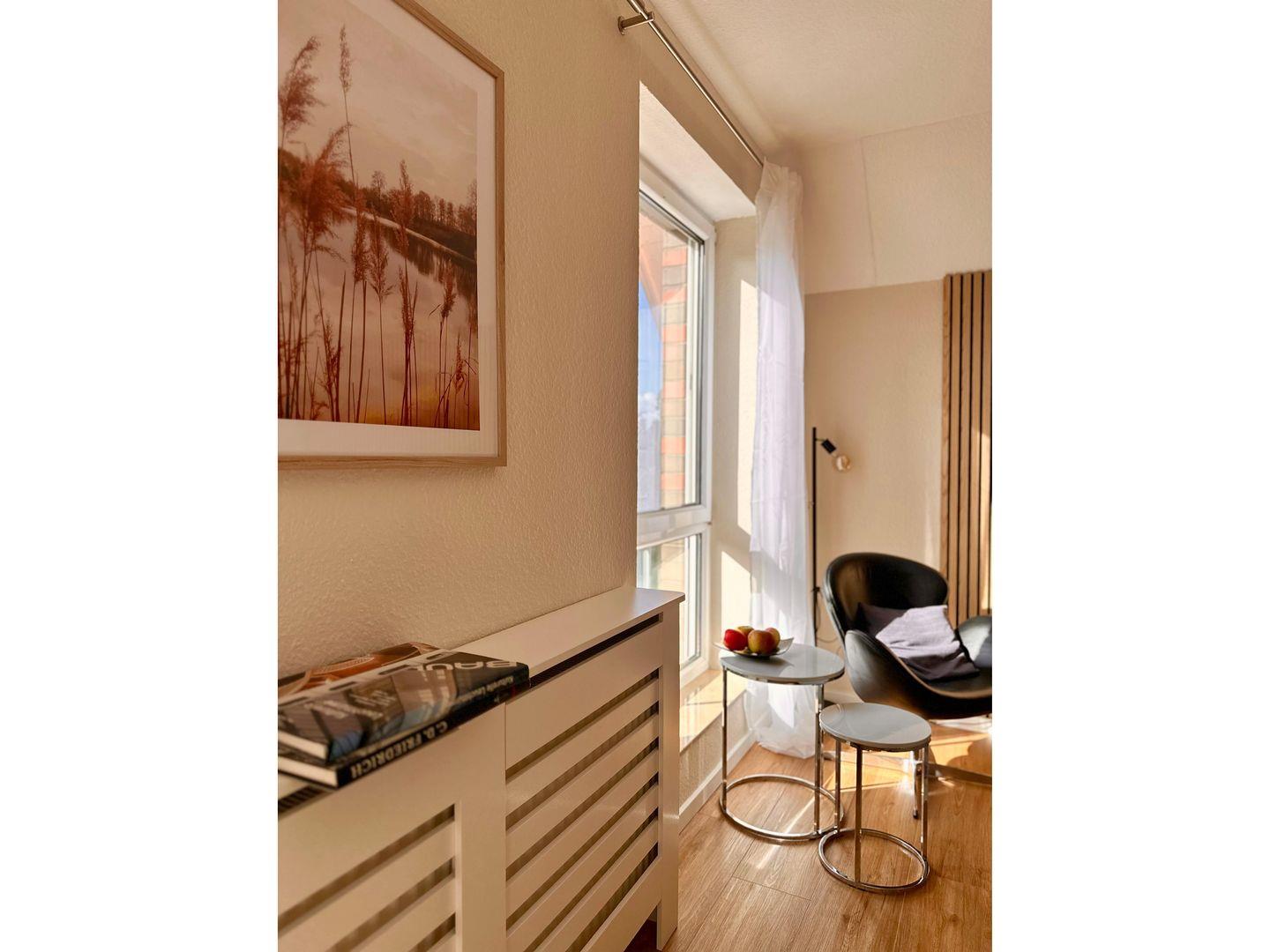 Der geräumige Wohnbereich mit ausreichend Sitzmöglichkeiten für bis zu 4 Personen geht direkt in die Essecke und die offene Küchenzeile über, diese ist modern und umfangreich ausgestattet. Hier befindet sich auch der Zugang zum möblierten Westbalkon.