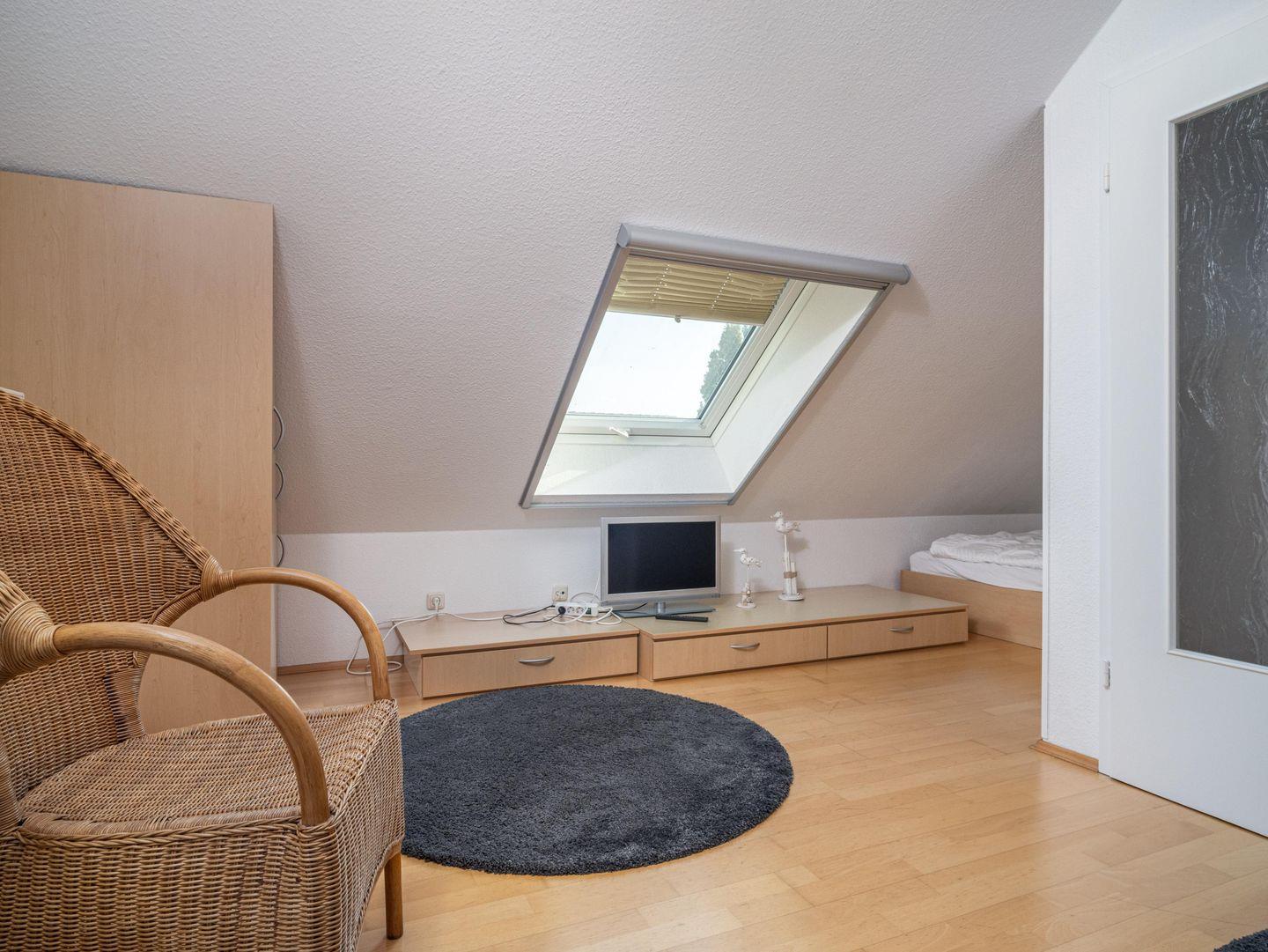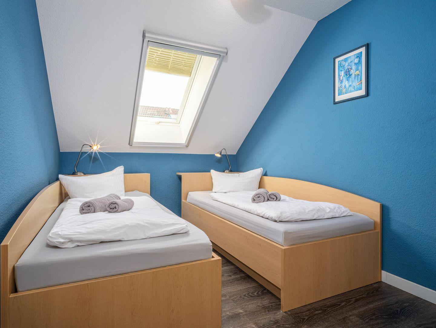 Die Wohnung entfaltet sich auf zwei Ebenen in einem warmen, einladenden Ambiente. Ihr erster Blick fällt auf das charmante Schlafzimmer mit zwei Einzelbetten, ideal für eine ruhige Nacht. Gleich daneben befindet sich das zweite Schlafzimmer mit einem komfortablen Doppelbett, das zum Entspannen einlädt. Das moderne Badezimmer mit Dusche und WC ist ein weiteres Highlight, das keine Wünsche offen lässt.
