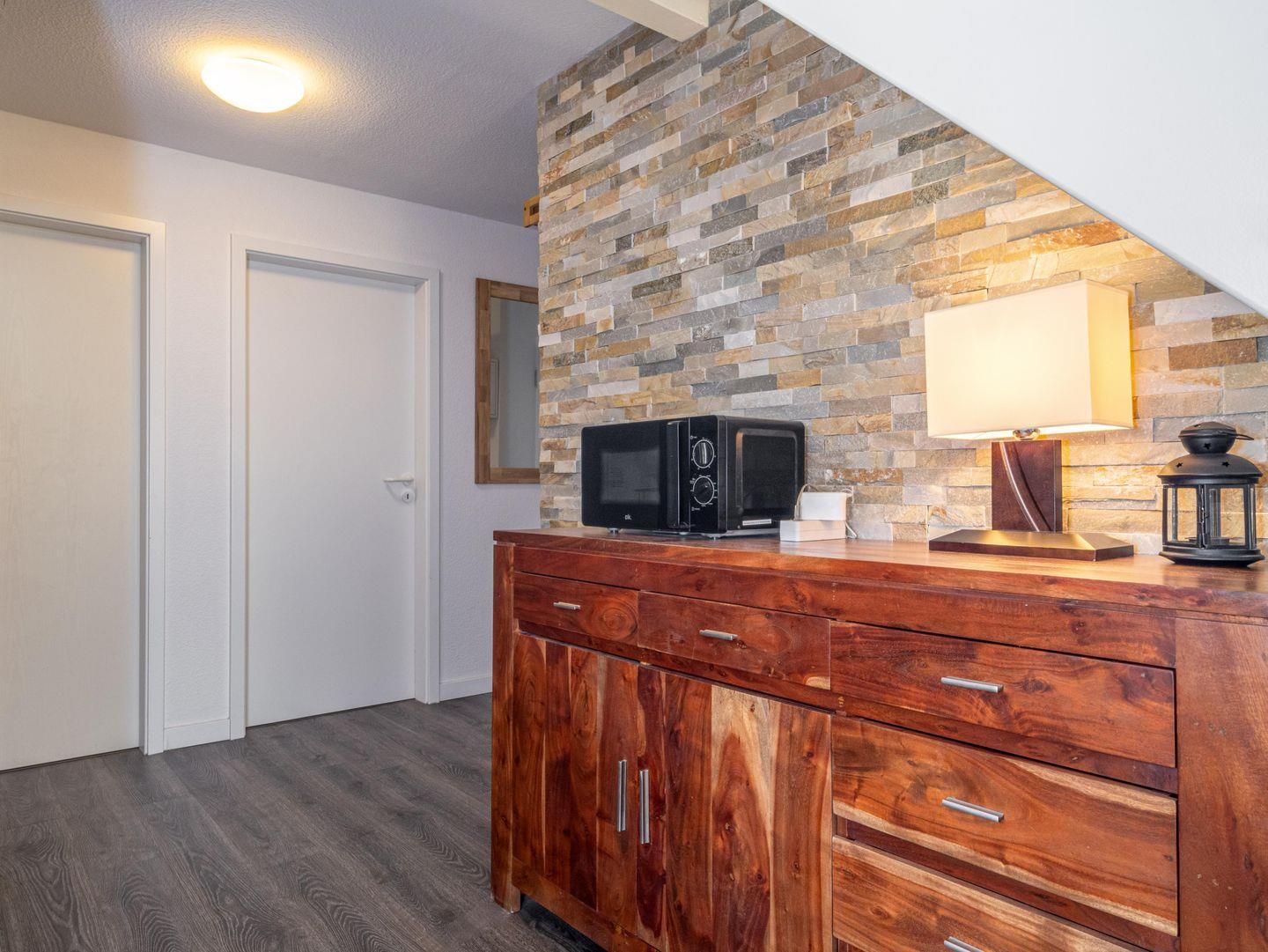 Begeben Sie sich in den gemütlichen Wohn- und Essbereich, der mit einer modernen Einbauküche ausgestattet ist. Hier können Sie gemeinsam kochen und die schönsten Momente teilen. Die Küche bietet alles, was das Herz begehrt: Kochfeld, Spülmaschine, Mikrowelle, Kühlschrank, Toaster, Wasserkocher und sogar eine Filterkaffeemaschine.