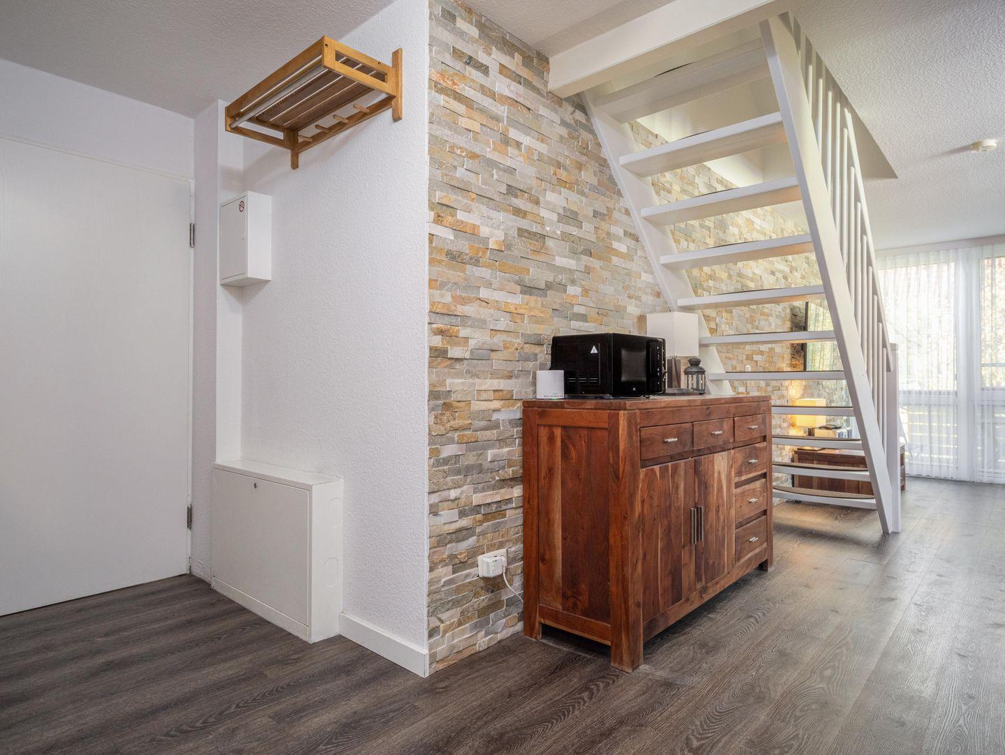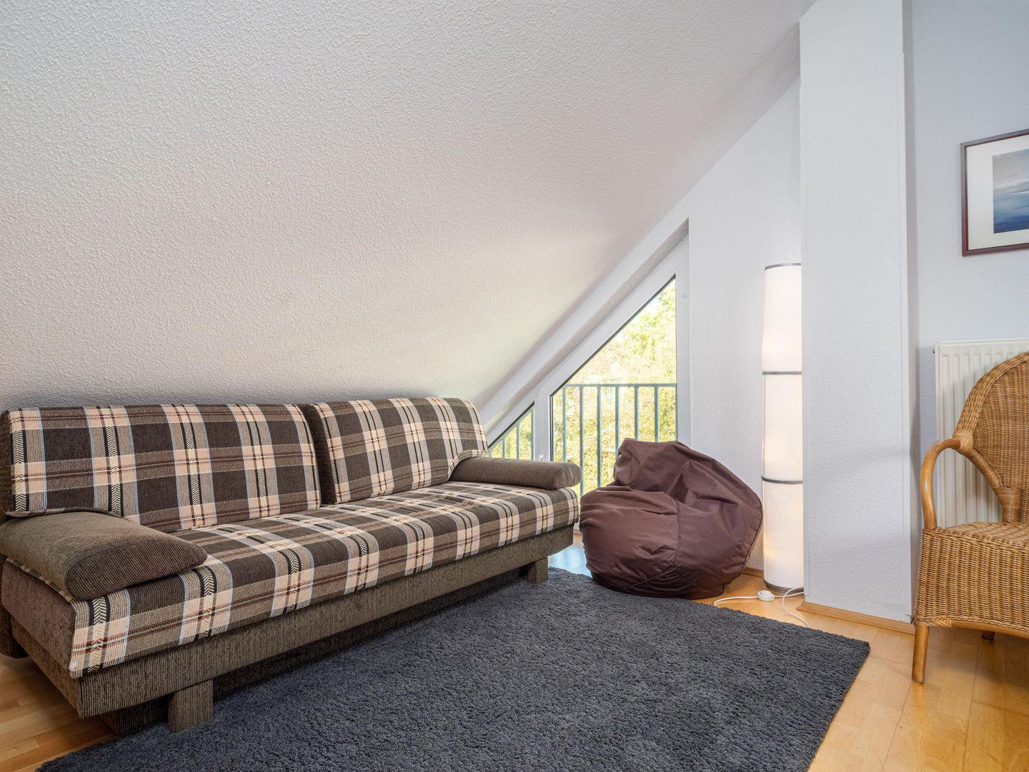 Über eine Treppe erreichen Sie den oberen Wohn- und Schlafbereich, wo Sie ein weiteres Doppelbett und eine gemütliche Sitzecke erwarten.