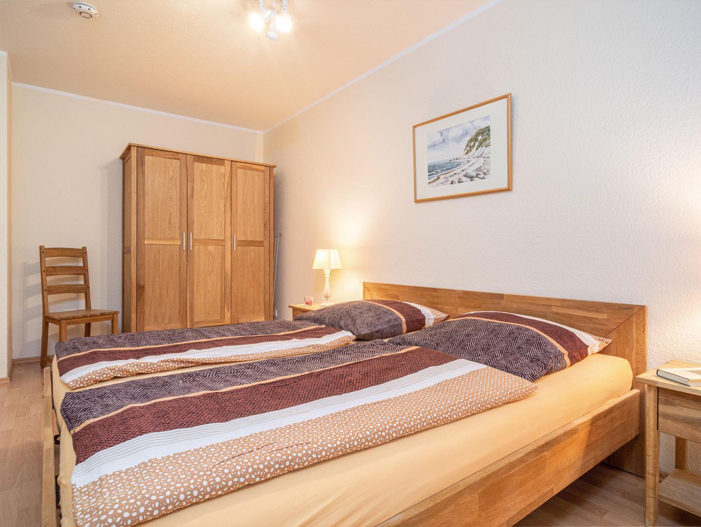 Die Wohnung verfügt über zwei Schlafzimmer, wobei das größere mit einem Doppelbett ausgestattet ist. Im kleineren Schlafzimmer stehen zwei Einzelbetten zur Verfügung.