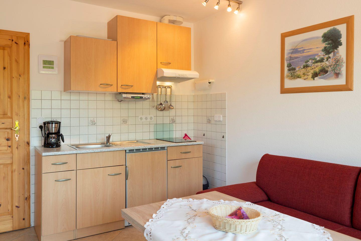 Die Ferienwohnung verfügt über ein gut eingerichtetes Wohnzimmer, das mit einer komfortablen Couch und einem modernen Fernseher ausgestattet ist – perfekt für gemütliche Abende nach einem aufregenden Tag am Strand. Die offene Küche ist ein wahres Highlight: Sie ist voll ausgestattet mit Cerankochfeld, Kühlschrank, Gefrierfach, Kaffeemaschine und vielen weiteren Küchenutensilien, die das Kochen zum Vergnügen machen. Hier können Sie sich Ihre Lieblingsgerichte zubereiten und anschließend in der hellen und einladenden Atmosphäre genießen.