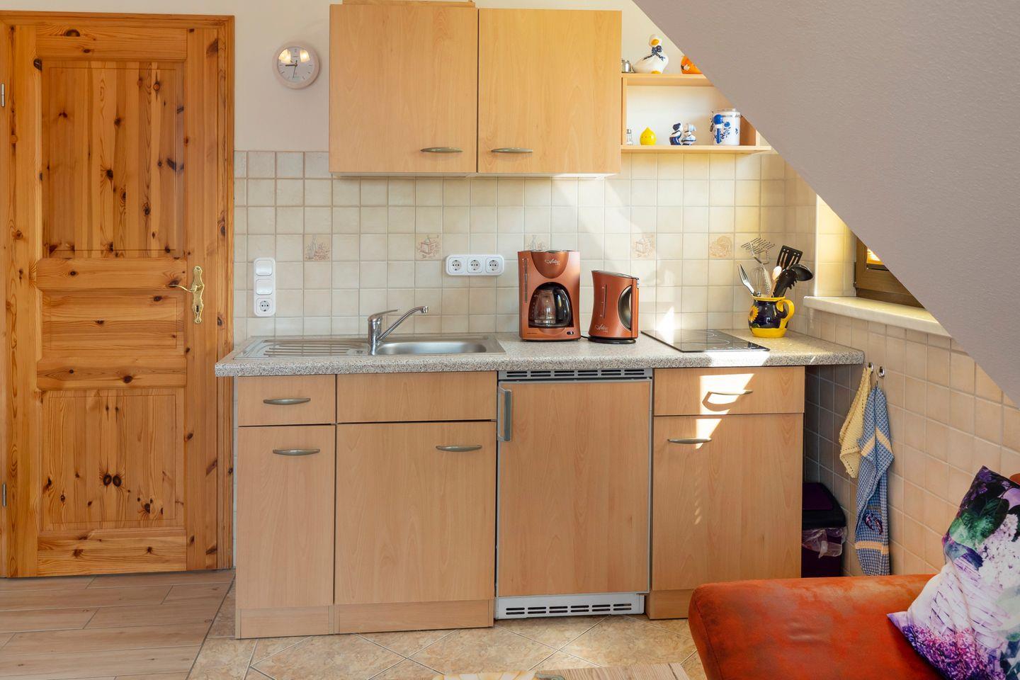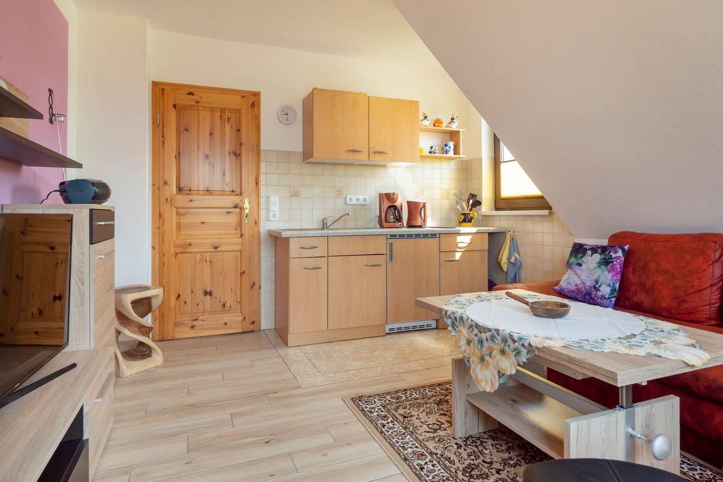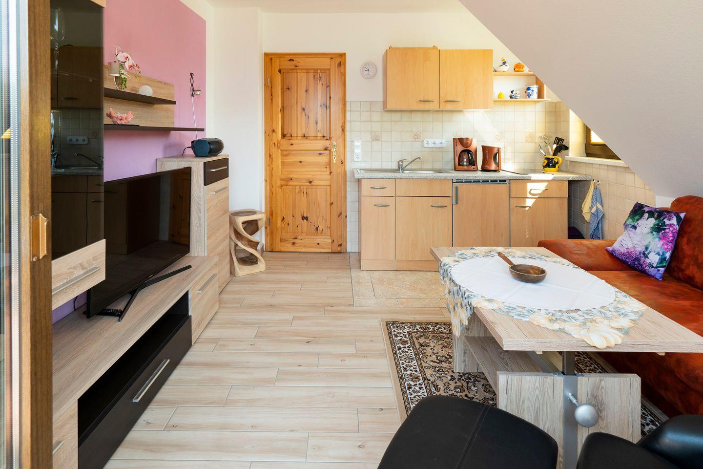 Die Ferienwohnung verfügt über ein gemütliches Schlafzimmer und ein helles, einladendes Wohnzimmer mit einer offenen Küche, die bestens ausgestattet ist, um Ihre Kochkünste zu entfalten. Dank modernen Geräten wie einem Cerankochfeld, Kühlschrank mit Gefrierfach und einer Kaffeemaschine bleiben keine Wünsche offen.