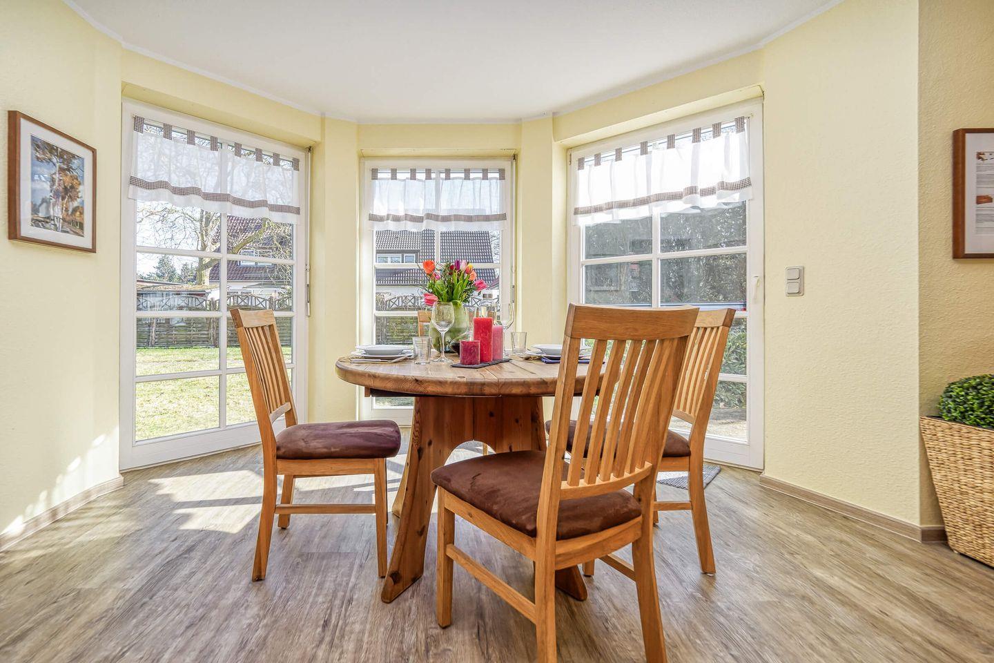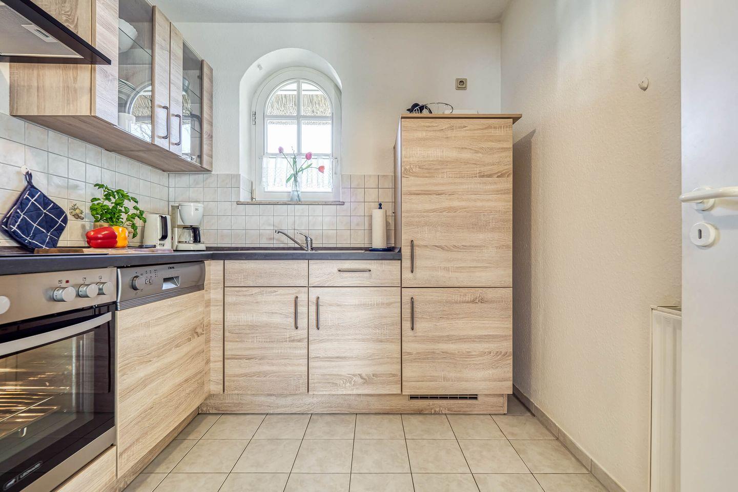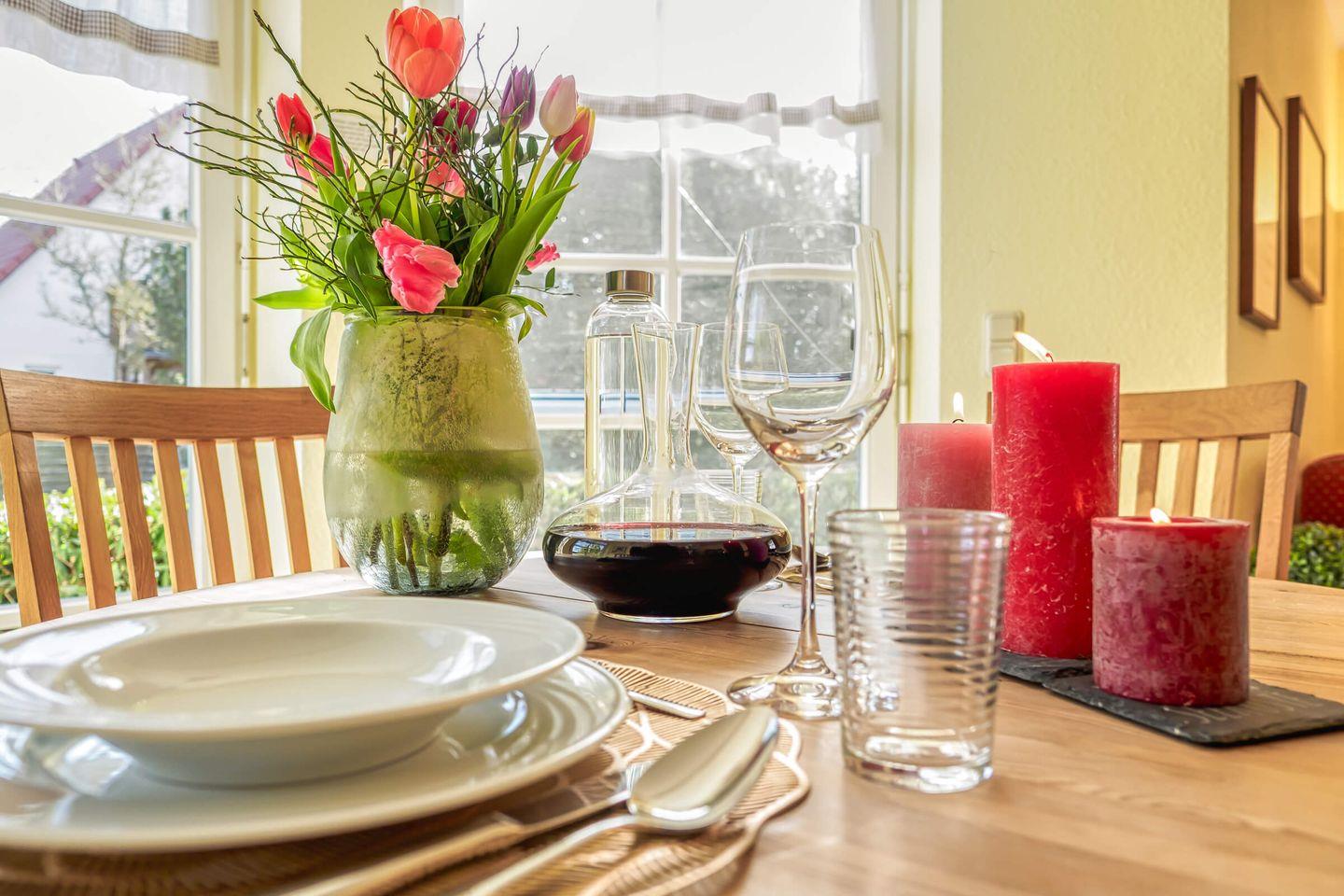 Die gut ausgestattete, geschlossene Küche ist ein weiteres Highlight der Unterkunft. Hier finden Sie alles, was Sie für die Zubereitung eigener Mahlzeiten benötigen, einschließlich eines Ceranfeldes, Backofens, Kühlschranks, Geschirrspülers und zahlreicher Küchenutensilien. Der Essbereich mit einem Esstisch und entsprechenden Stühlen ist ideal für gesellige Abende nach einem erlebnisreichen Tag an der Ostsee.
