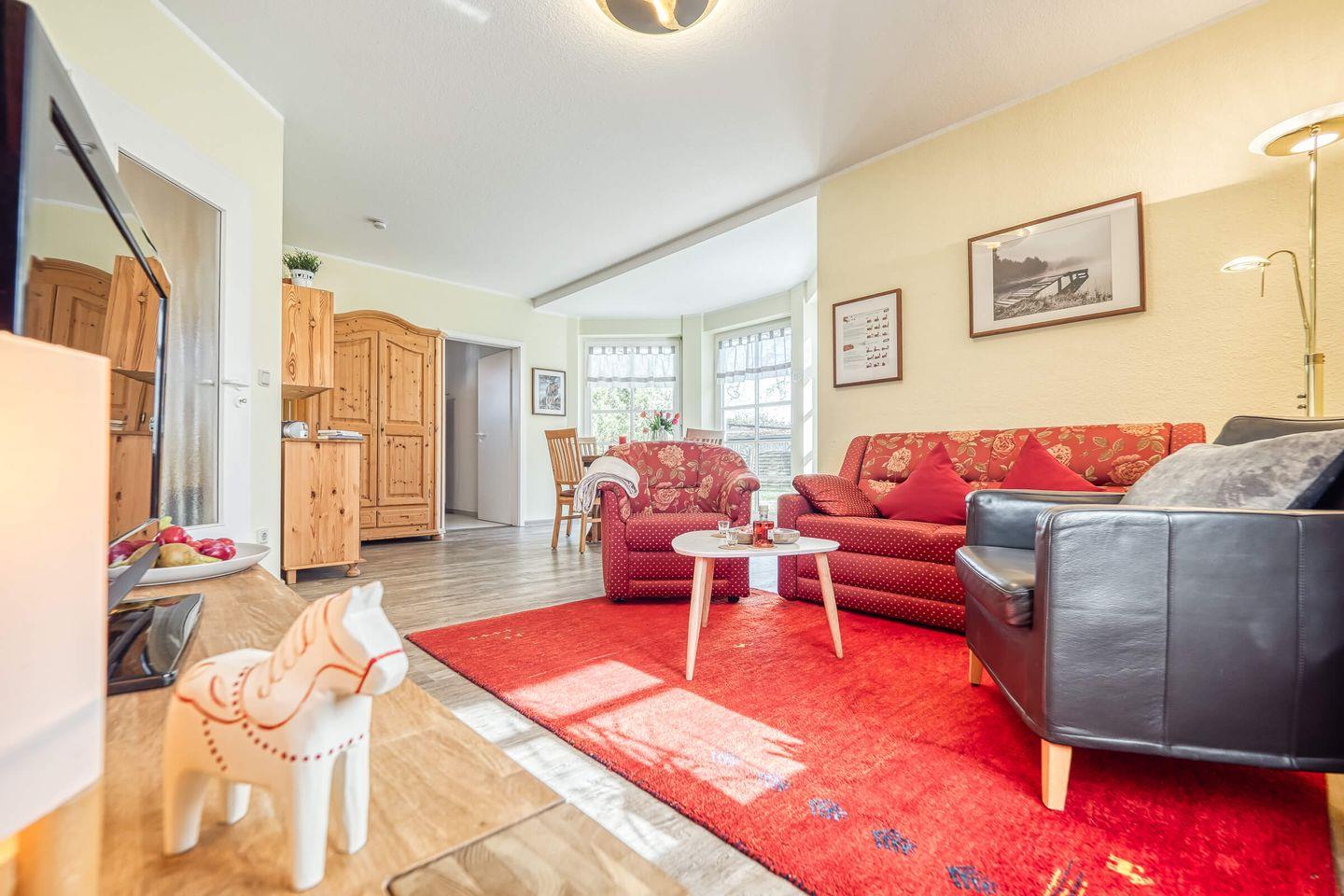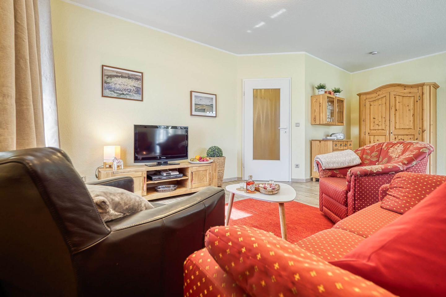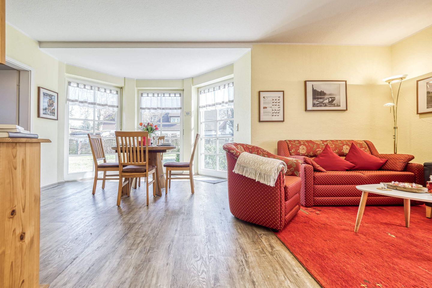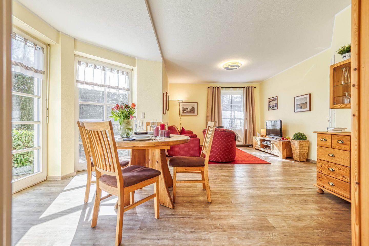 Die Wohnung im Parterre erstreckt sich über 57 m² und bietet ausreichend Platz für bis zu drei Personen. Sie verfügt über ein helles Schlafzimmer, ein gemütliches Wohnzimmer und ein modernes Bad. Im Wohnzimmer lädt ein komfortables Sofa zum Entspannen ein, während der integrierte Essbereich zu gemeinsamen Mahlzeiten einlädt. Für Unterhaltung ist ebenfalls gesorgt: Ein digitaler TV-Anschluss sowie ein Radio stehen zur Verfügung, sodass Sie sich auch in Ihrer Freizeit bestens unterhalten fühlen.