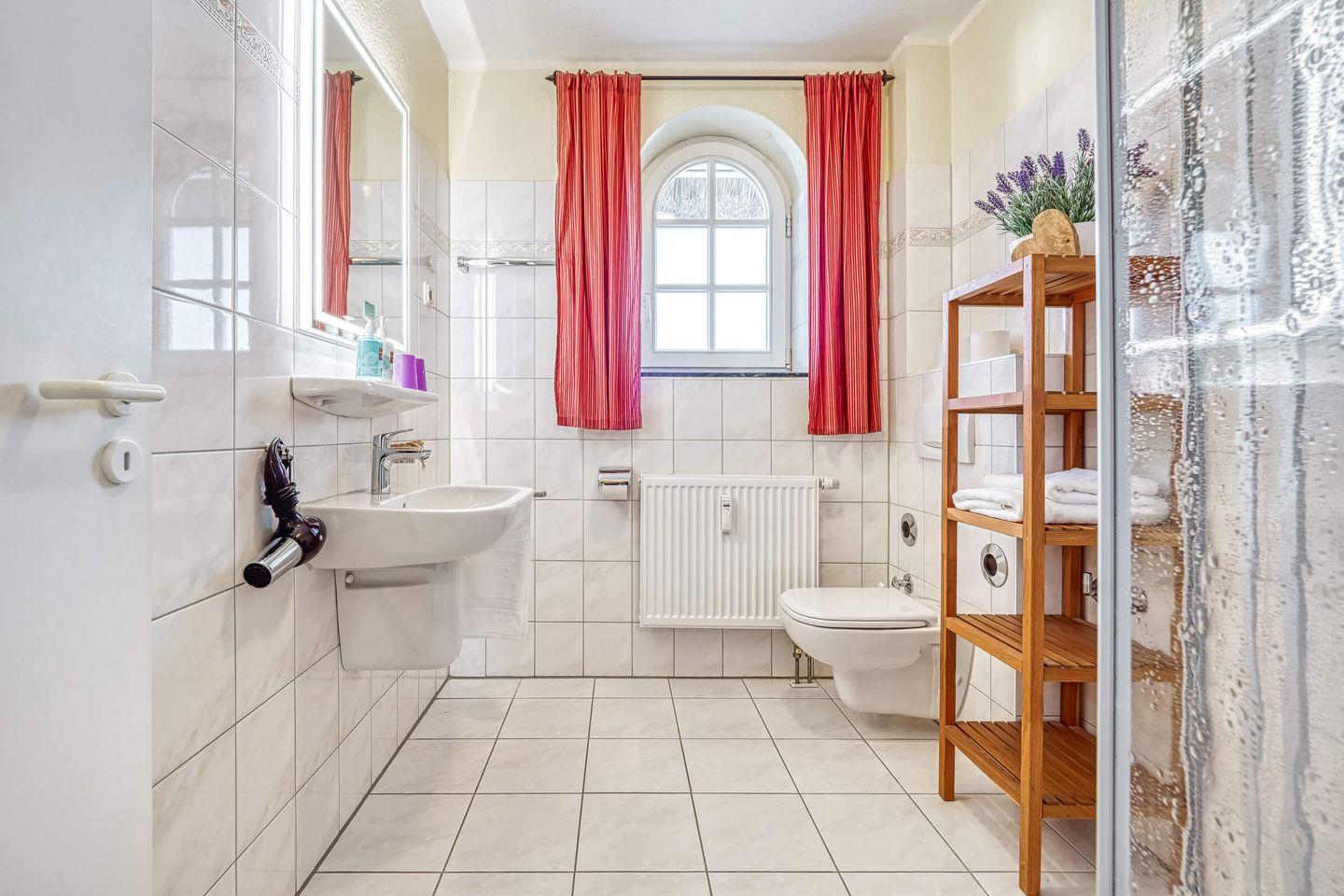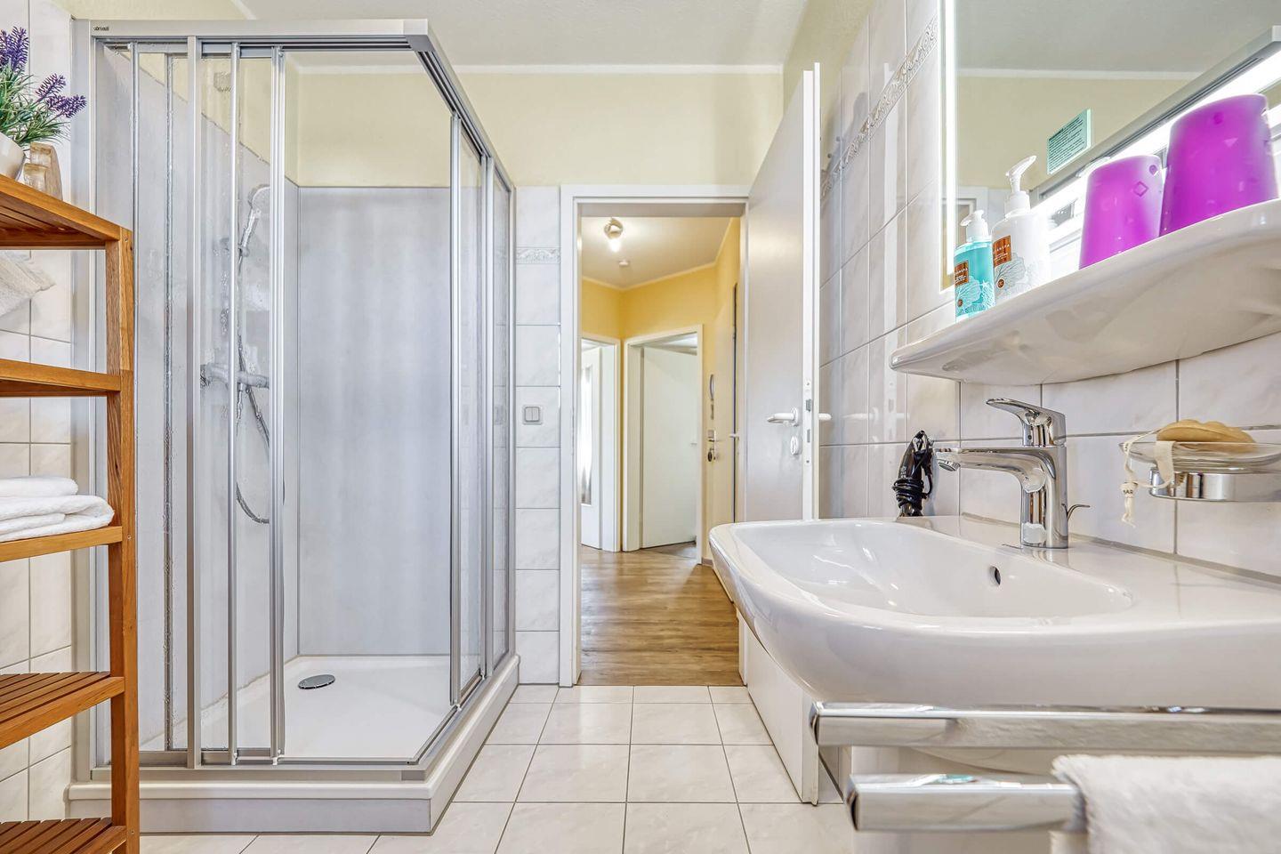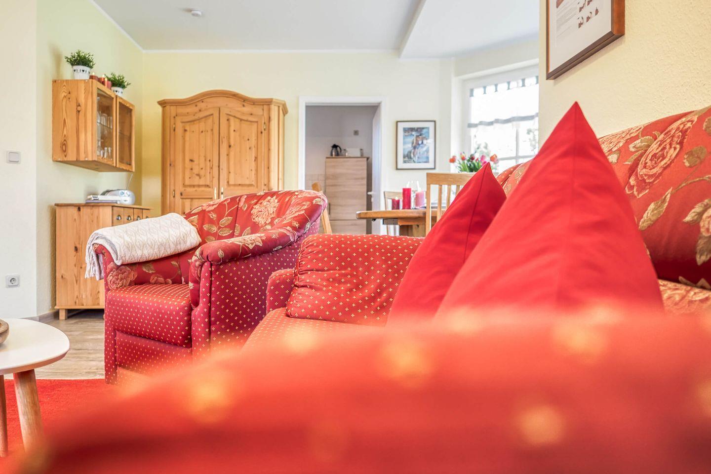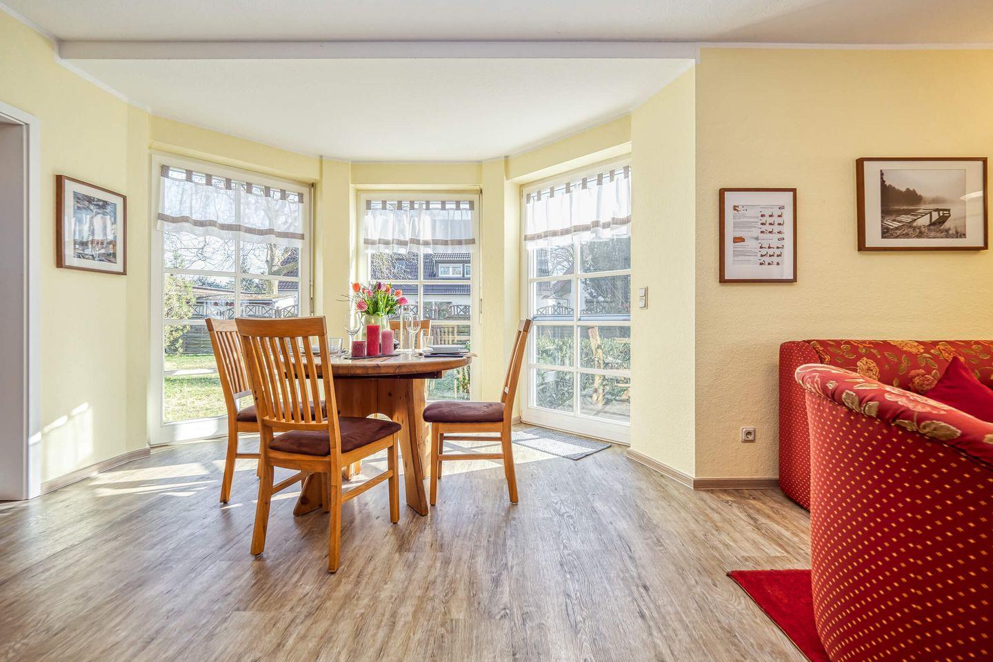 Die Wohnung im Parterre erstreckt sich über 57 m² und bietet ausreichend Platz für bis zu drei Personen. Sie verfügt über ein helles Schlafzimmer, ein gemütliches Wohnzimmer und ein modernes Bad. Im Wohnzimmer lädt ein komfortables Sofa zum Entspannen ein, während der integrierte Essbereich zu gemeinsamen Mahlzeiten einlädt. Für Unterhaltung ist ebenfalls gesorgt: Ein digitaler TV-Anschluss sowie ein Radio stehen zur Verfügung, sodass Sie sich auch in Ihrer Freizeit bestens unterhalten fühlen.