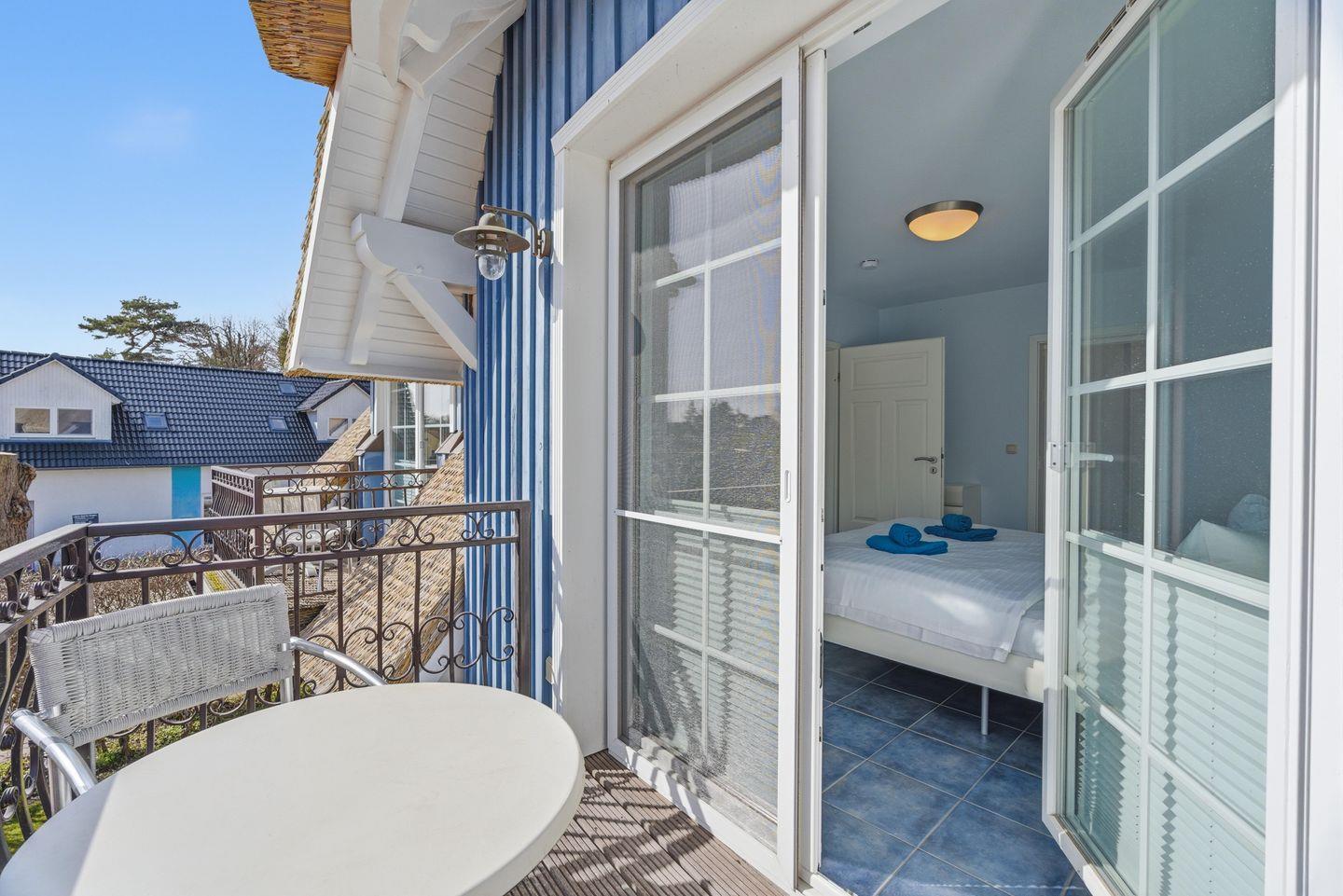 Der private, möblierte Balkon ist mit Gartenmöbeln und Sonnenschirm versehen und bietet somit einen angenehmen Ort zum Entspannen nach einem Tag am Meer oder für das Lesen eines Buchs an der frischen Ostseeluft.