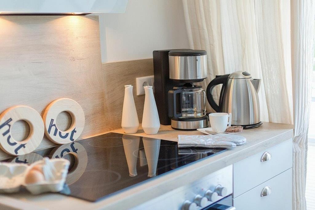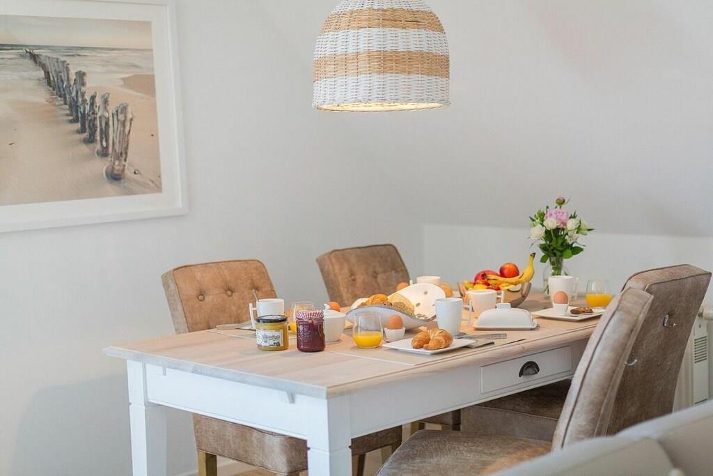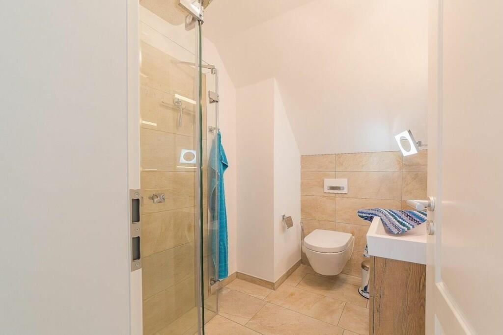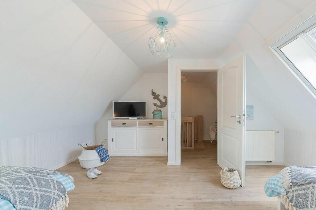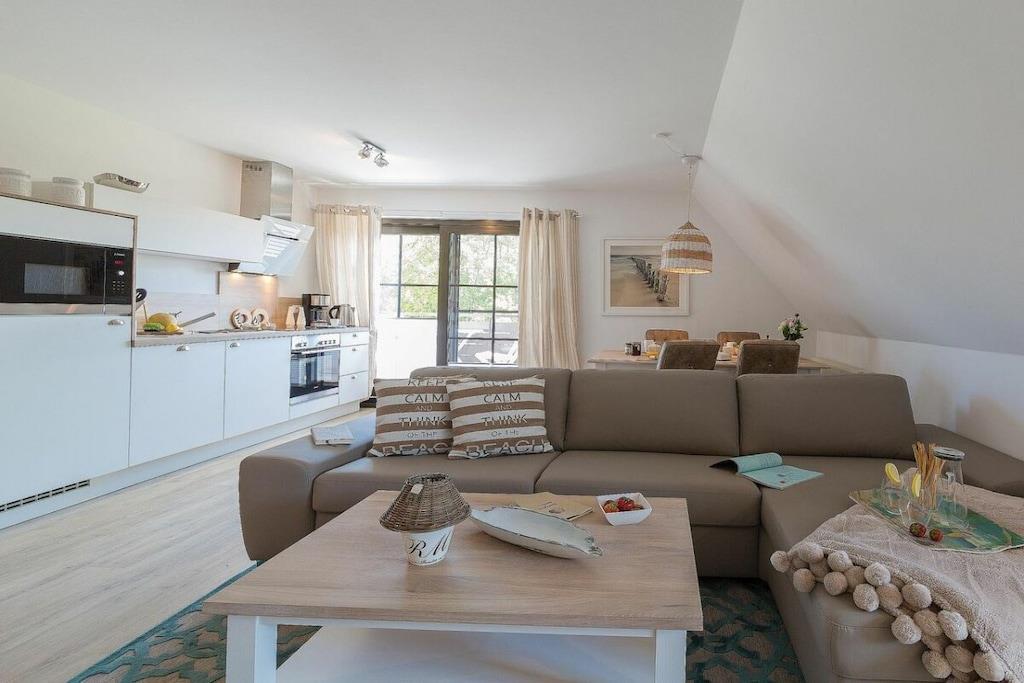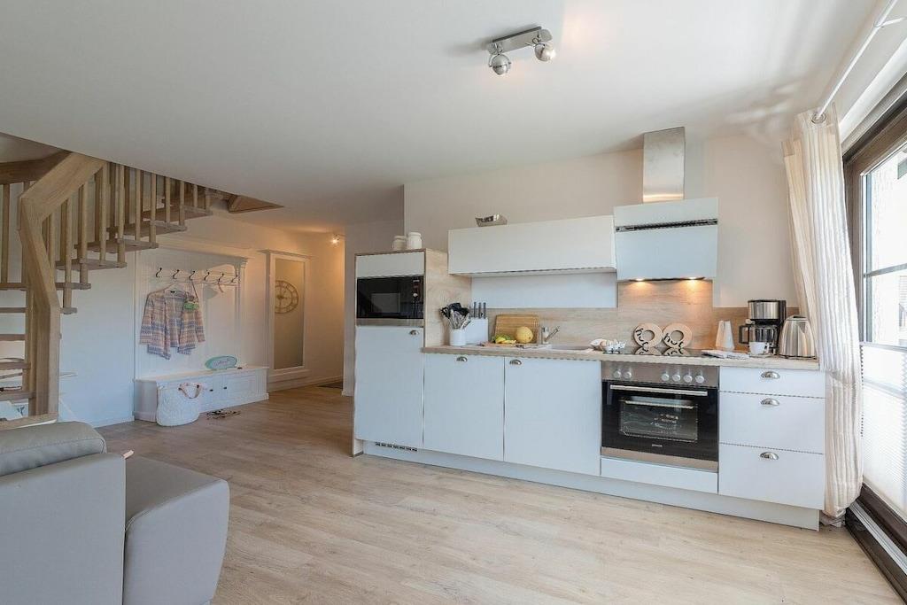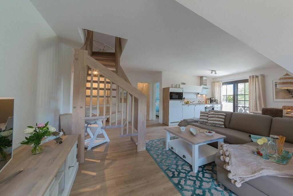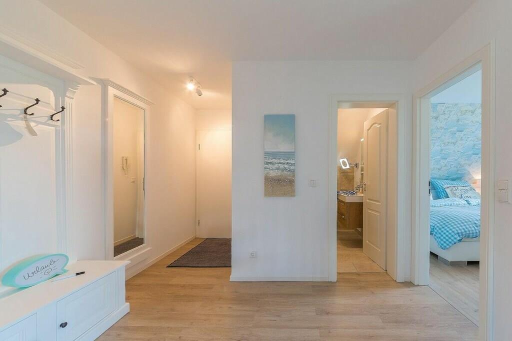 Jeres ferielejlighed måler 66 m² og er en maisonette med en stor balkon, 2 soveværelser, et badeværelse og en stor stue/spisestue med køkken. I kan hænge jeres frakker i gangen. Det moderne badeværelse har bruseniche og gulvvarme. I tilfælde af dårligt vejr har vi en PlayStation med forskellige spil (fodbold, racerløb, Harry Potter, Ringenes Herre osv.) til rådighed for jer og jeres børn. I denne meget elegante lejlighedsbygning med 5 boligenheder er der en vaskemaskine i opbevaringsrummet, som kan benyttes mod et gebyr. Det meste af tiden vil I dog helt sikkert nyde vores hvide, fine sandstrand. Den ligger kun 2 minutter fra jeres bolig. Saunaen er tilgængelig i haven og koster EURO5 pr. halve time.