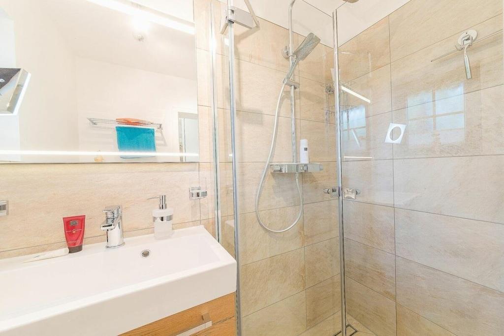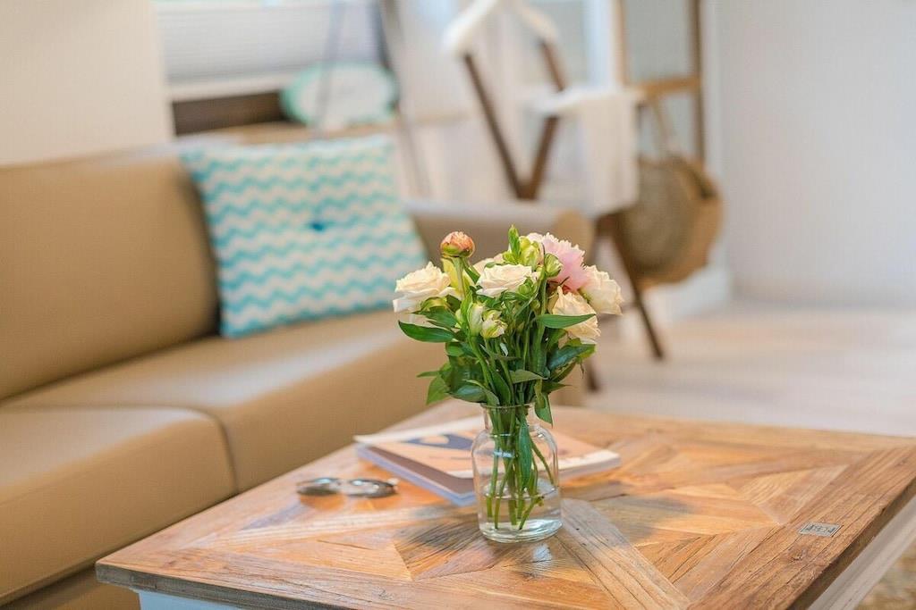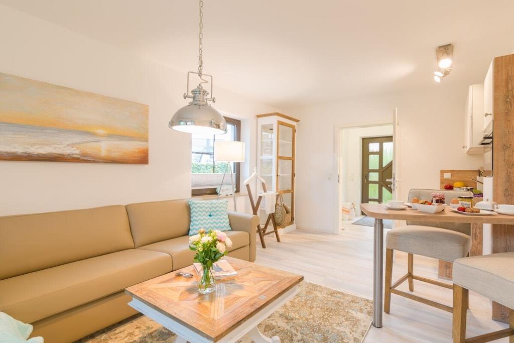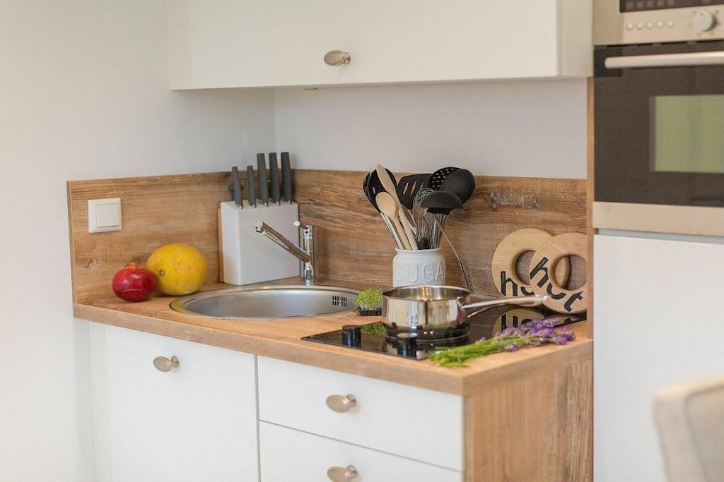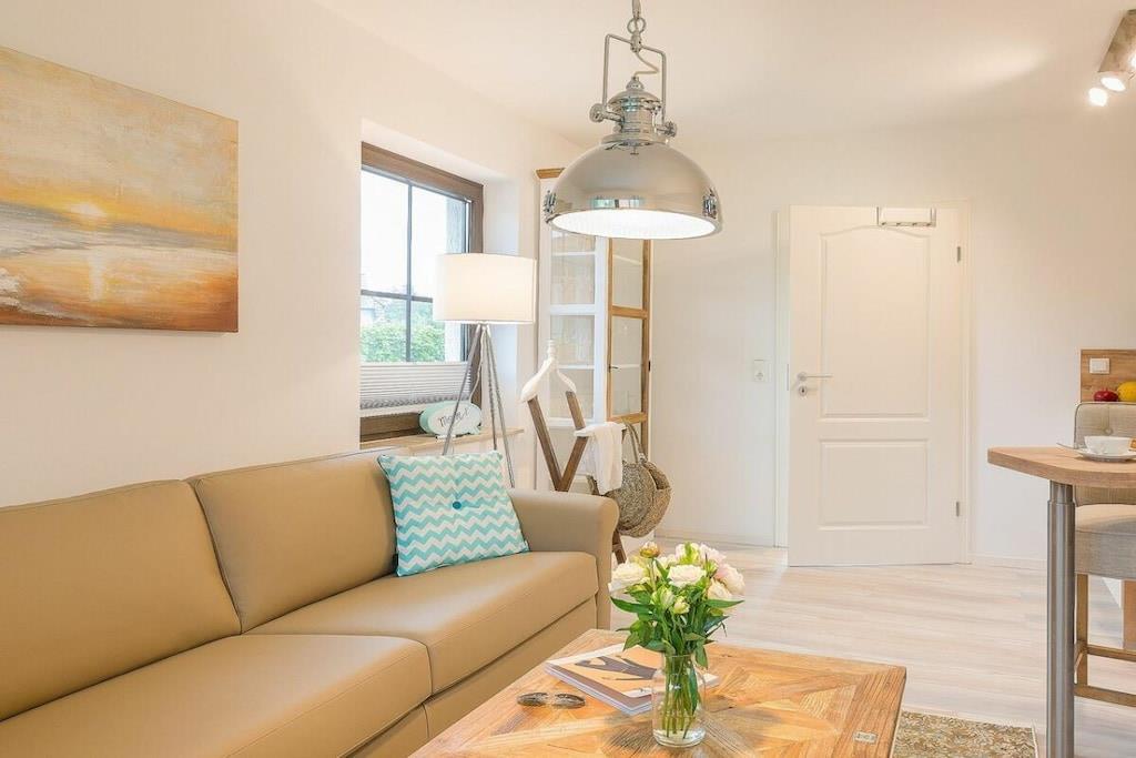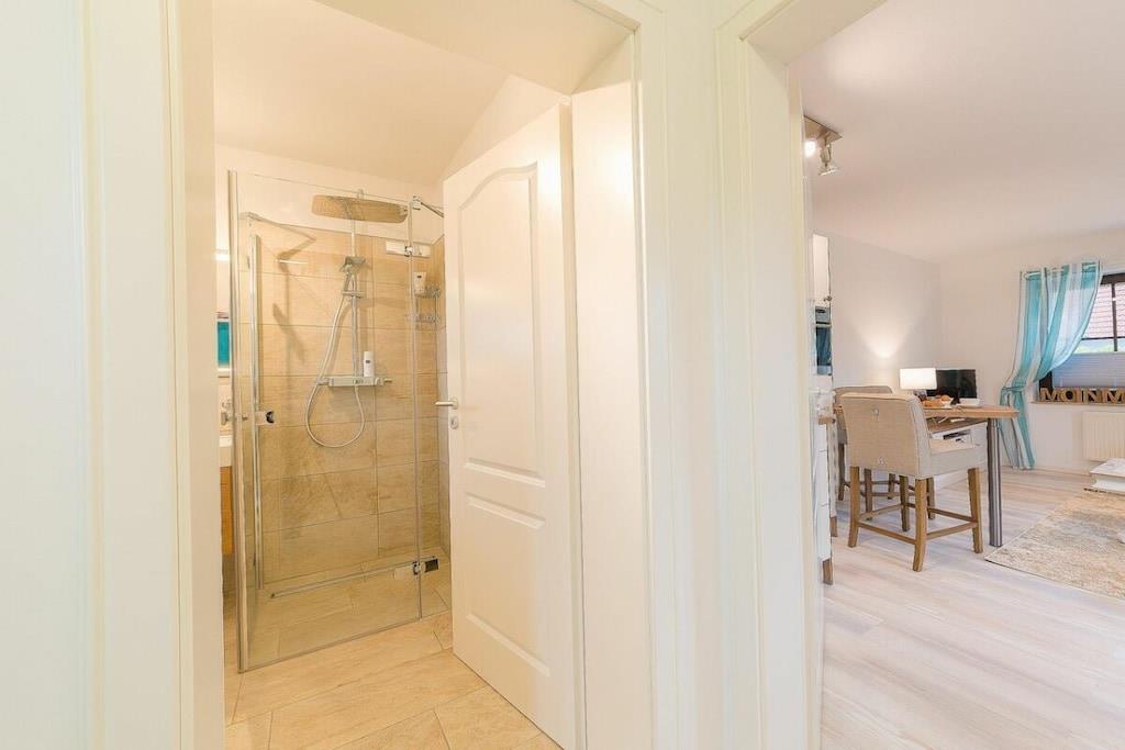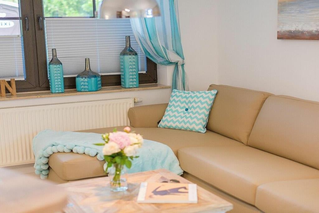 Jeres lejlighed er lille, men perfekt udformet. Meget elegant og nyindrettet, fuldstændig renoveret og hyggelig. Adgangen til stranden er kun omkring 300 meter væk, og byens centrum ligger kun en kort gåtur væk. I har en gang med et stort klædeskab, et badeværelse med bruseniche og et stilfuldt åbent opholds-/spise-/soveområde. Køkkenet er fuldt udstyret bortset fra ovnen og inkluderer endda opvaskemaskine, mikrobølgeovn, komfur og mere. Sovesofaen er en meget komfortabel hotelseng på 160x200 cm med en ortopædisk madras, der sikrer en god nats søvn. Saunaen er tilgængelig i haven og koster EURO5 pr. halve time.
