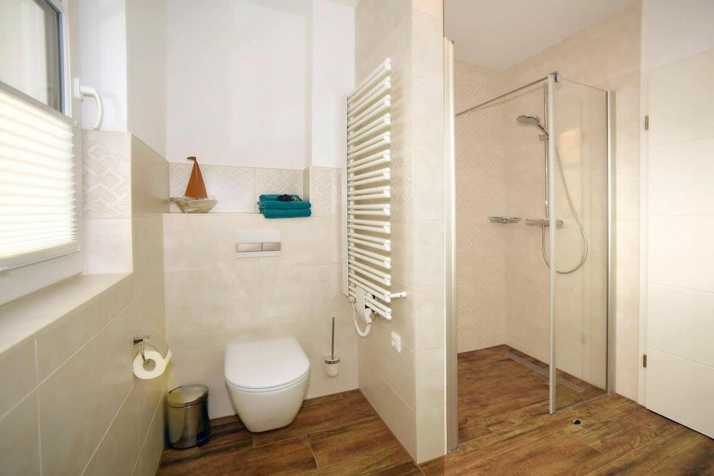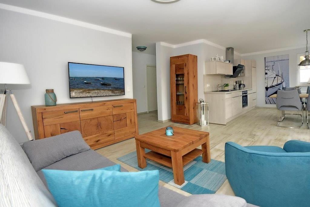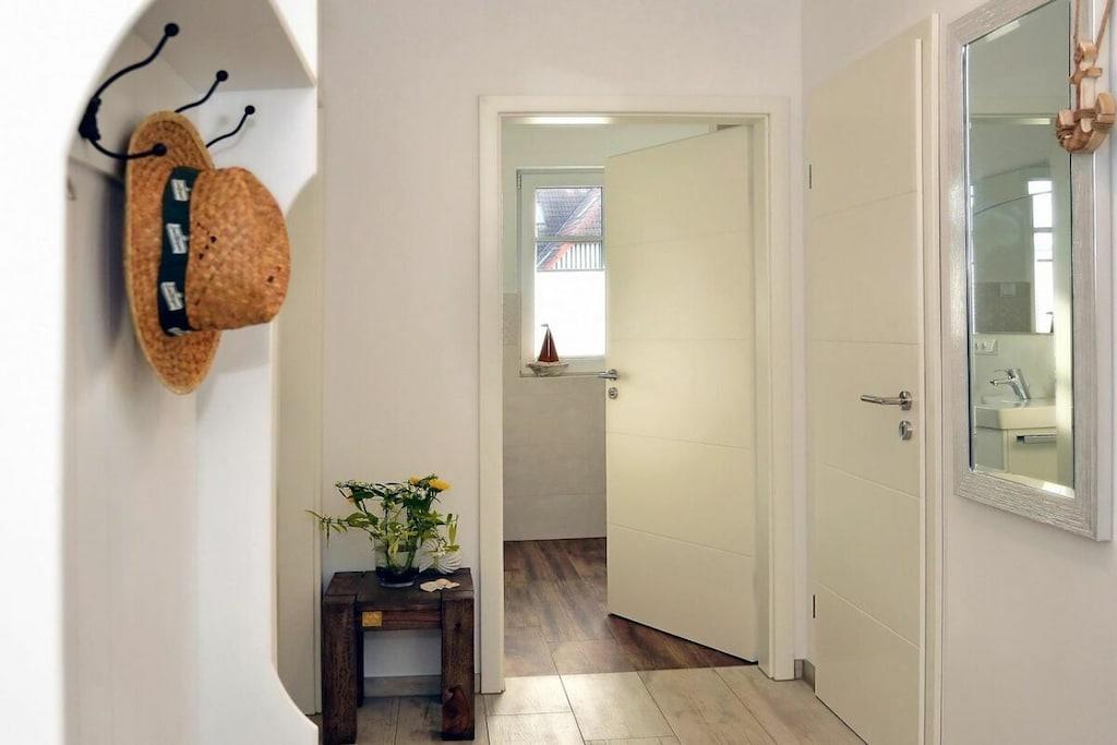 Denne nybyggede, meget lyse ferielejlighed (færdiggjort i november 2018) i centrum af Zingst har to værelser. Soveværelset med sin meget komfortable seng inviterer dig til at drømme. Du finder også et stort klædeskab og et ekstra fladskærms-tv. Gangen med sit klædeskab fører til den moderne, men meget hyggelige stue. Sofaen tilbyder mulighed for en hotelseng i form af en ekstra seng på 170x200. Det lyse, moderne og meget veludstyrede køkken med spiseplads lader intet tilbage at ønske. Det lyse, store badeværelse har en bruseniche og et vindue. Det store håndvaskbord giver plads til dine badeværelsesartikler.