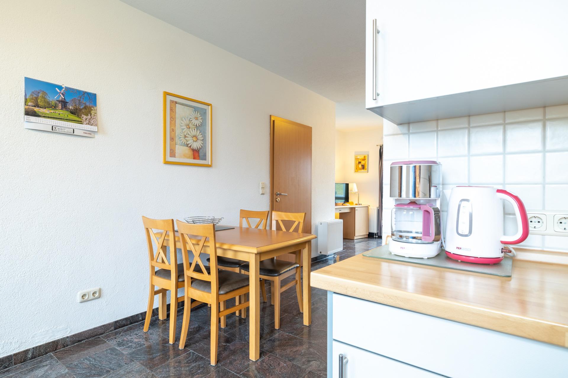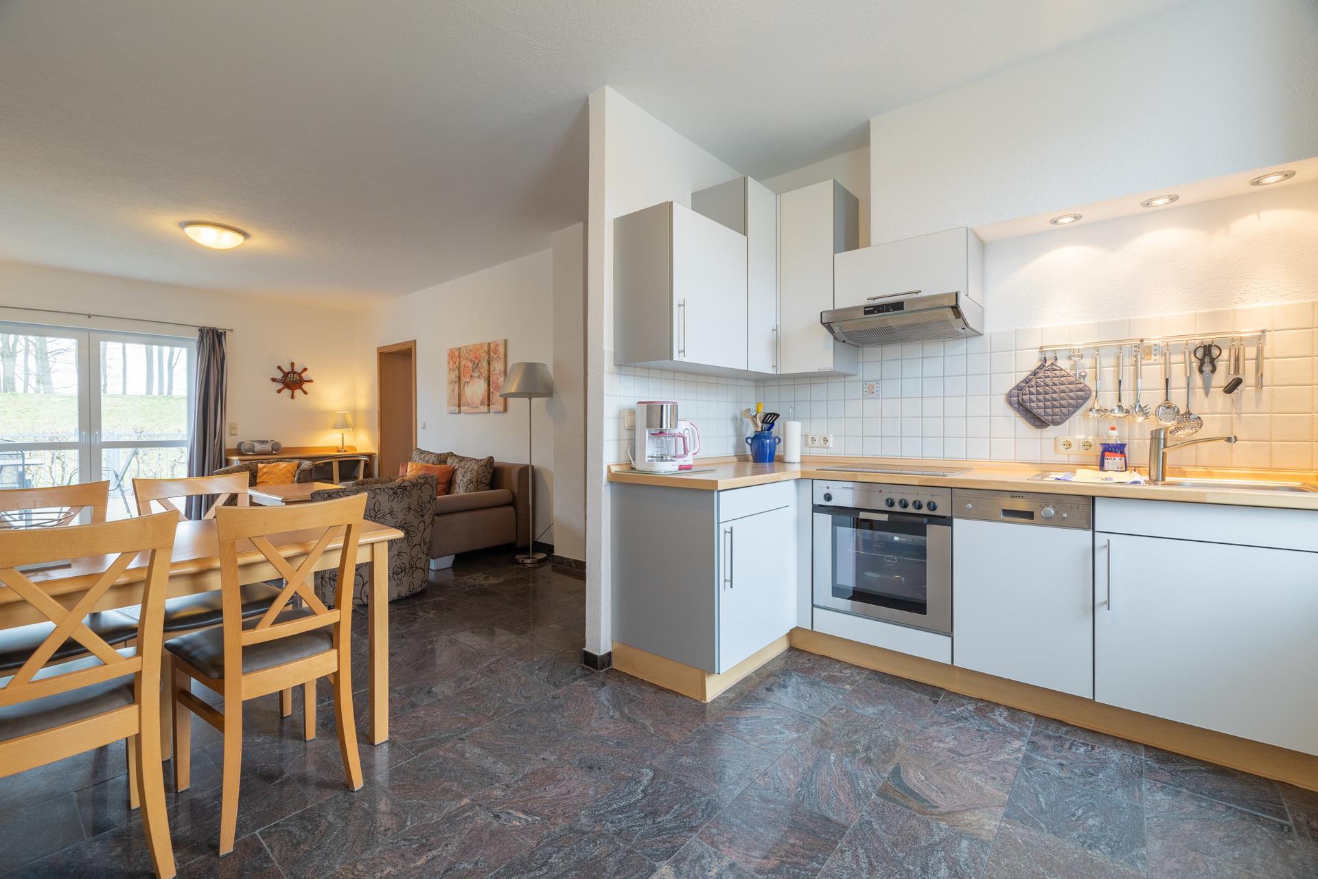 Küche: Offene, voll ausgestattete Küche Herd, Kühlschrank Mikrowelle und Kaffeemaschine. Angrenzender Essbereich mit Platz für 4 Personen.