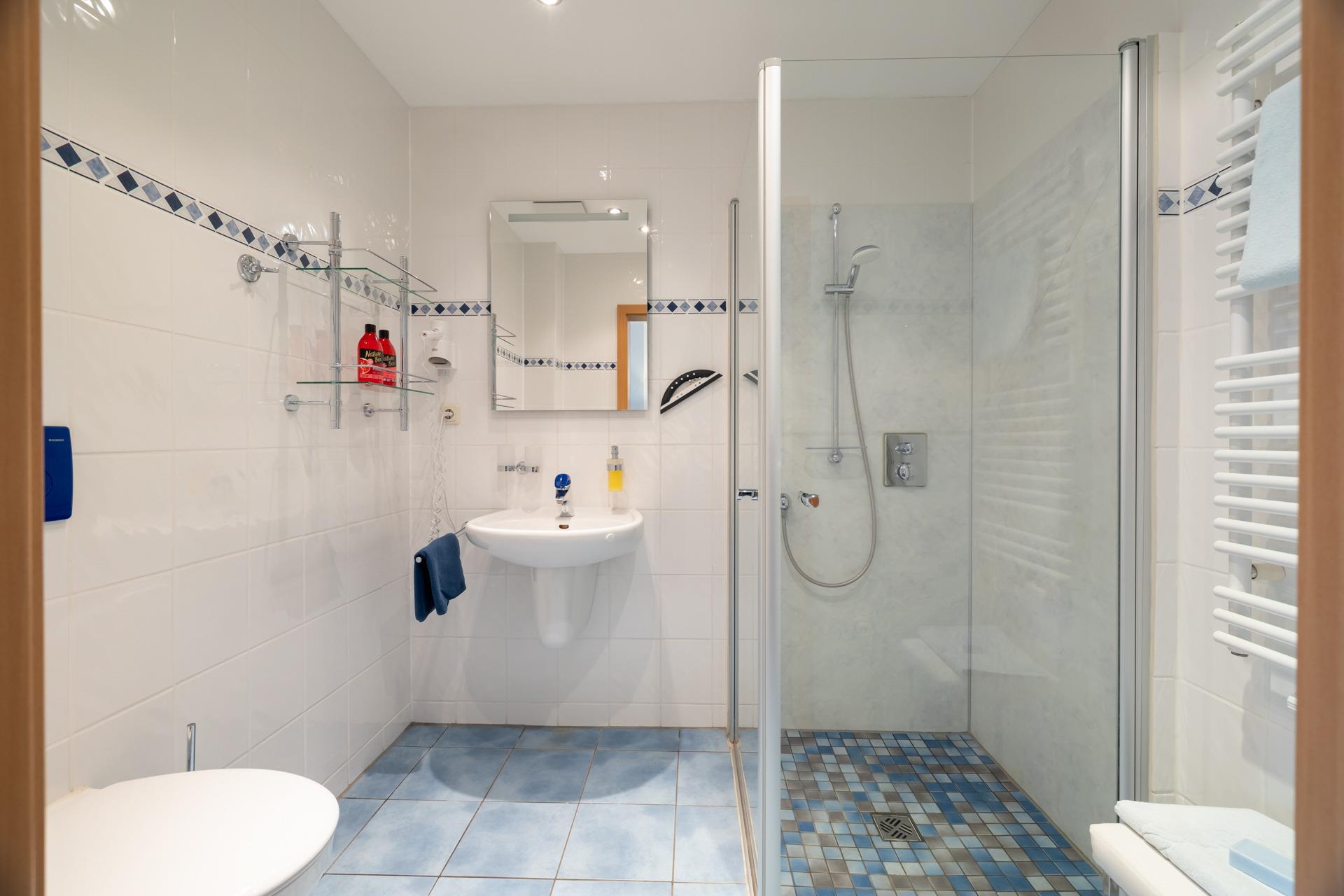 Badezimmer: Modernes Badezimmer mit Dusche, ein Erstausstattungspaket Handtücher sind inkl.