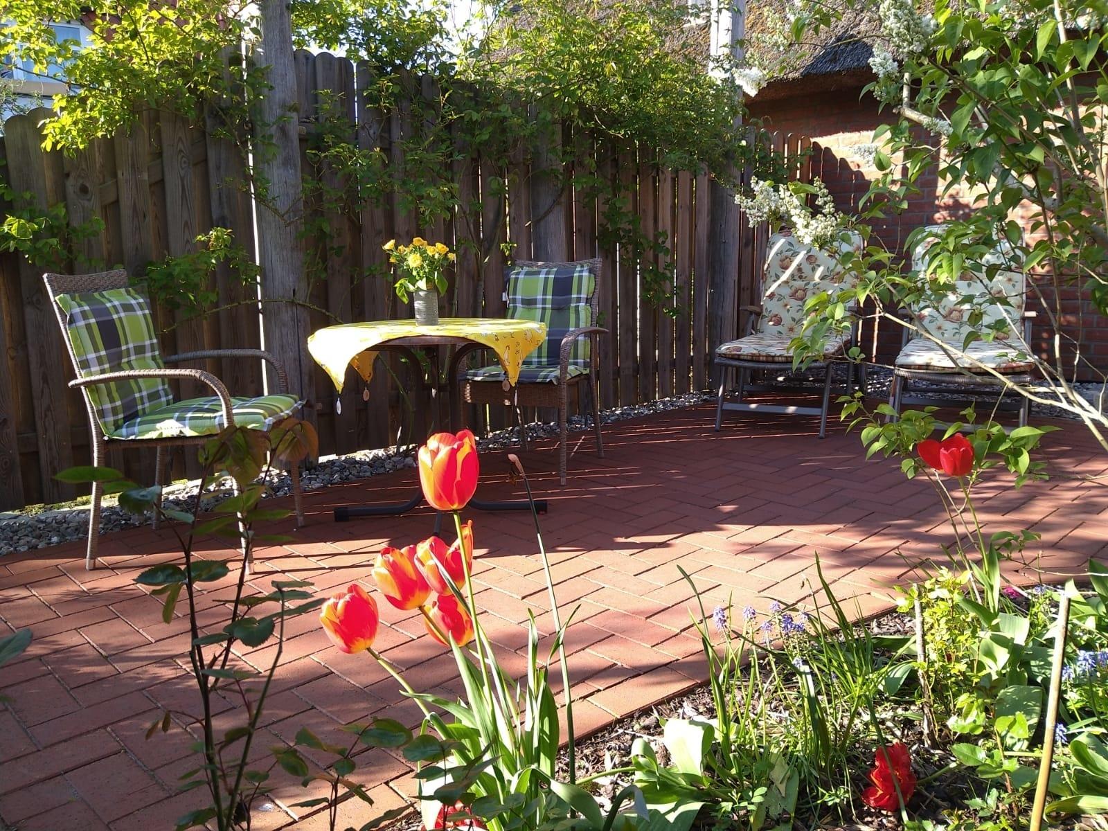 Richtige Urlaubsstimmung kommt auf der schönen Terrasse mit angrenzendem kleinen Garten der Ferienwohnung auf.