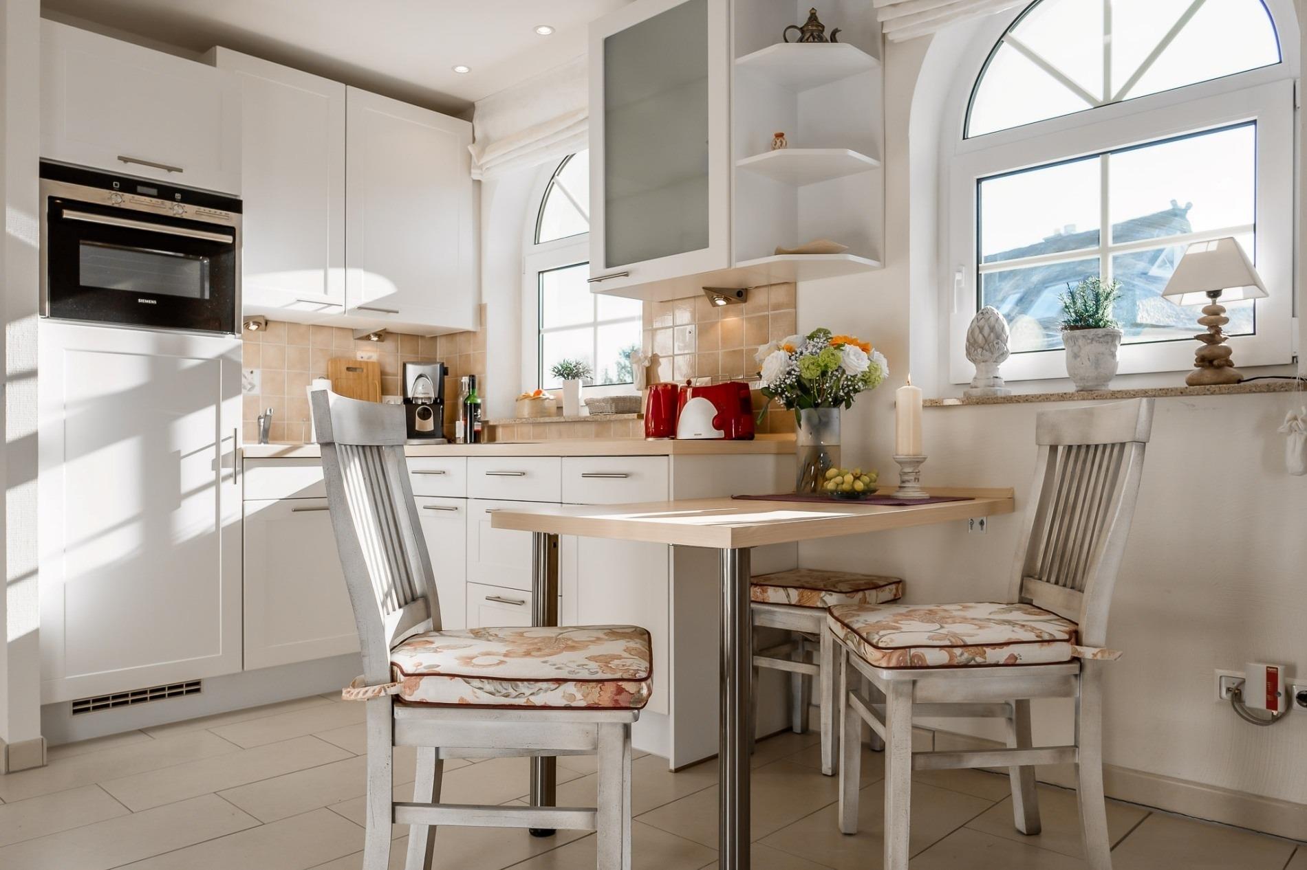 Die gut ausgestattete Küche besitzt unter anderem einen Kühlschrank, einen Herd zum Kochen und sogar eine Spülmaschine.