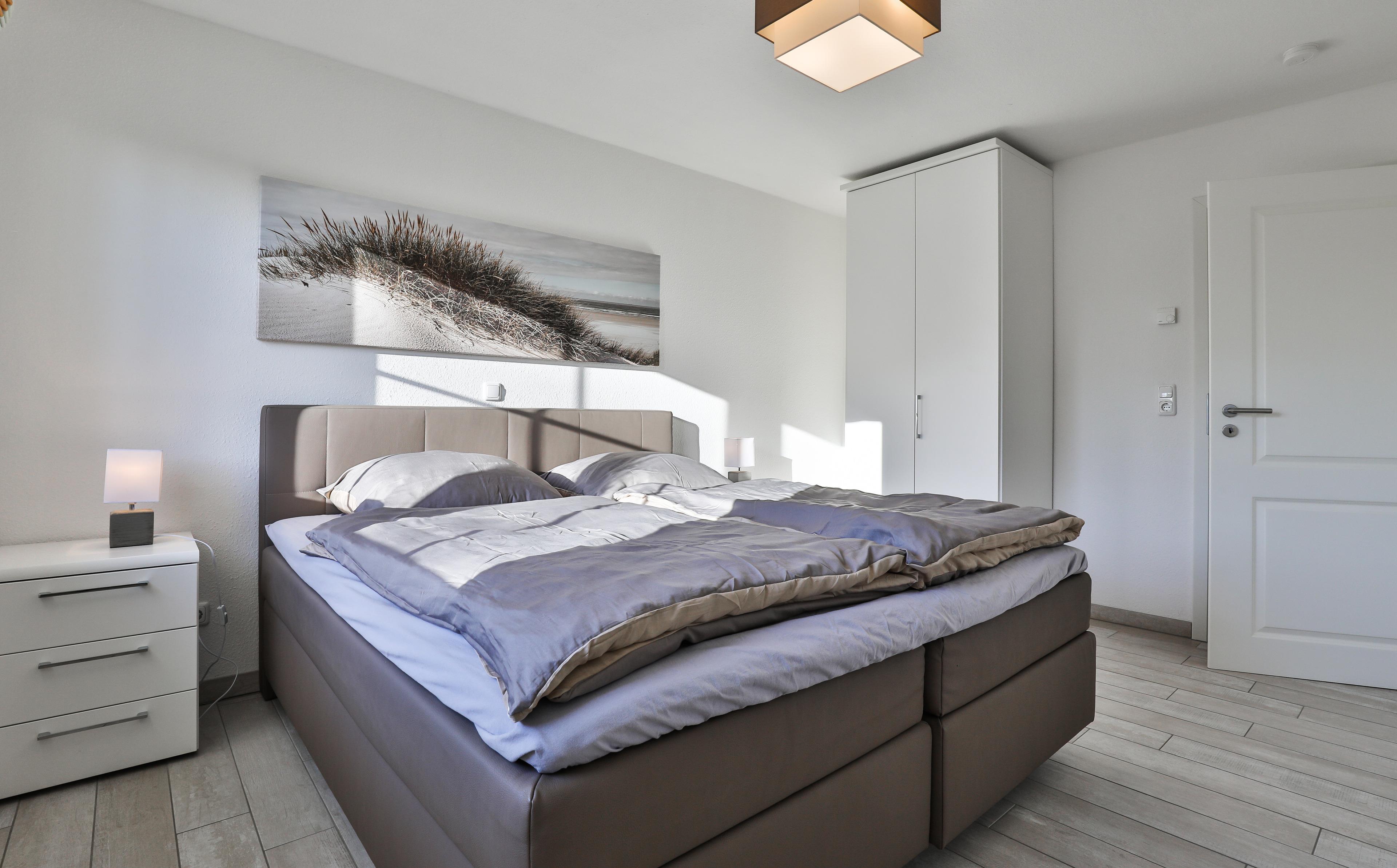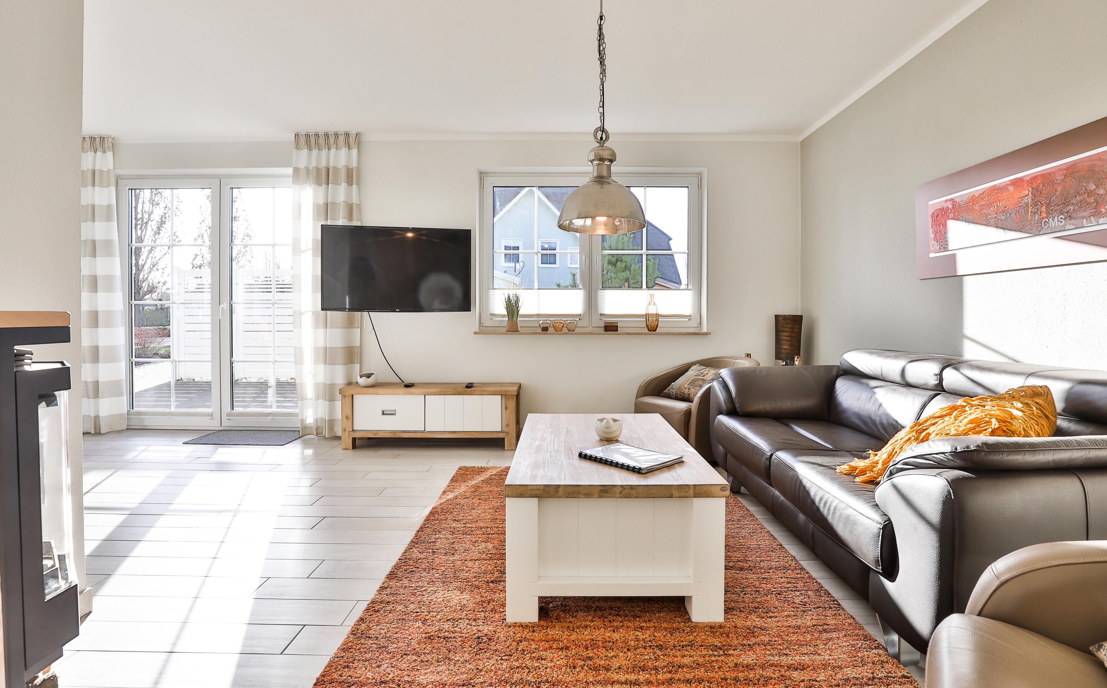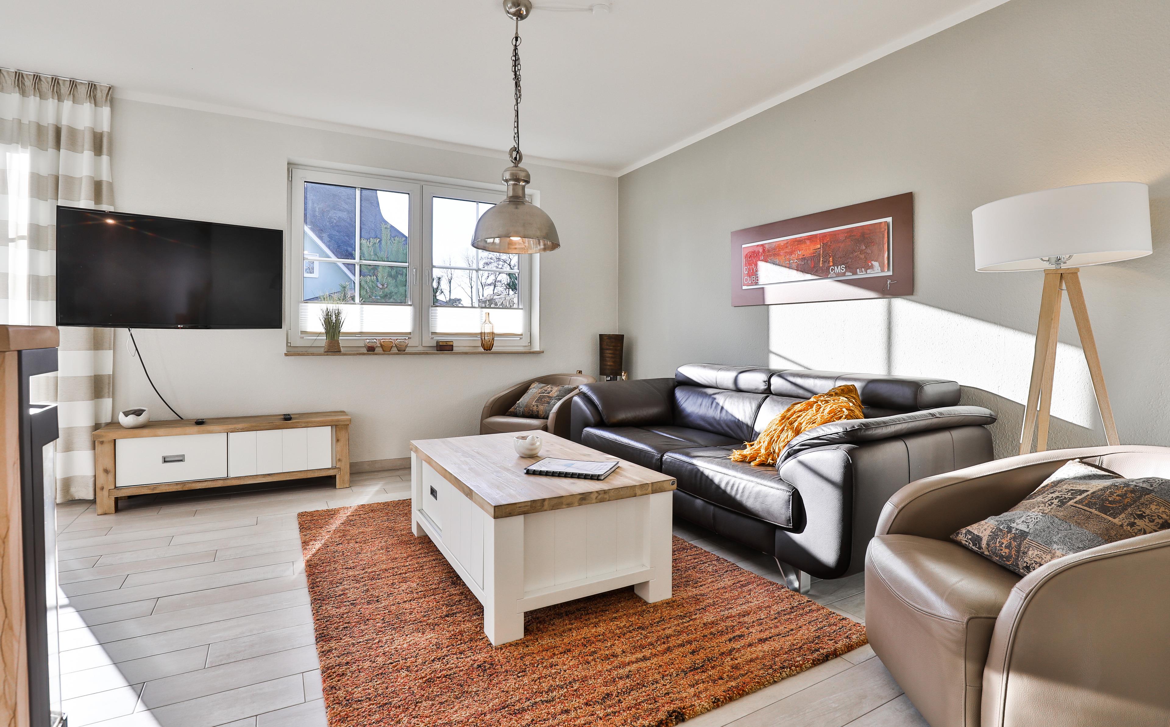 ... und ist ausgestattet mit drei Schlafräumen (1x1 Doppelbett, 1x1 Doppelbett , 1x2 Einzelbetten) jeweils mit zusätzlichen Verdunklungsmöglichkeiten, einem Wohnbereich mit Kamin und einer Küchenzeile (Mikrowelle, Cerankochfeld, Backofen, Kühlschrank mit Gefrierfach, Spülmaschine, Kaffeemaschine), zwei Bädern (1 x bodengleiche Dusche / WC und Sauna,