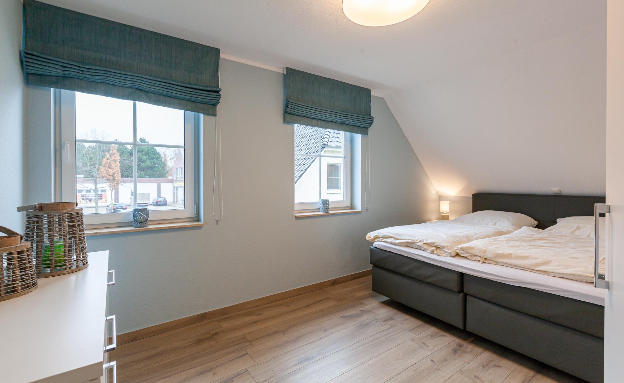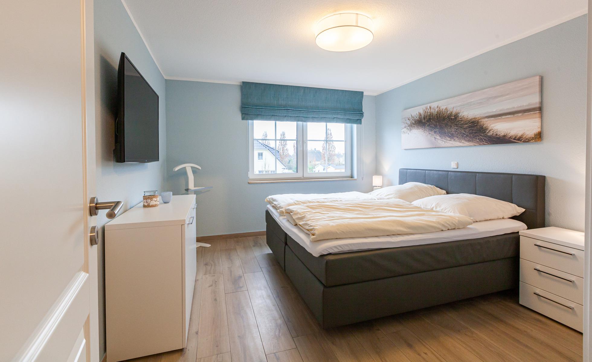 ... und ist ausgestattet mit drei Schlafräumen (1x1 Doppelbett, 1x1 Doppelbett, 1x2 Einzelbetten) jeweils mit zusätzlichen Verdunklungsmöglichkeiten, einem Wohnbereich mit Kamin und einer Küchenzeile (Mikrowelle, Cerankochfeld, Backofen, Kühlschrank mit Gefrierfach, Spülmaschine, Kaffeemaschine), zwei Bädern (1 x bodengleiche Dusche / WC und Sauna,