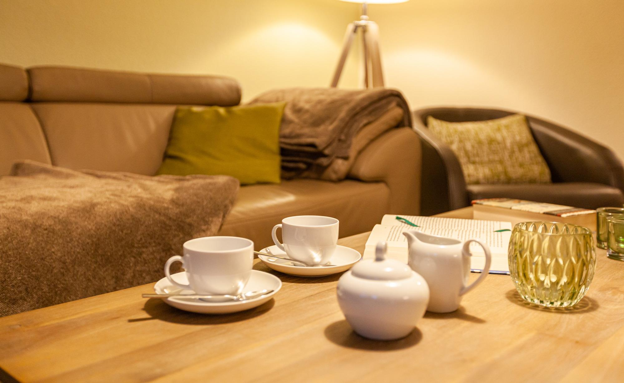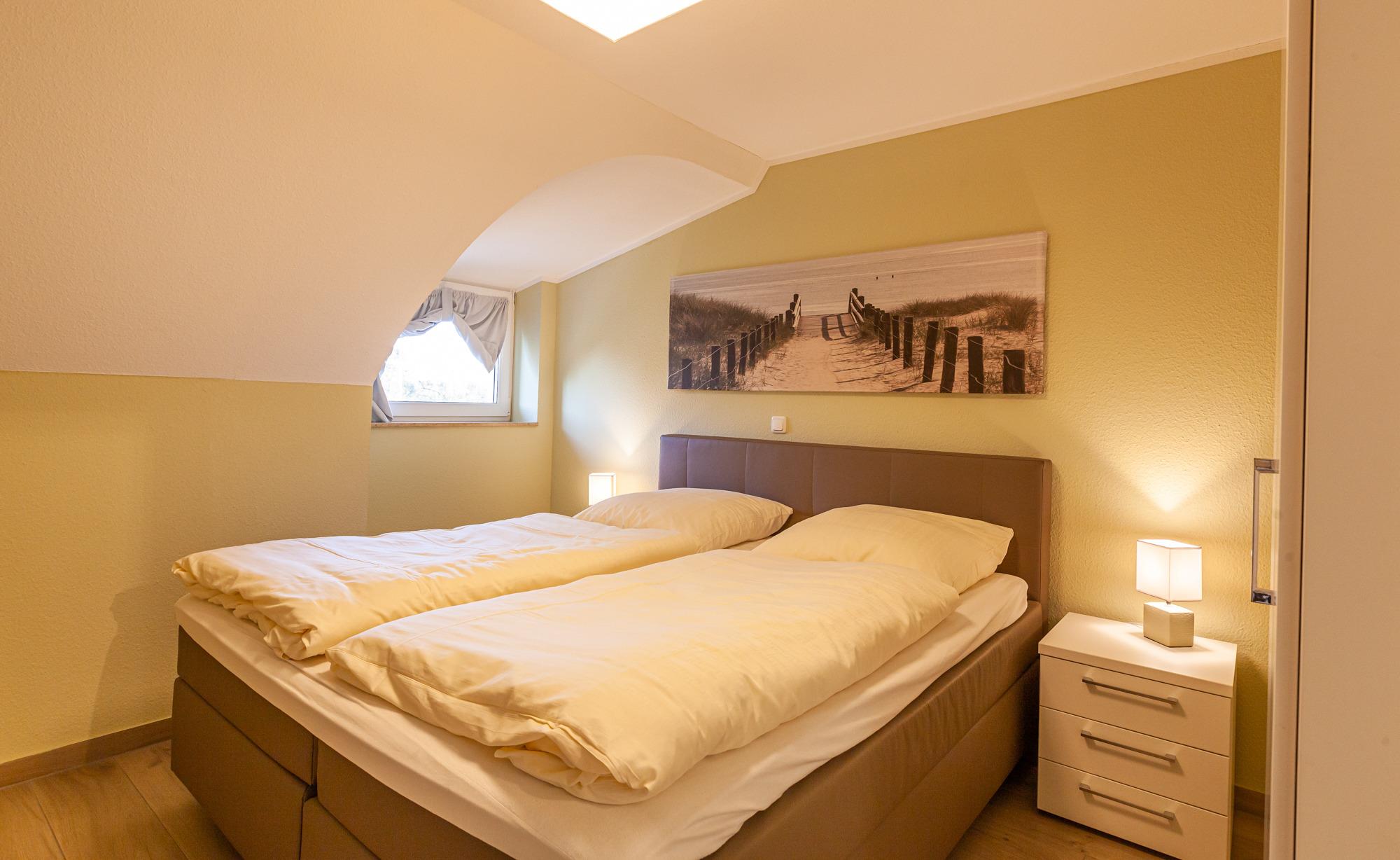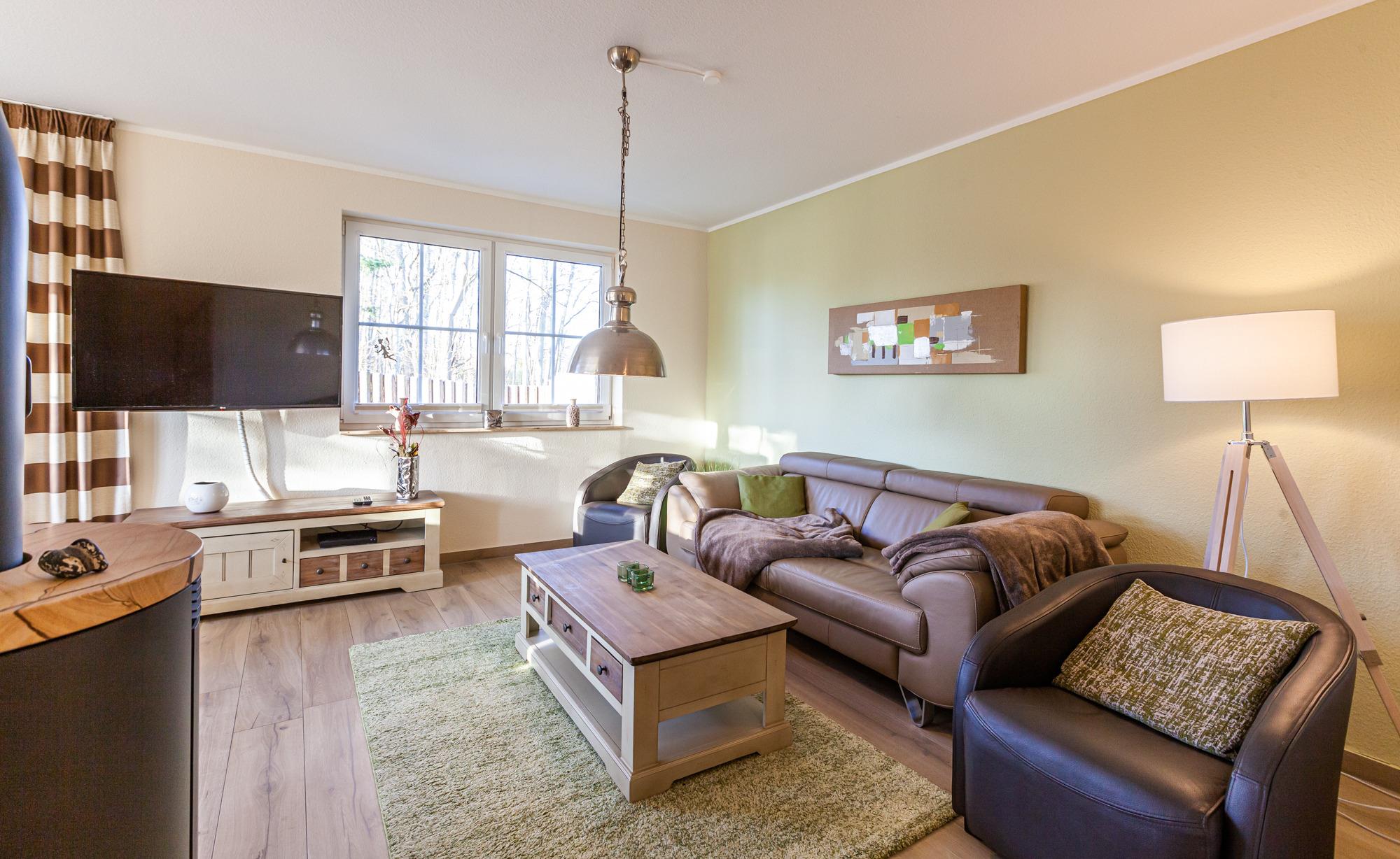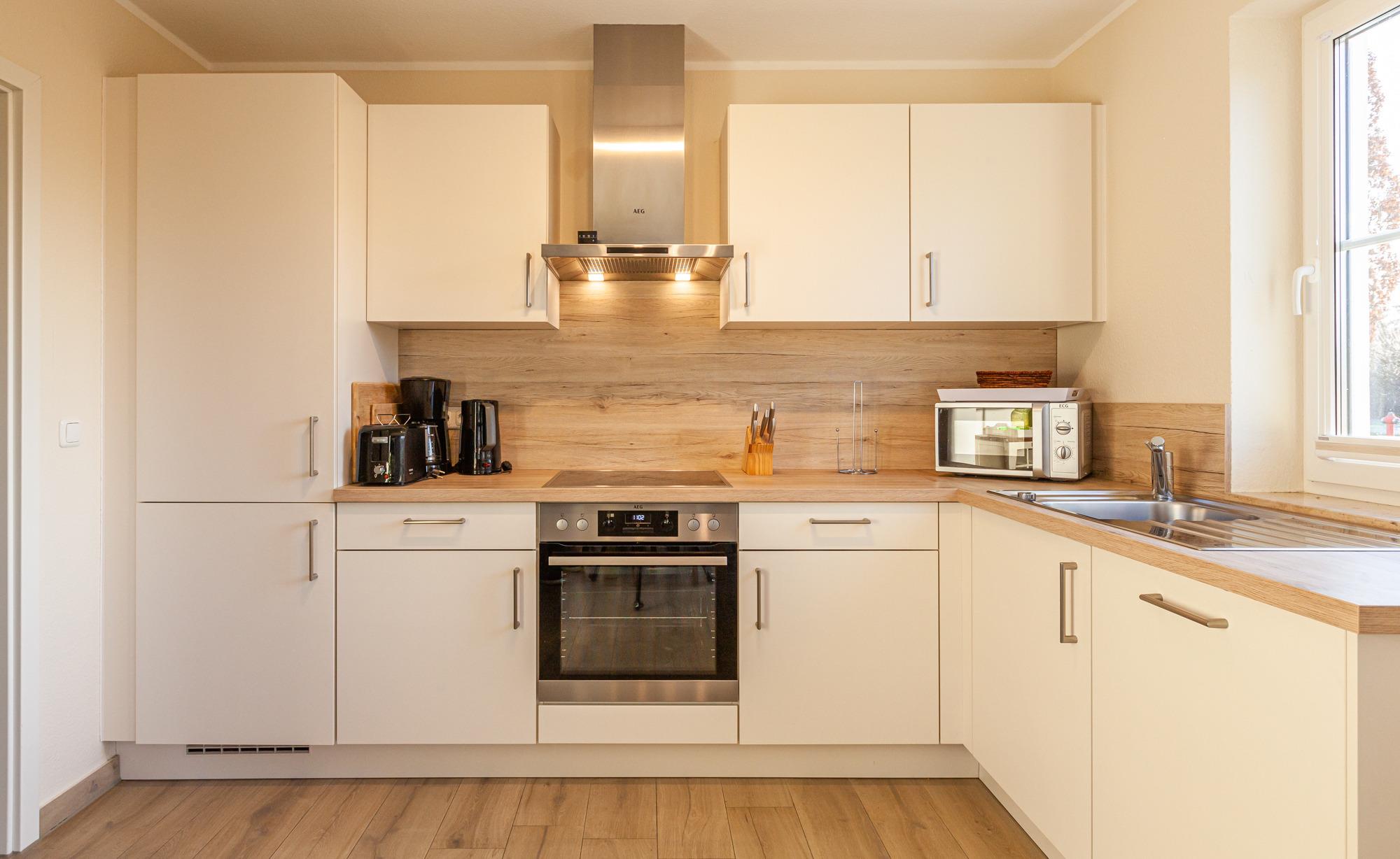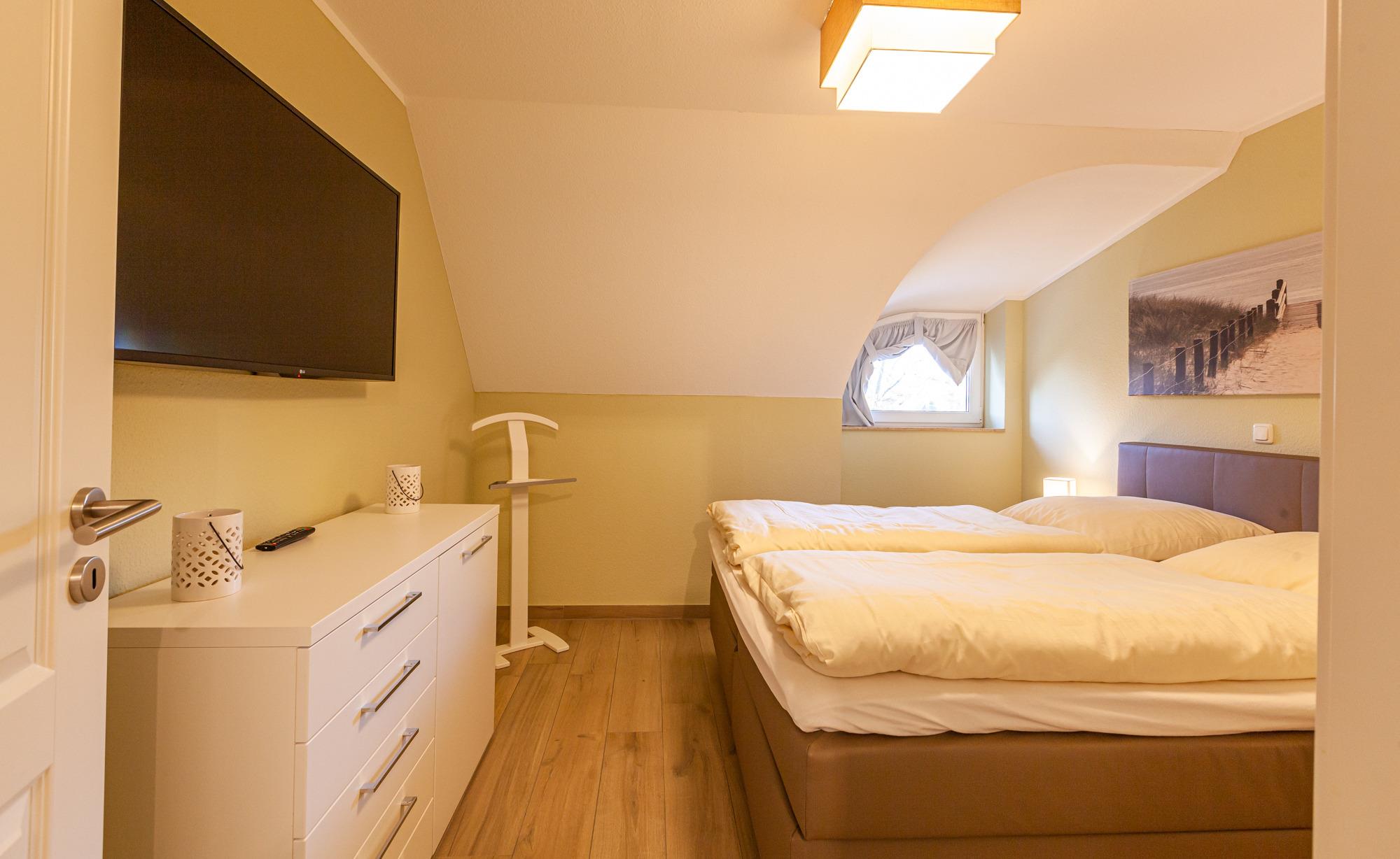 ... und ist ausgestattet mit drei Schlafräumen (1x1 Doppelbett, 1x1 Doppelbett, 1x2 Einzelbetten) jeweils mit zusätzlichen Verdunklungsmöglichkeiten, einem Wohnbereich mit Kamin und einer Küchenzeile (Mikrowelle, Cerankochfeld, Backofen, Kühlschrank mit Gefrierfach, Spülmaschine, Kaffeemaschine), zwei Bädern (1 x bodengleiche Dusche / WC und Sauna,
