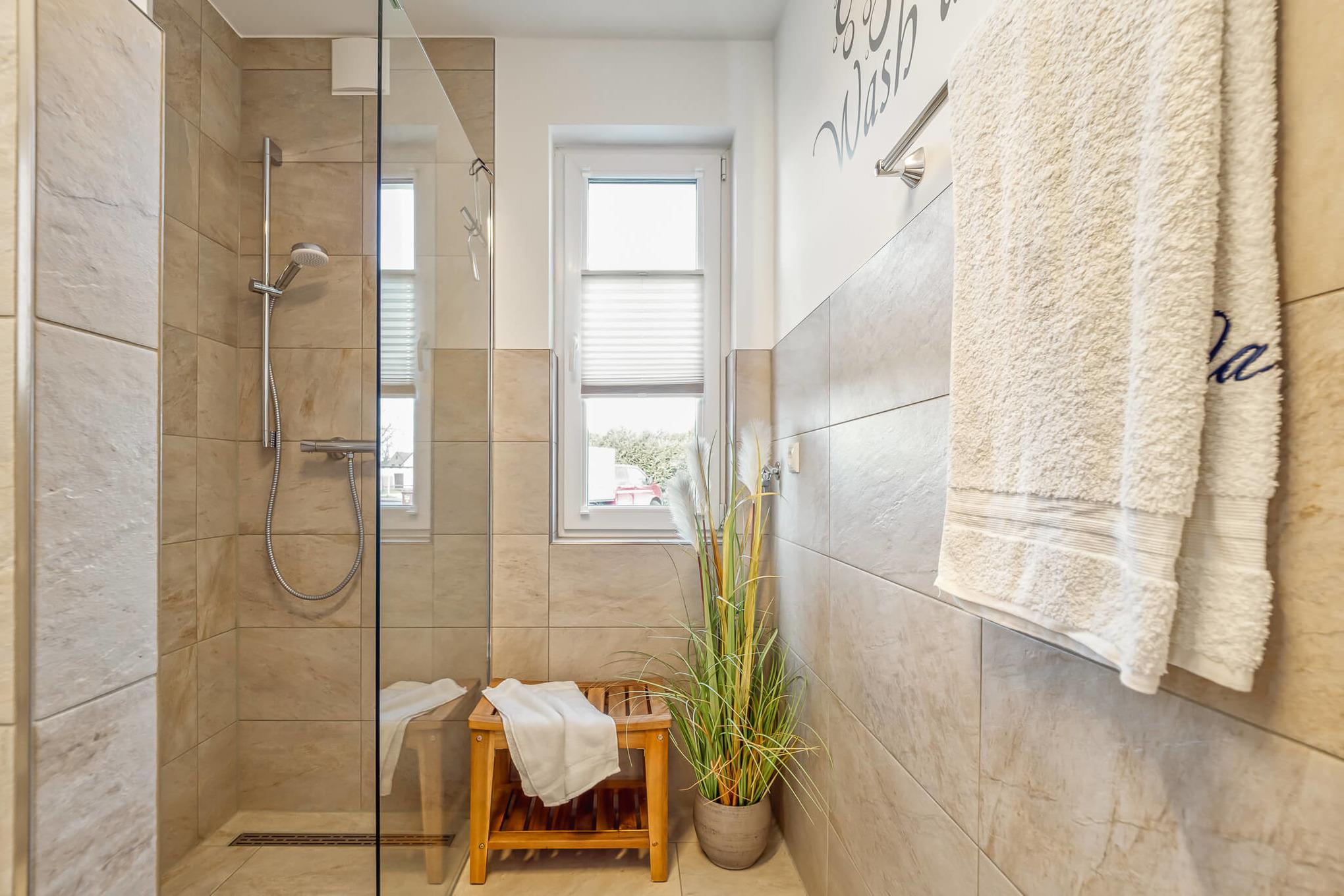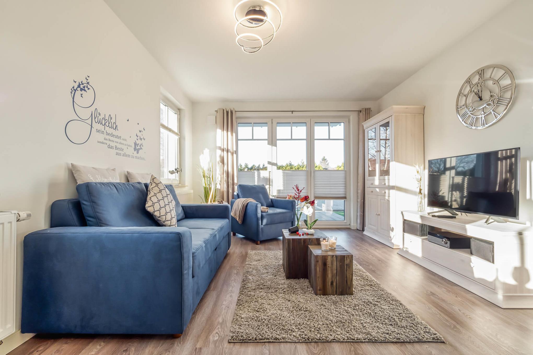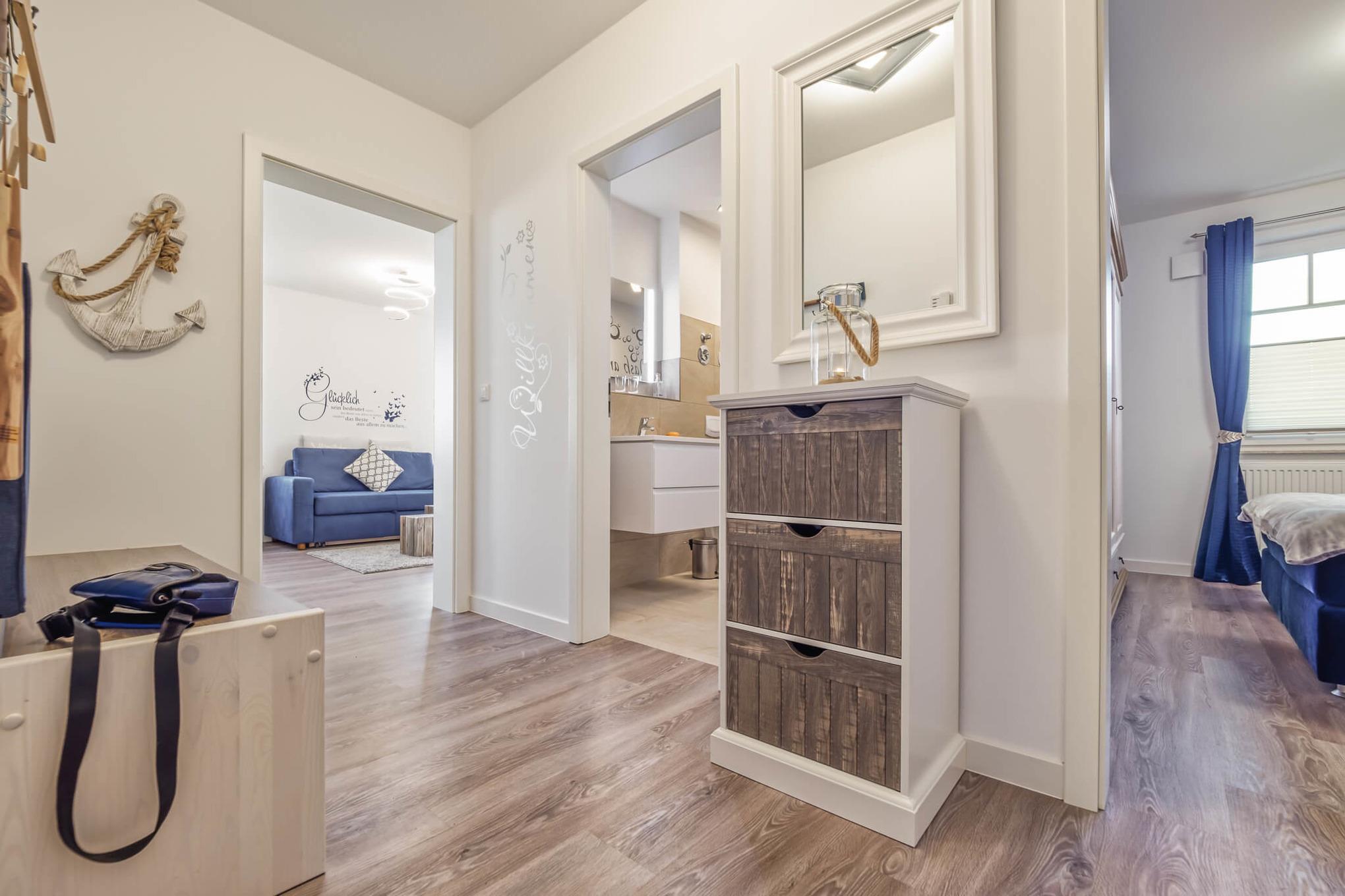 Die Ferienwohnung verfügt über einen Wohnraum mit angrenzendem Ess- und Küchenbereich, einem Bad mit ebenerdiger Dusche sowie einem Schlafzimmer mit Boxspringbett und TV. Bei Bedarf können Handtücher und Bettwäsche angemietet werden.