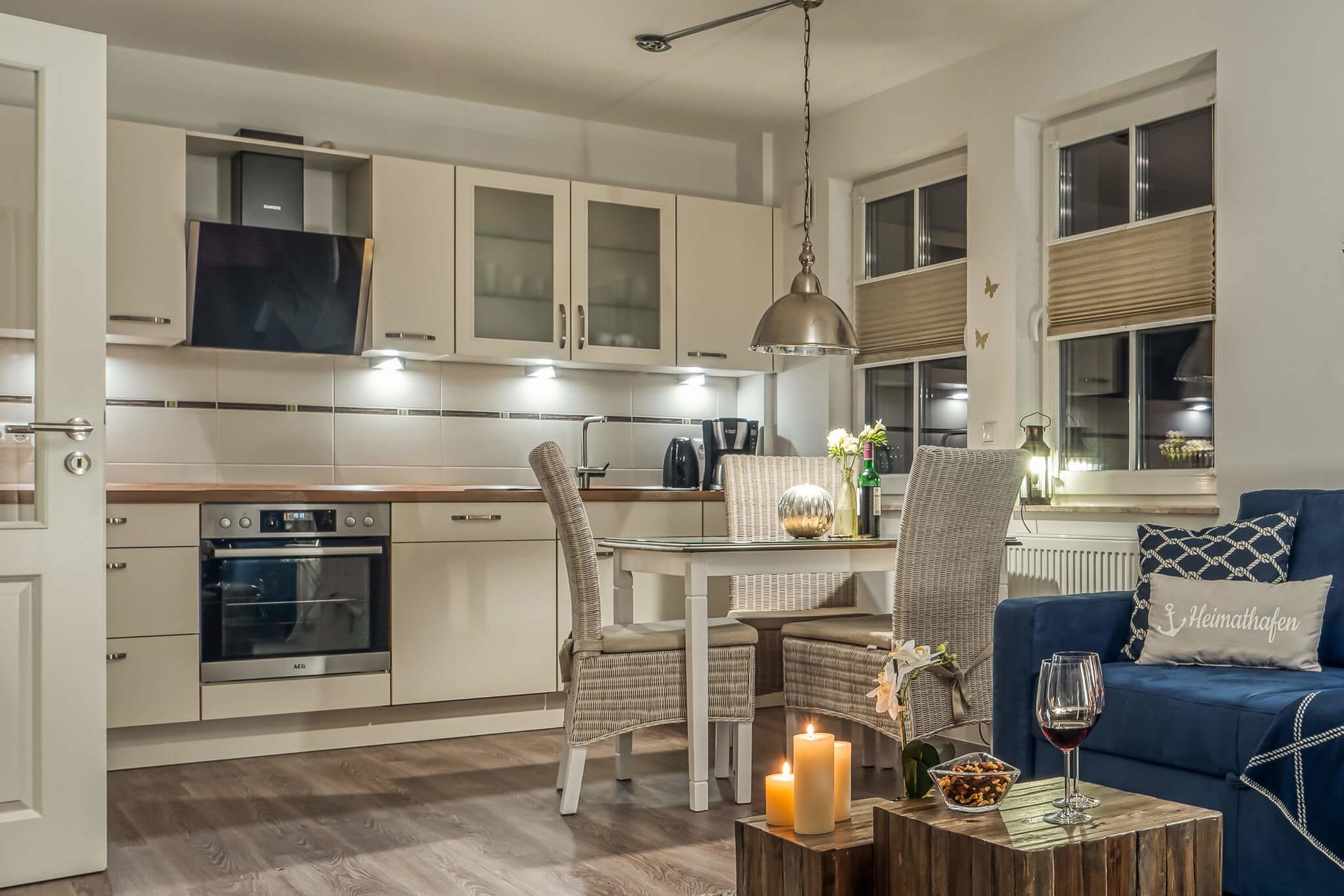 Die Küche ist voll ausgestattet mit allem, was man für den Alltag benötigt. Zudem sind die Fenster der Ferienwohnung mit Plissees und mit Insektenschutzgitter ausgestattet.