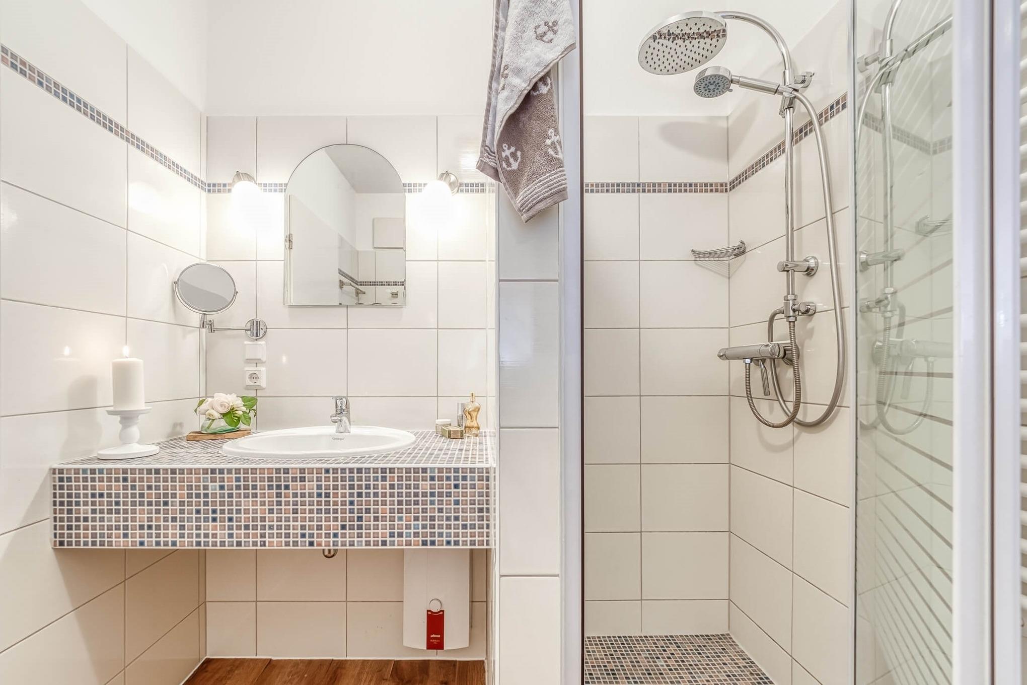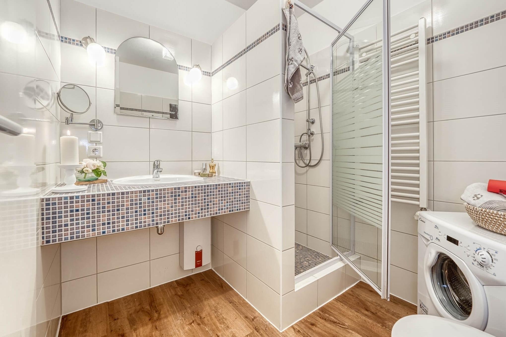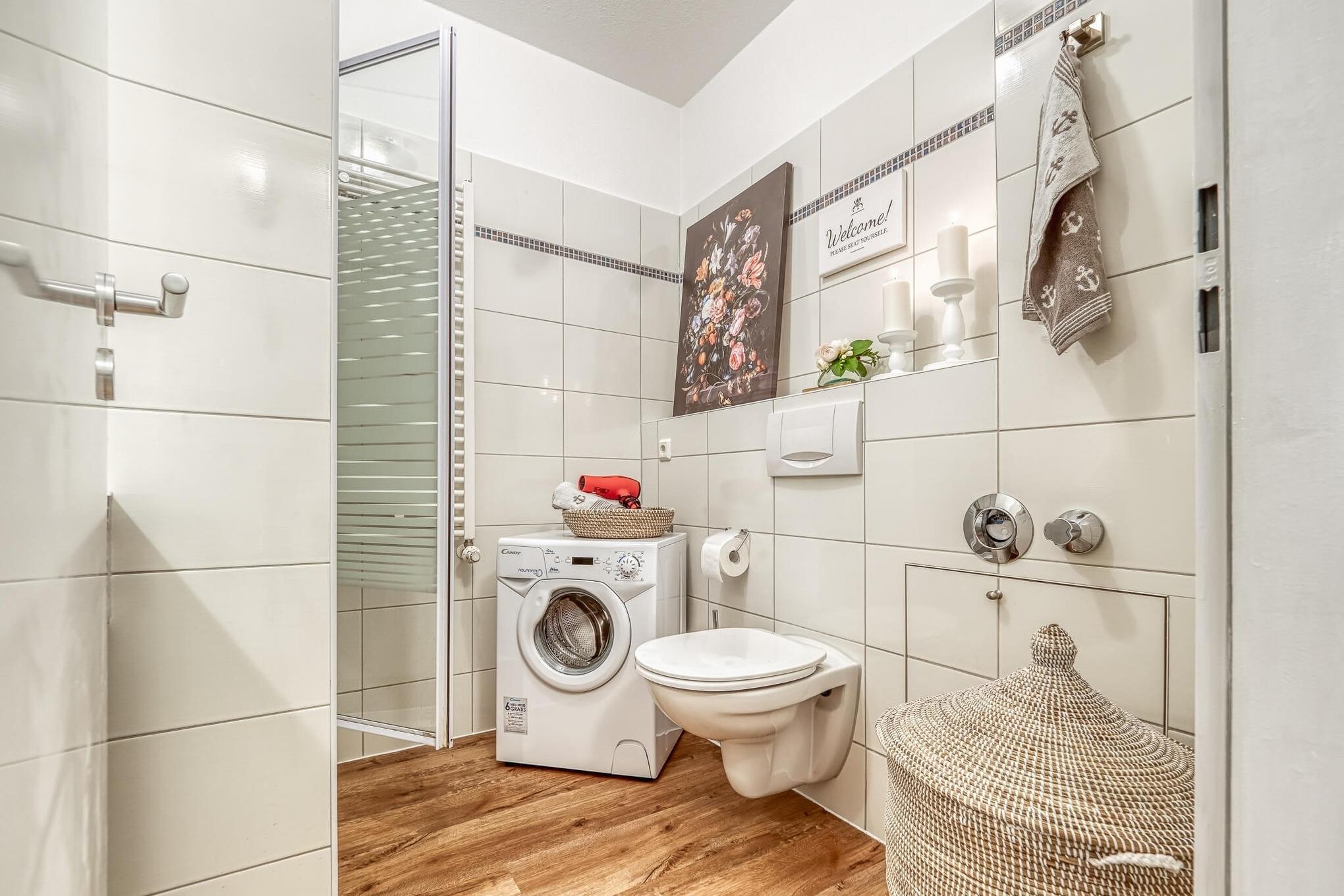 Der Essbereich ist ausgestattet mit einem großen Tisch, welcher direkt vor dem großen Panoramafenster mit tollen Blick Richtung Deich und Strand steht. Vor dem Fenster liegt die kleine Terrasse der Wohnung saisonaler Möblierung. Im hübsch designten Duschbad mit WC steht eine Waschmaschine.