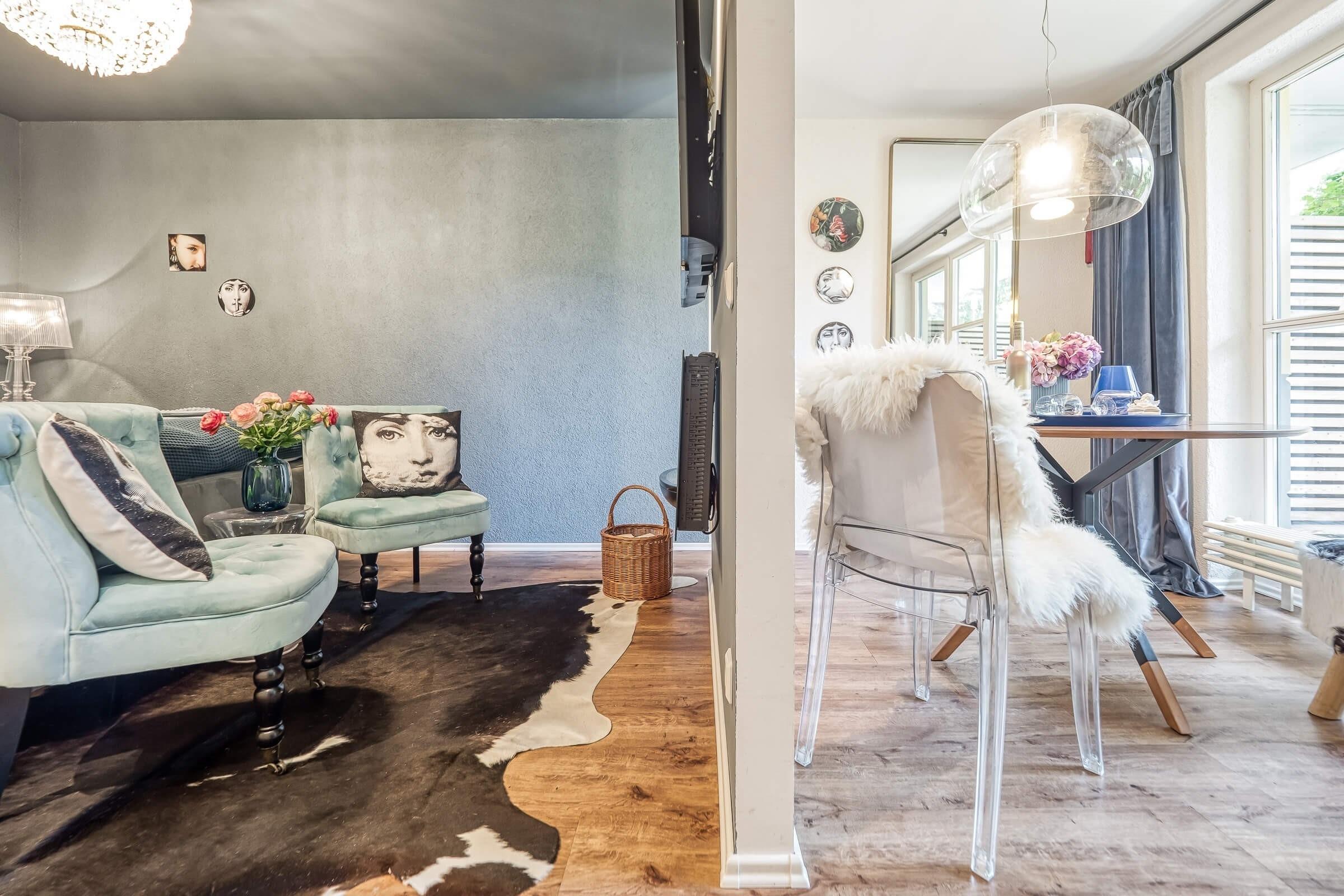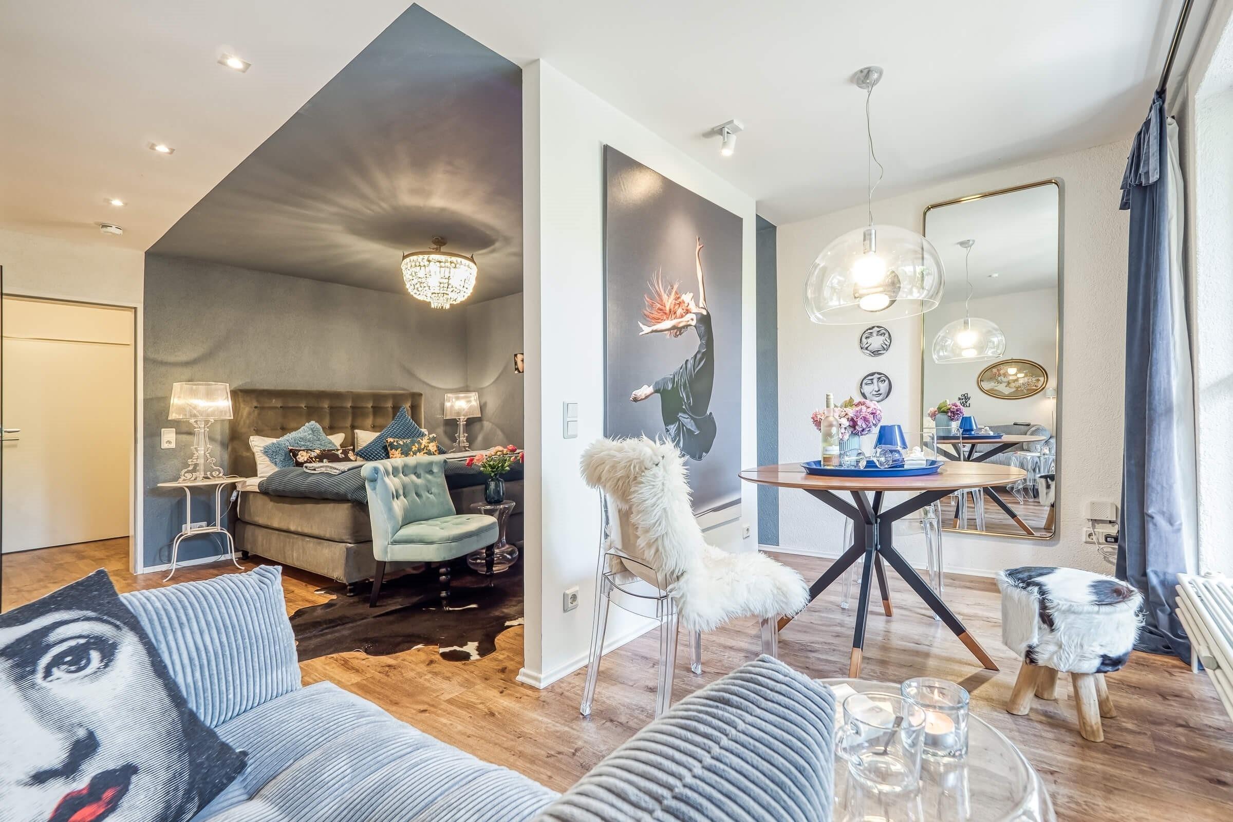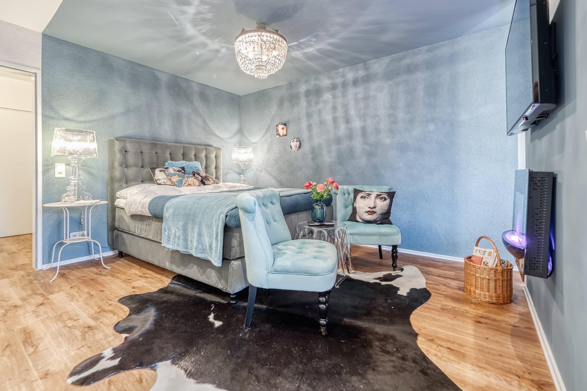 Die liebevoll gestaltete Ferienwohnung besitzt einen großen, gemütlichen, hellen Wohn-/Schlafbereich, welcher optisch getrennt ist. Der Schlafbereich ist ausgestattet mit einem Boxspringbett (160 x 200 cm) mit Federbetten und Kissen, einem samtigen Sesselbereich, TV-Flatscreen, Radio, Elektrokamin und Leseangeboten.