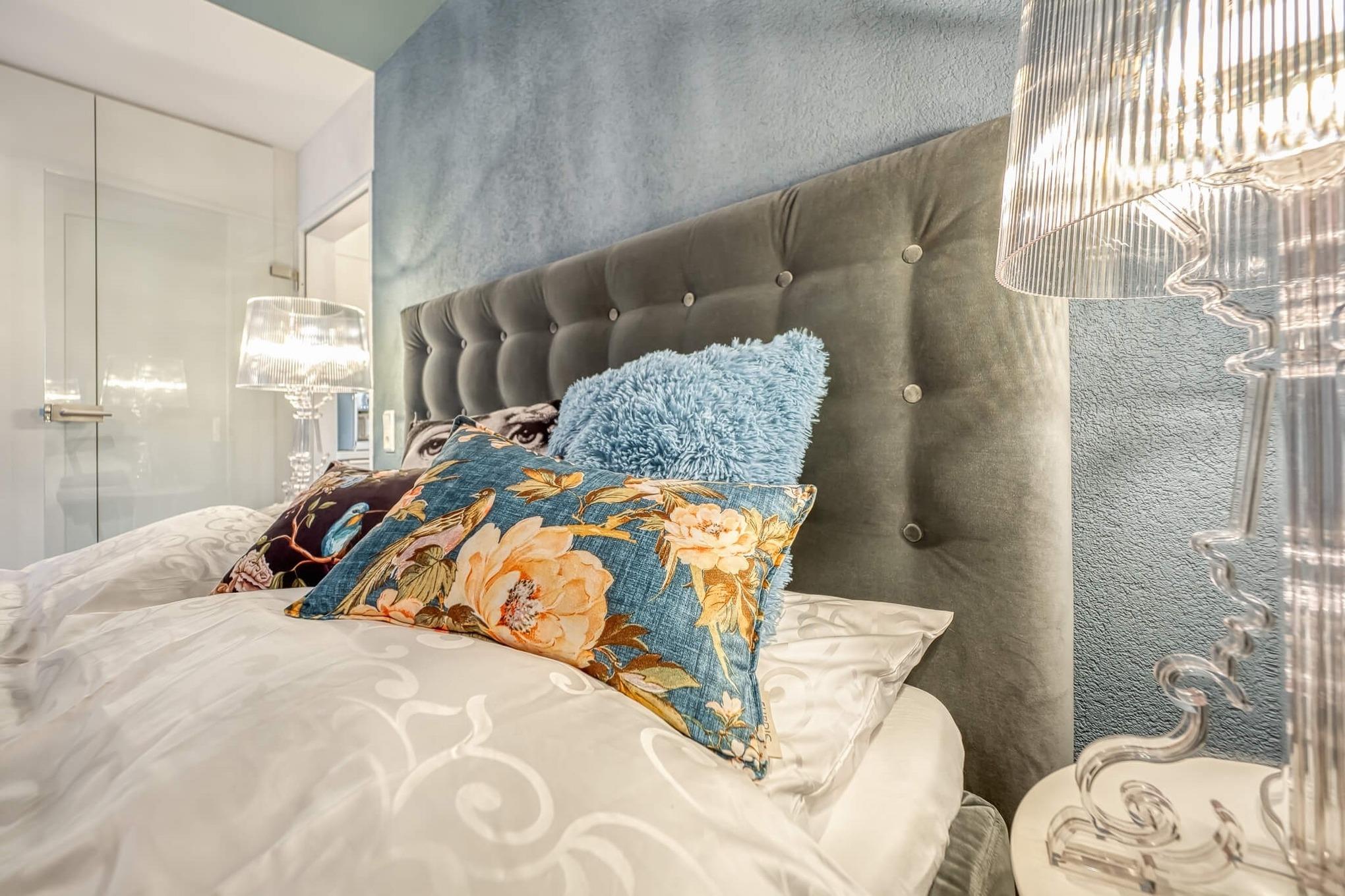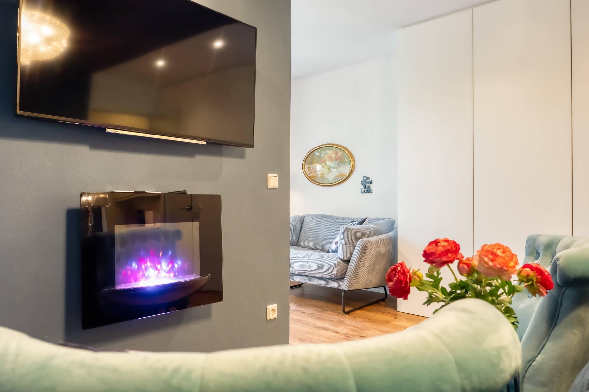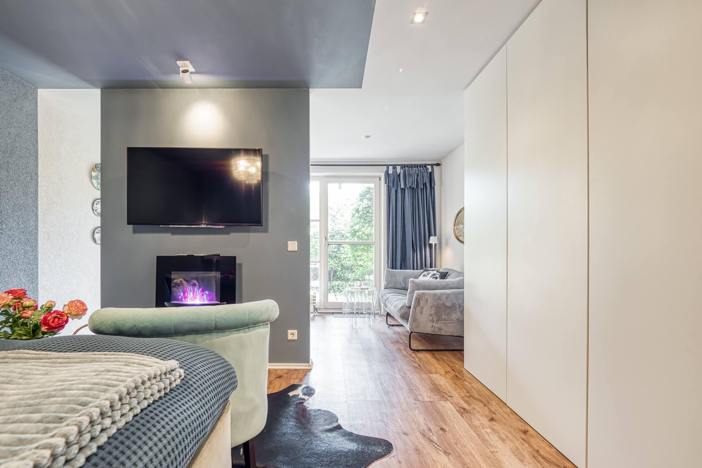 Die liebevoll gestaltete Ferienwohnung besitzt einen großen, gemütlichen, hellen Wohn-/Schlafbereich, welcher optisch getrennt ist. Der Schlafbereich ist ausgestattet mit einem Boxspringbett (160 x 200 cm) mit Federbetten und Kissen, einem samtigen Sesselbereich, TV-Flatscreen, Radio, Elektrokamin und Leseangeboten.