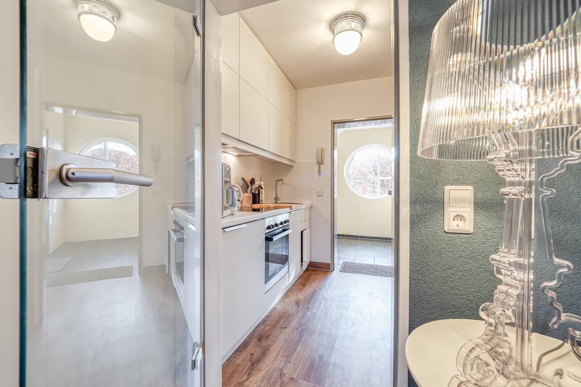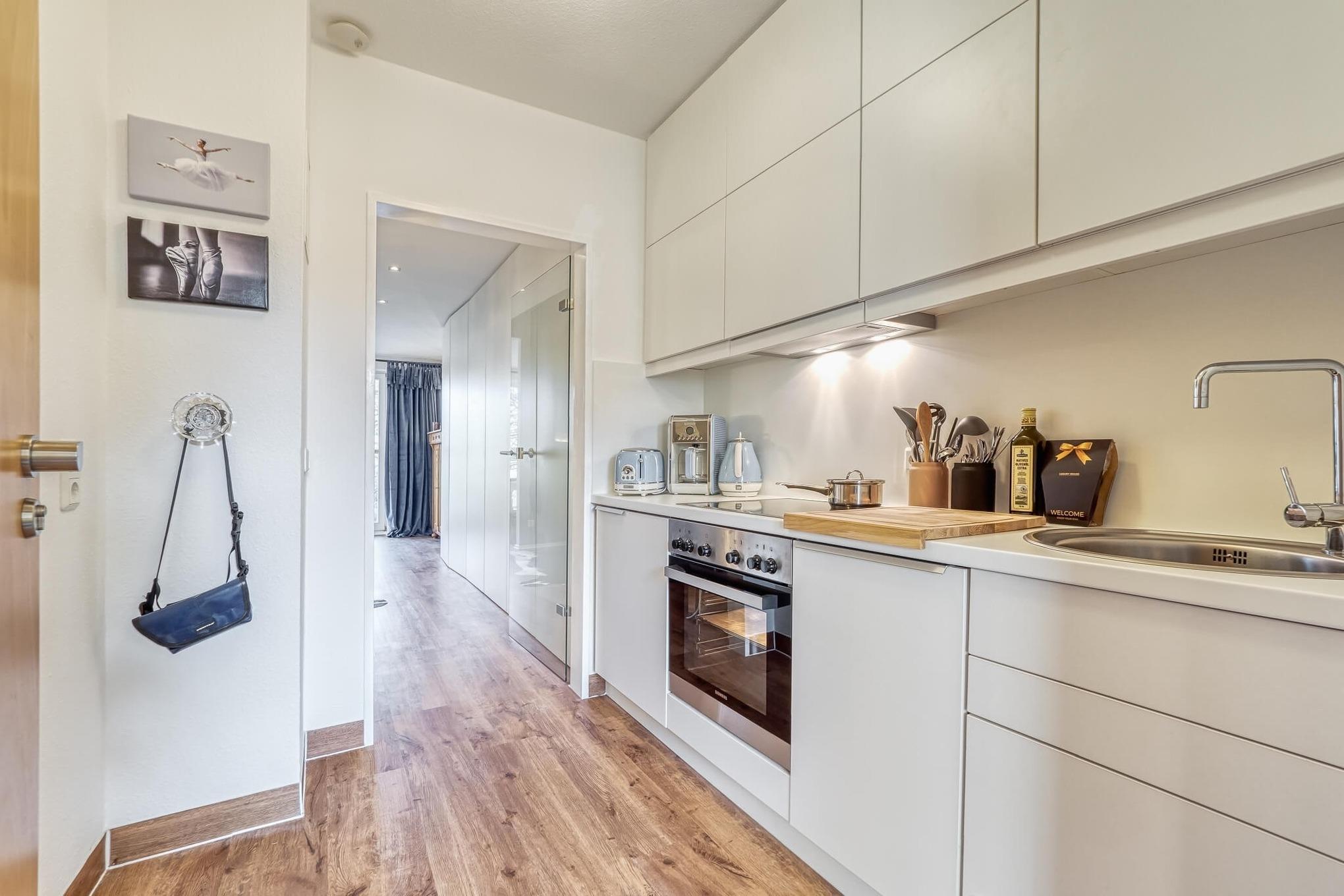In der separaten, modernen Küche sind Kaffeemaschine, Wasserkocher, Toaster, Cerankochfeld(4), Kühlschrank mit Tiefkühlfach, Geschirrspüler und Backofen bereitgestellt.