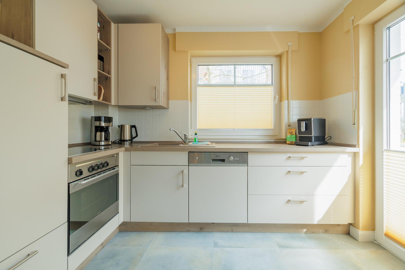 Die gut ausgestattete Küche besitzt unter anderem einen Kühlschrank, einen Herd zum Kochen und sogar eine Spülmaschine.