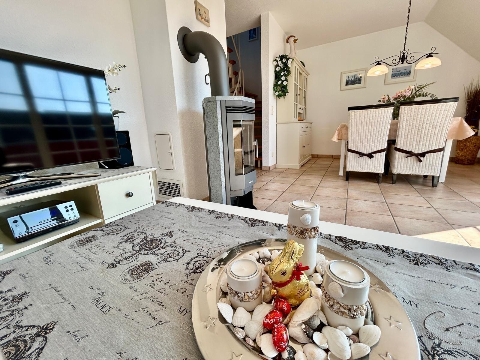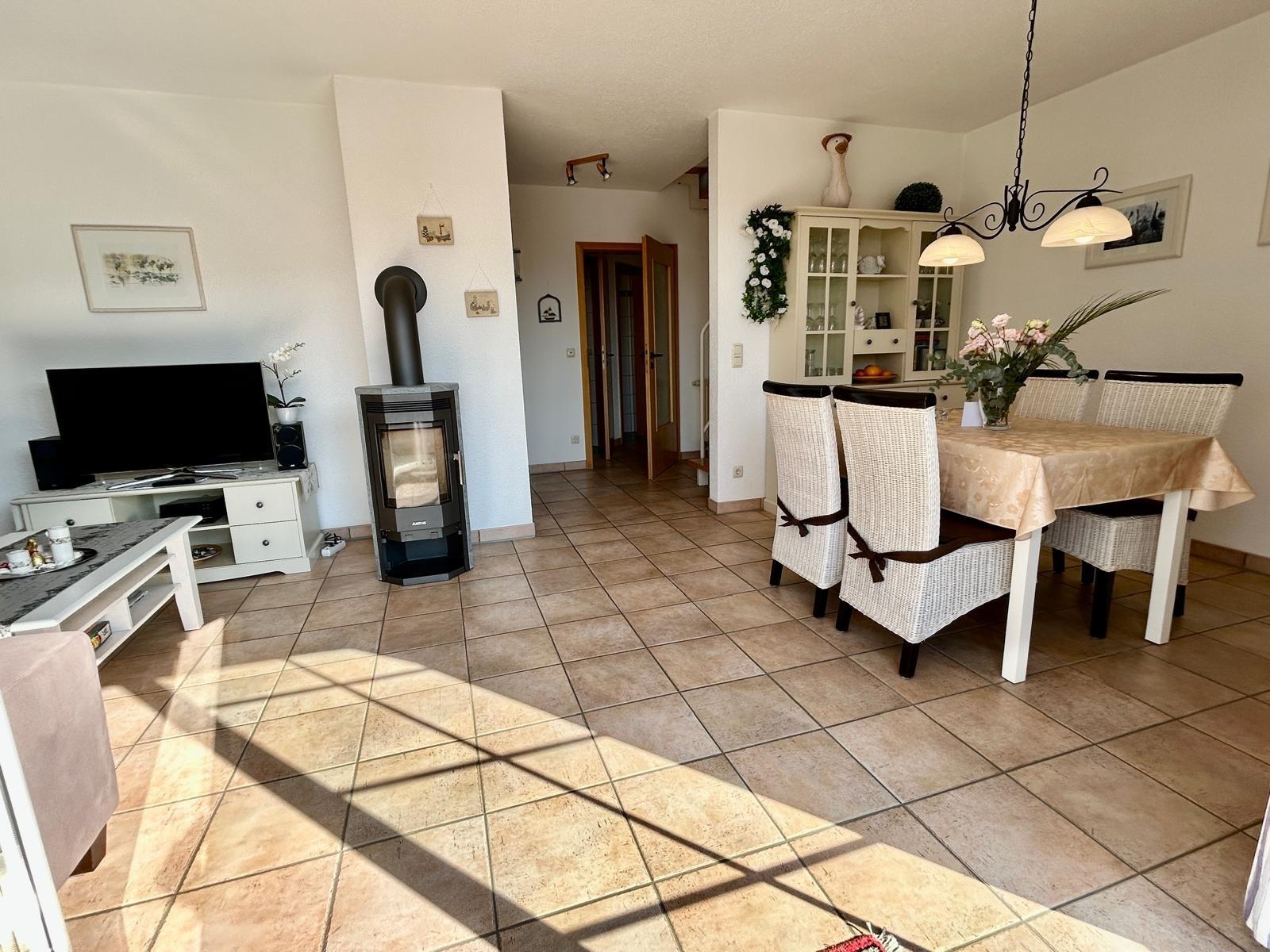 Die Wohnung hat 2 Schlafzimmer, Wohnbereich mit offener Küche, Essbereich und Kaminofen, von hier aus gelangt man auf den Balkon.