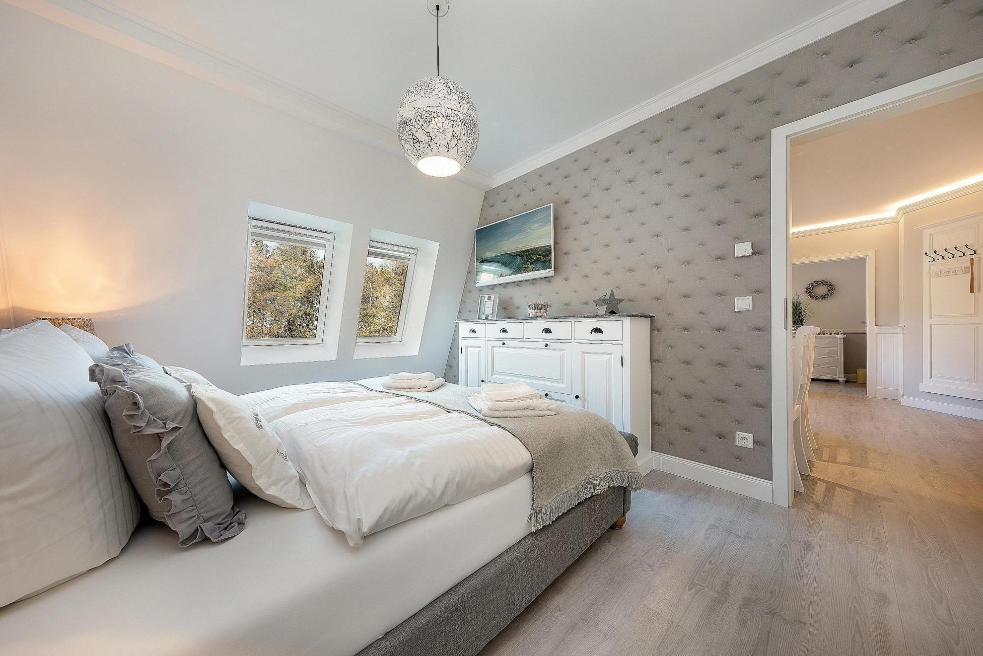 Die Ferienwohnung bietet eine durchdachte Ausstattung, die sowohl Komfort als auch Funktionalität vereint. Sie verfügt über zwei geschmackvoll eingerichtete Schlafzimmer, eines mit einem Doppelbett und eines mit einem Einzelbett, ideal für Familien oder Gruppen. Die offene Küche ist mit modernen Geräten wie Geschirrspüler, Backofen, Mikrowelle und einer Kaffeemaschine ausgestattet, um kulinarische Wünsche zu erfüllen. Das Badezimmer bietet eine bodengleiche Dusche sowie einen Kosmetikspiegel und ist durch ein Fenster gut belüftet.