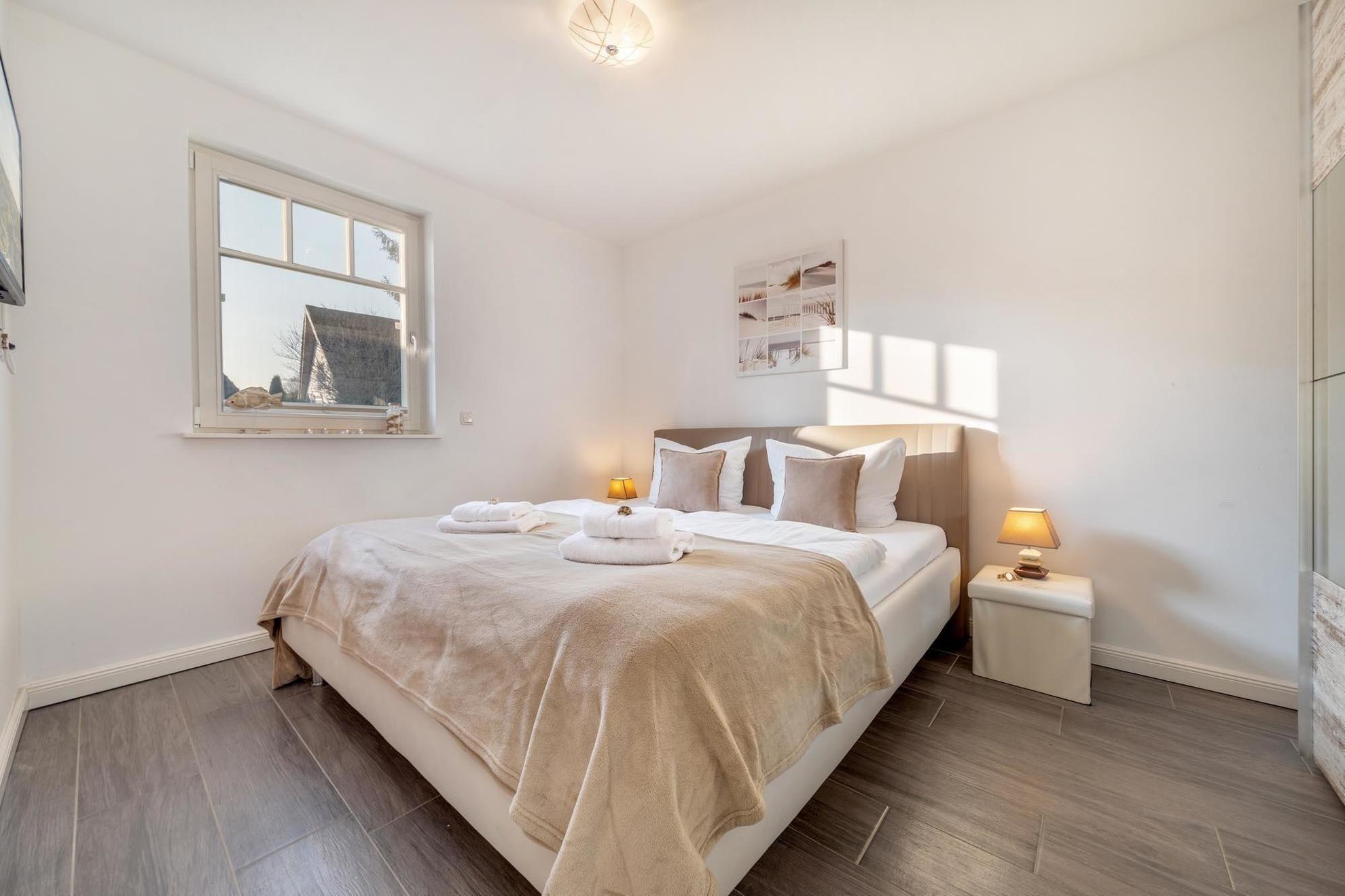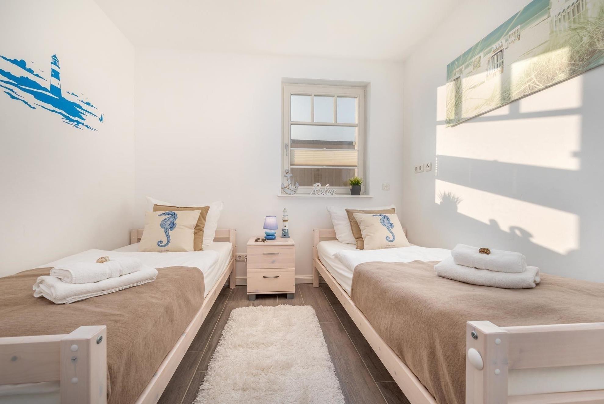 Die Ferienwohnung bietet einen modernen Rückzugsort mit durchdachter Ausstattung für einen erholsamen Aufenthalt. Zwei Schlafzimmer, eines mit einem Doppelbett und eines mit zwei Einzelbetten, gewährleisten ausreichend Platz für Familien oder Gruppen. Das Badezimmer verfügt über eine bodengleiche Dusche und ist mit einem Haartrockner sowie hochwertigen Annehmlichkeiten ausgestattet.