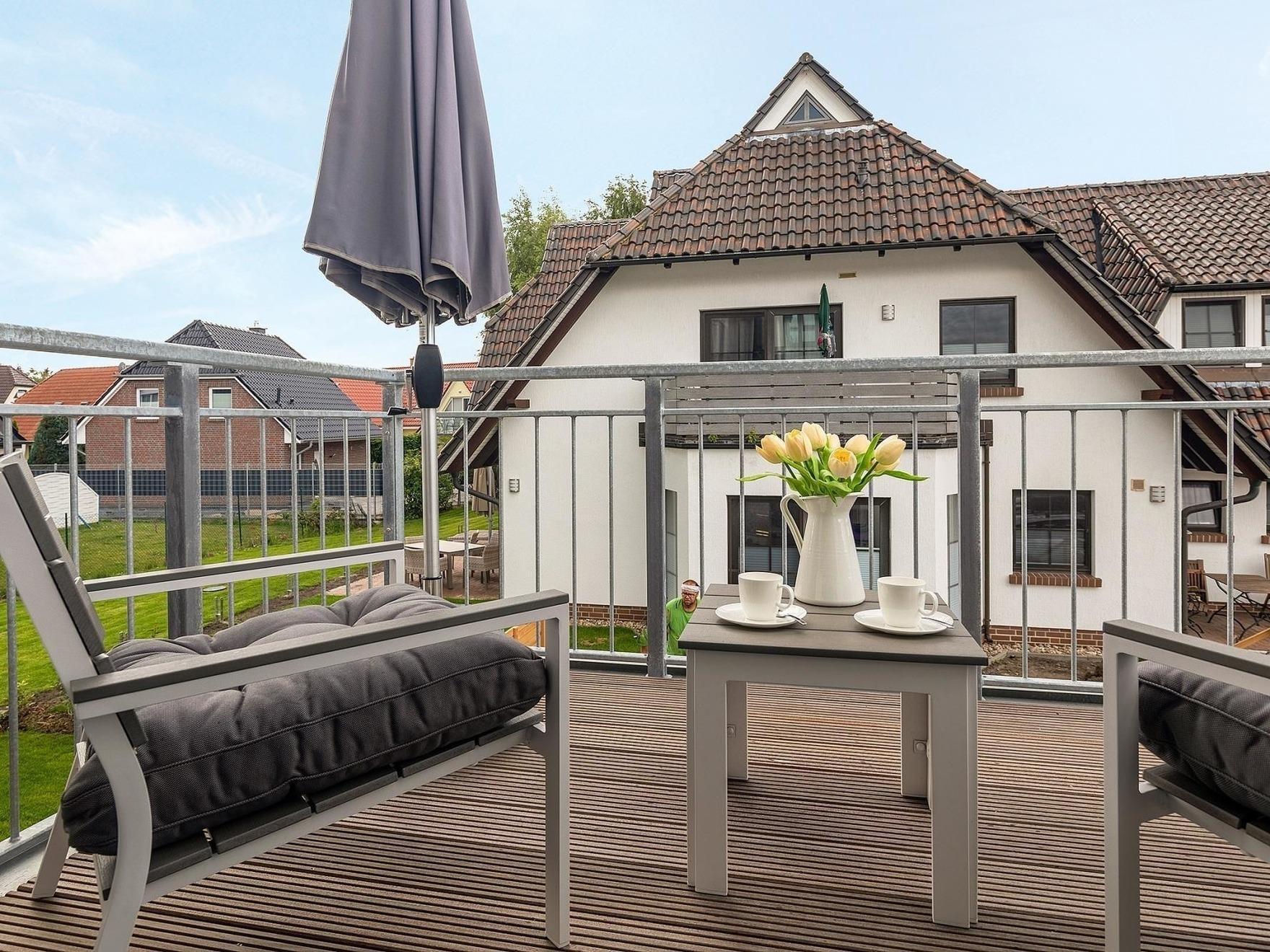 Die Ferienwohnung bietet einen einladenden Balkon, der ideal ist, um die frische Luft und die Umgebung zu genießen. Hier kann der Gast entspannen und die Ruhe der Natur aufnehmen. Der private Außenbereich garantiert ungestörte Momente und lädt dazu ein, den Tag mit einem Buch oder einem Getränk in der Hand ausklingen zu lassen.