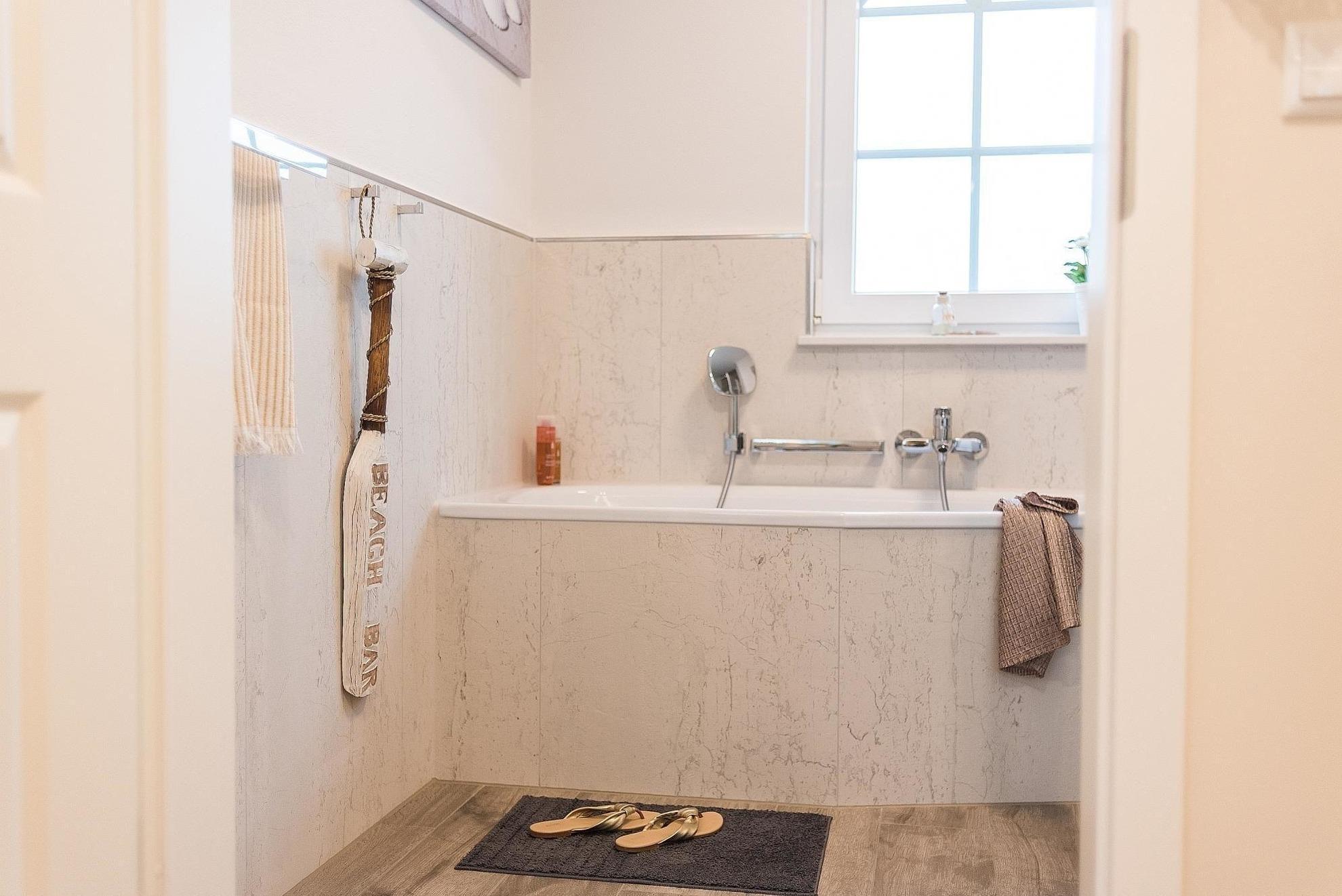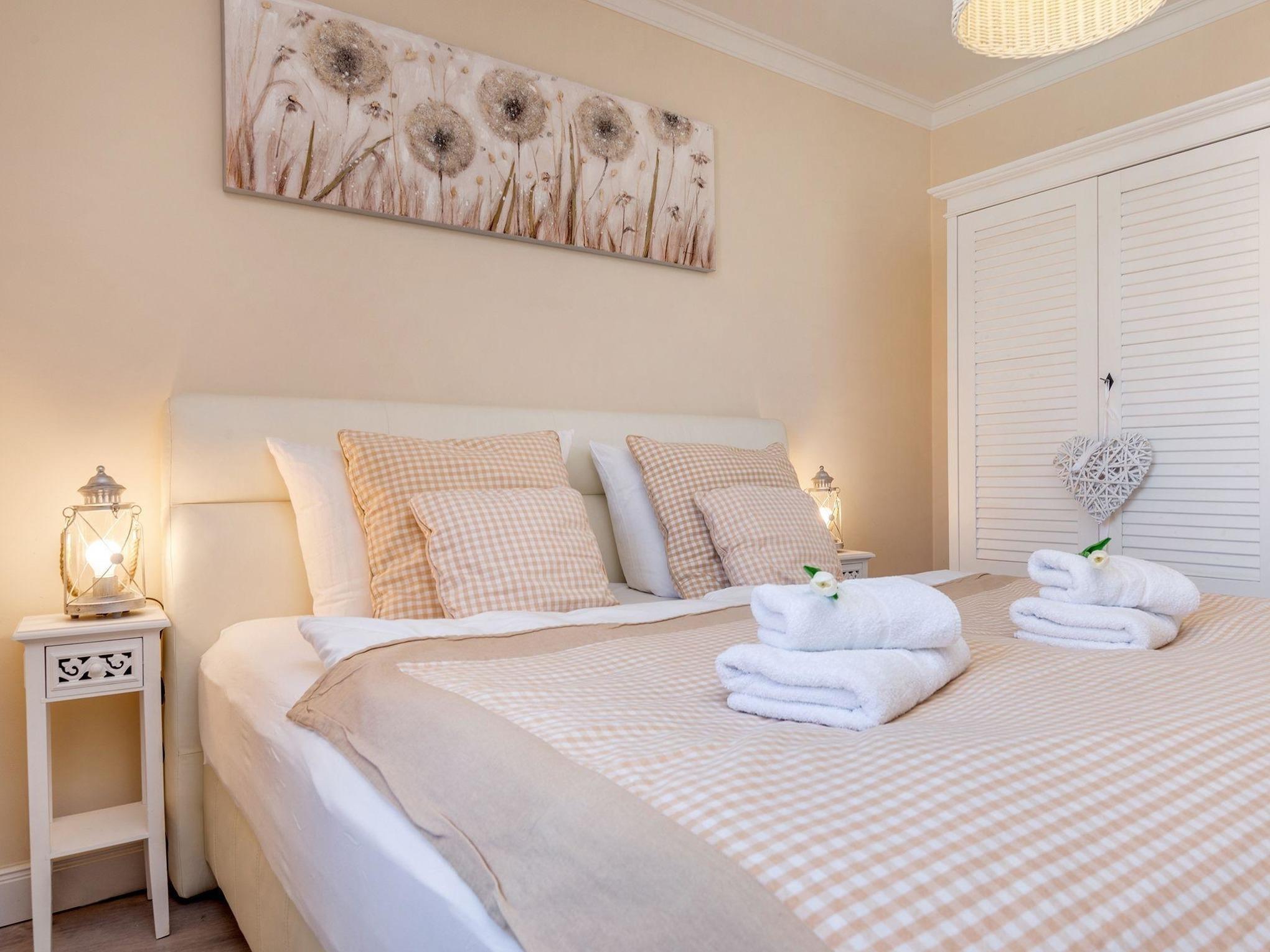 Die Ferienwohnung bietet eine durchdachte Raumaufteilung und hochwertige Ausstattung für einen angenehmen Aufenthalt. Zwei gemütliche Schlafzimmer sind mit bequemen Boxspringbetten (180x200) ausgestattet und verfügen über Flat-TVs sowie Kleiderschränke und Nachttische. Das Badezimmer überzeugt mit bodengleicher Dusche, Badewanne und einem großen Fenster. Zusätzliche Annehmlichkeiten wie Haartrockner und Kosmetikspiegel sind vorhanden.