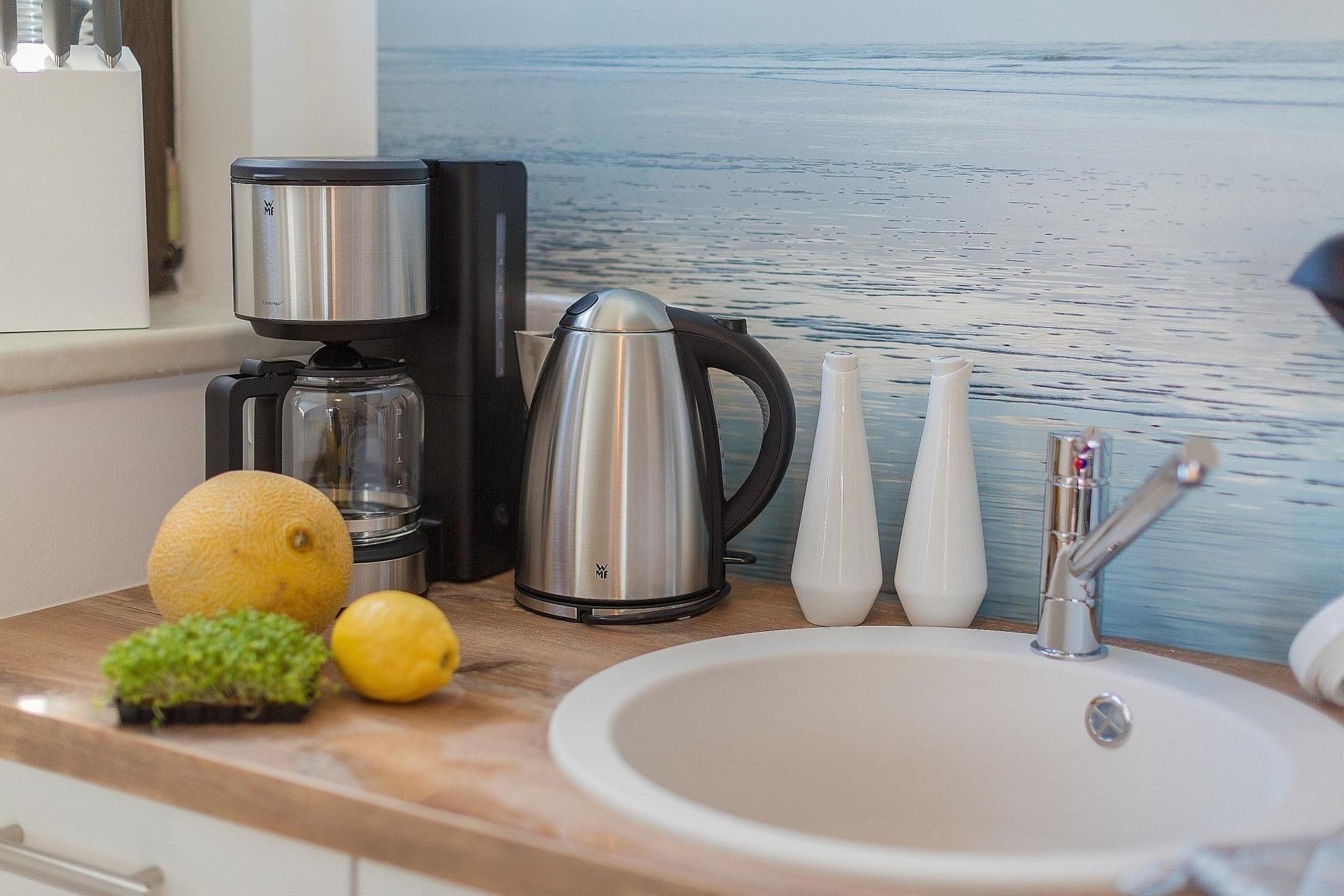 Die bestens ausgestattete Küche lässt keine Wünsche offen und umfasst einen Elektro-/Gasherd, Backofen, Mikrowelle, Kaffeemaschine, Toaster und Mixer. Für Allergiker ist die Wohnung bestens geeignet. Ein gemütlicher Esstisch lädt zu gemeinsamen Mahlzeiten ein.