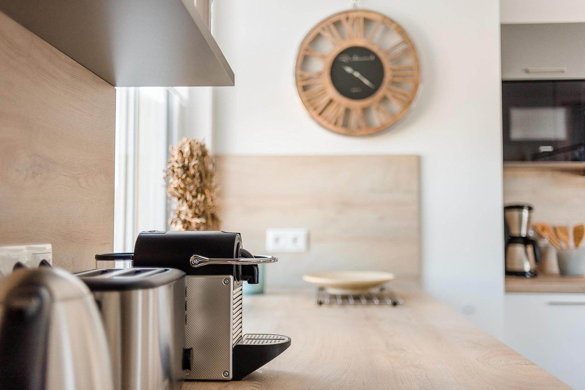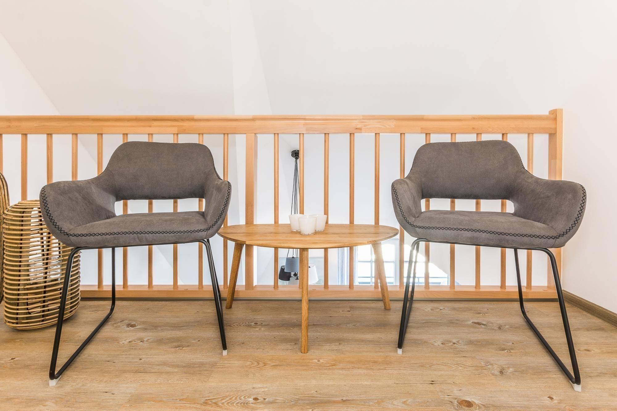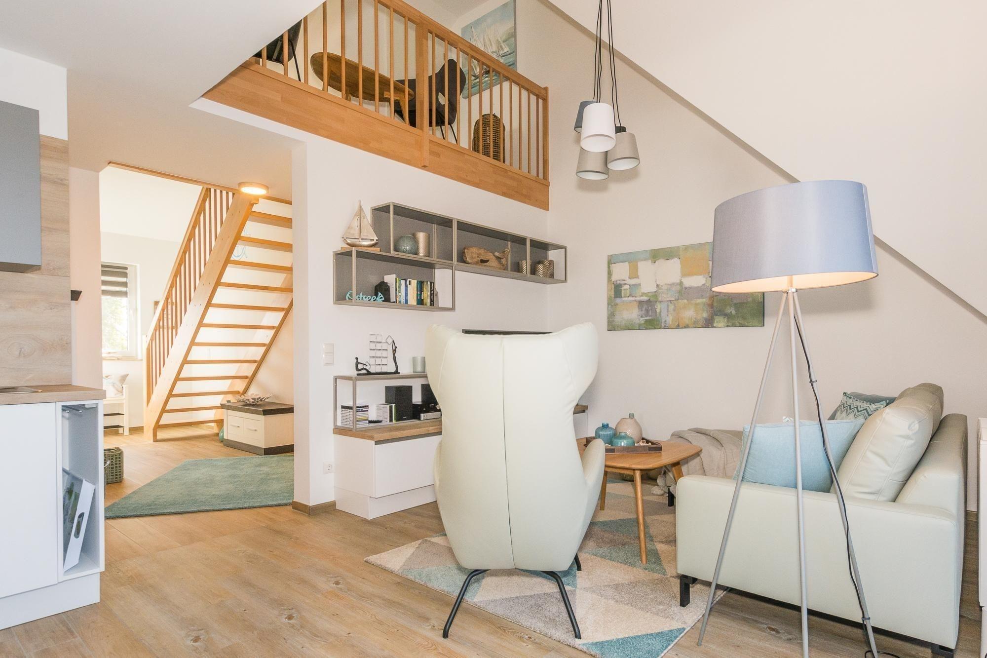 Die Maisonette-Wohnung beeindruckt durch ein modernes Raumkonzept und umfangreiche Ausstattung. Im 1. Obergeschoss betreten die Gäste einen großzügigen Wohnbereich mit offener Küche, der mit einem Geschirrspüler, Elektro- und Gasherd, Backofen, Mikrowelle sowie Kühlschrank und verschiedenen kleinen Küchenhelfern wie einer Kaffeemaschine und einem Toaster ausgestattet ist. Ein großes Badezimmer mit bodentiefer Dusche und Kosmetikspiegel sorgt für zusätzlichen Komfort.
