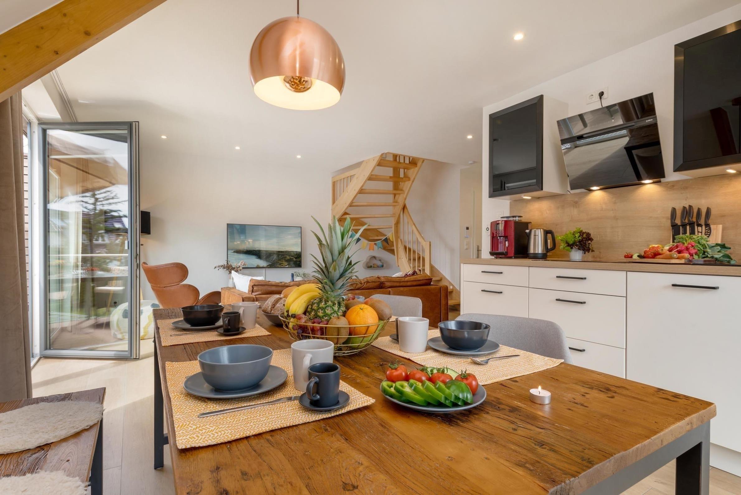 Die Ferienwohnung bietet einen großzügigen und modernen Raum mit zwei Schlafzimmern, ausgestattet mit zwei komfortablen Doppelbetten. Die offene Küche lässt keine Wünsche offen: Sie verfügt über einen Elektro- und Gasherd, einen Backofen, einen Kühlschrank, eine Geschirrspülmaschine, eine Kaffeemaschine sowie zusätzliche Küchengeräte wie Mixer und Eierkocher. Die bodengleiche Dusche im Duschbad und das separate Gäste-WC bieten hohen Komfort. Eine Fußbodenheizung sorgt für wohlige Wärme in allen Räumen. Technisch ist die Wohnung bestens ausgestattet mit WLAN, TV und einer HiFi-Anlage. Für Allergiker ist die Unterkunft geeignet, und zusätzlich stehen Brettspiele für entspannte Abende zur Verfügung. Ein Parkplatz ist ebenfalls vorhanden. Die Wohnung bietet alles, was für einen entspannten Aufenthalt erforderlich ist – ideal für die ganze Familie.