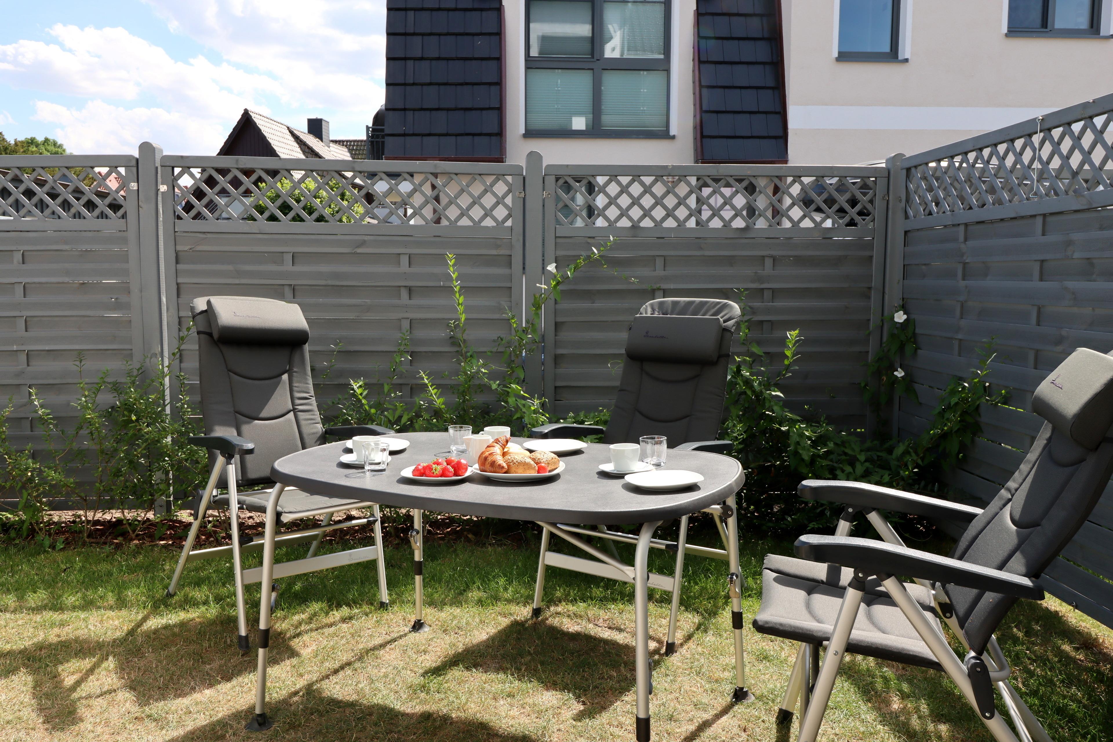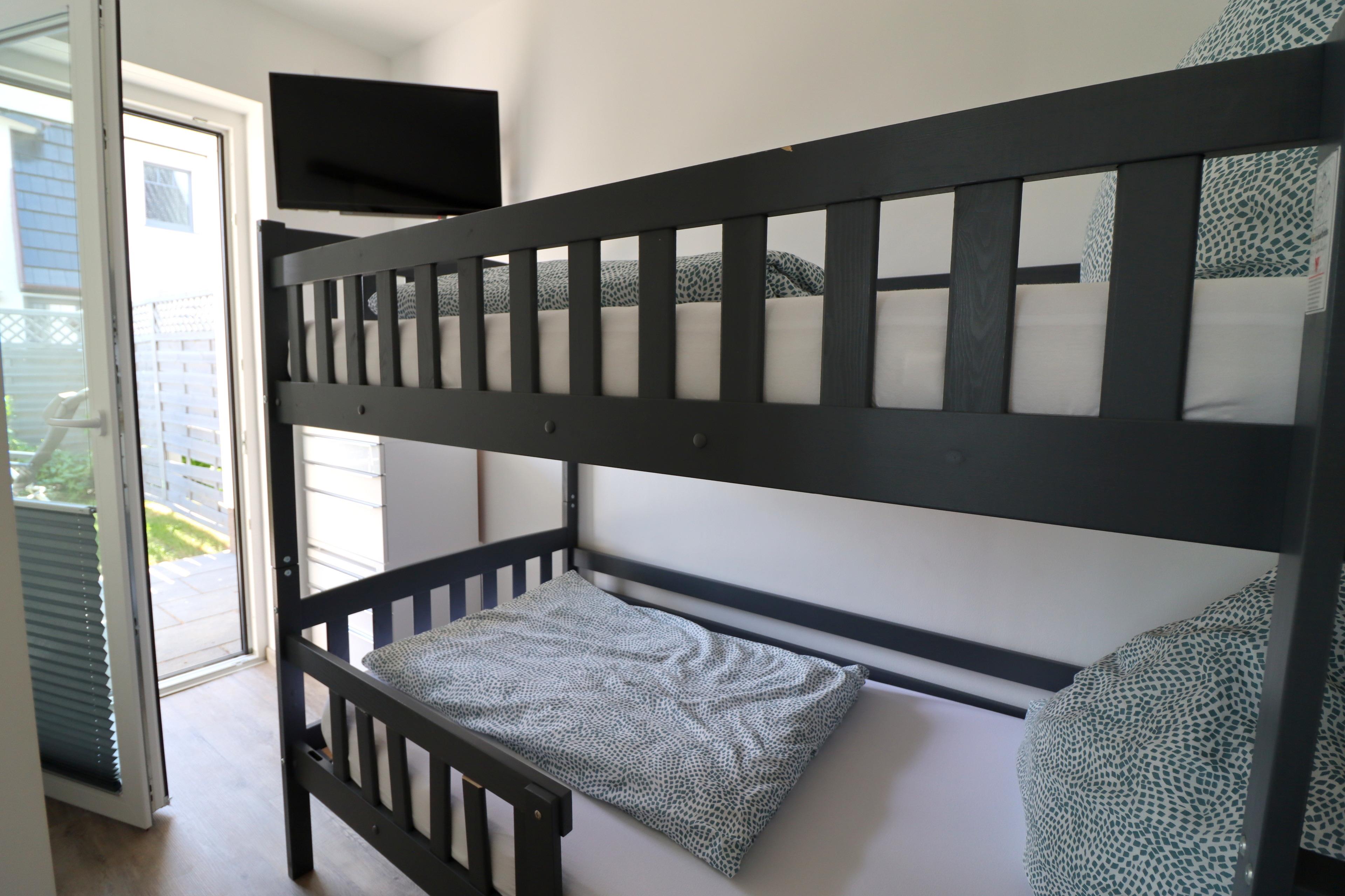 Die 3-Raum-Ferienwohnung bietet auf ca.48qm ausreichend Platz für 4 Personen + Kleinkind.In dem gemütlich eingerichtetem Wohnzimmer stehen Ihnen ein TV zur Verfügung.Von hier haben Sie einen direkten Zugang zur sonnigen Terrasse mit bequemen Gartenmöbeln,wo Sie einen schönen Strandtag ausklingen lassen können.Auf gleicher Ebene befindet sich die offene Küche und das Kinderzimmer.