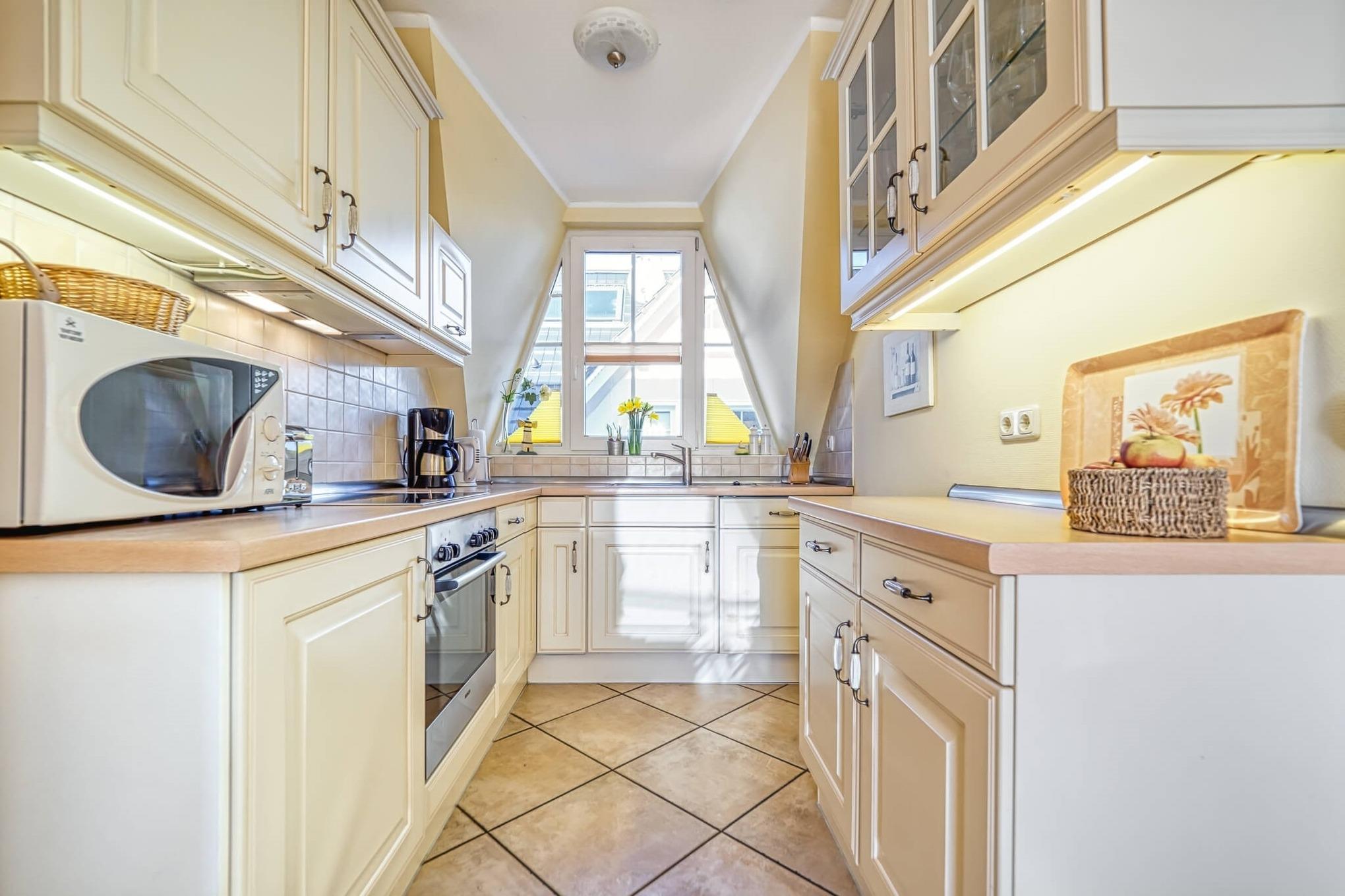 Über den separaten Eingang zu einem Treppenhaus betreten Sie im ersten Stock links die Ferienwohnung mit gemütlicher Sitzecke und Zugang zum Balkon. Bei mehr als zwei Gästen lässt sich die Couch zu einem Bett umfunktionieren. Der Wohnbereich umfasst auch den Essbereich und eine Küchenzeile mit Geschirrspüler, Kühlschrank mit Gefrierkombination und Backofen.