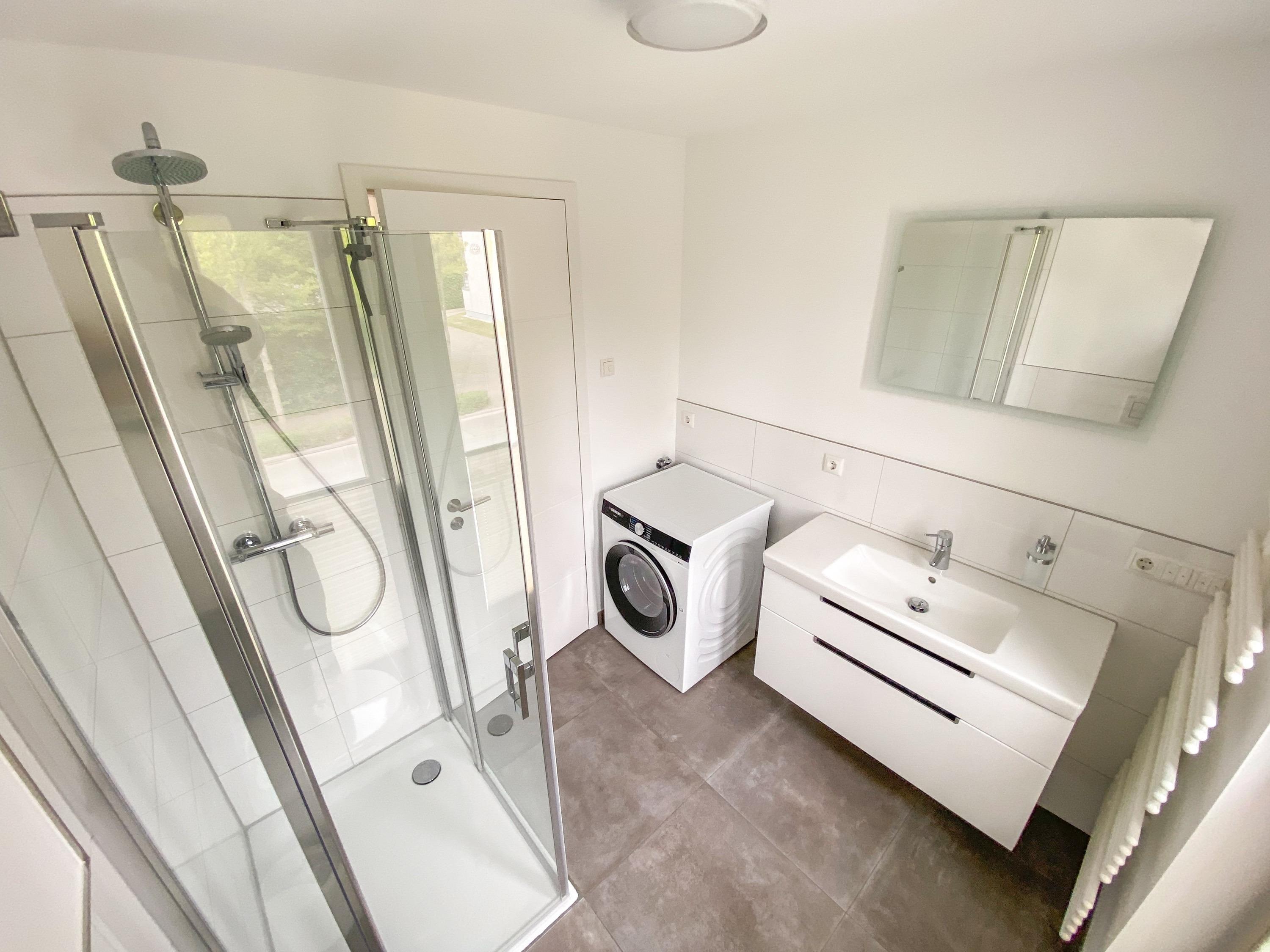 Das zweite Badezimmer im 1. Obergeschoss hat neben einer Dusche und WC eine Waschmaschine zur freien Verfügung (Ohne Münzen).