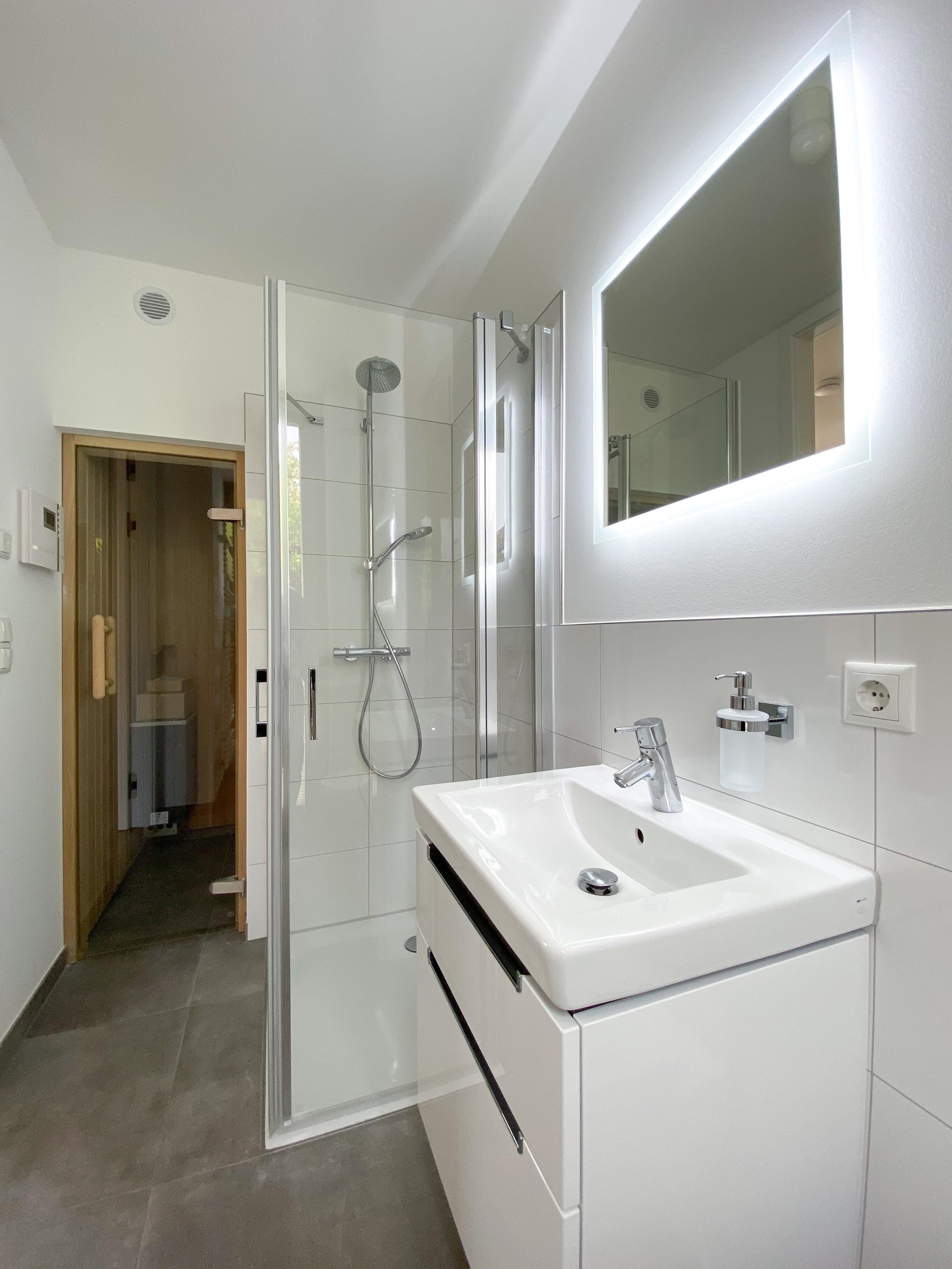 Das Badezimmer im Erdgeschoss mit Dusche und WC bietet Zugang zur hauseigenen Sauna.