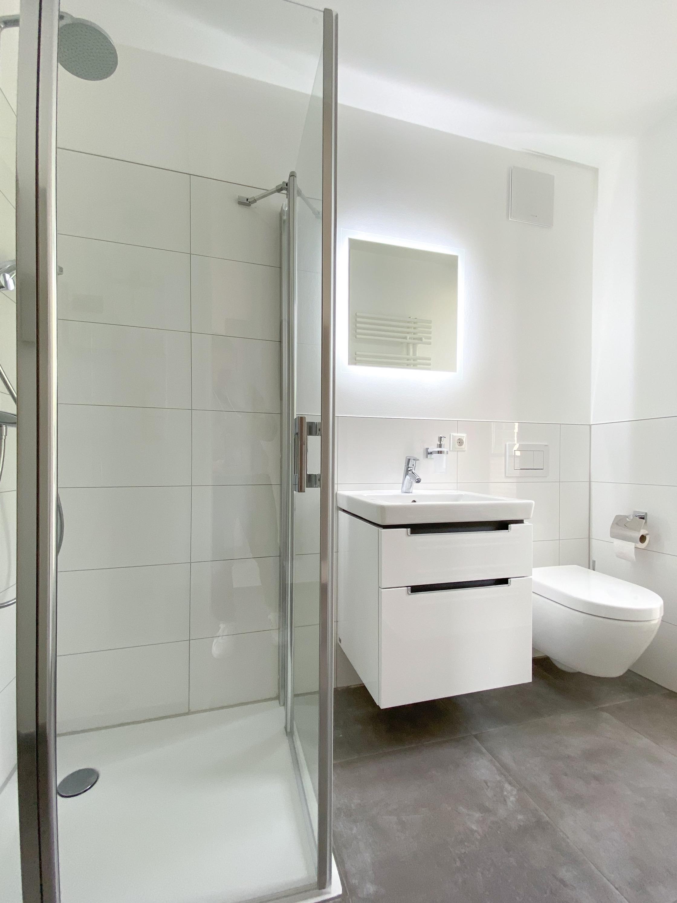 Das zweite Badezimmer im 1. Obergeschoss hat neben einer Dusche und WC eine Waschmaschine zur freien Verfügung (Ohne Münzer).