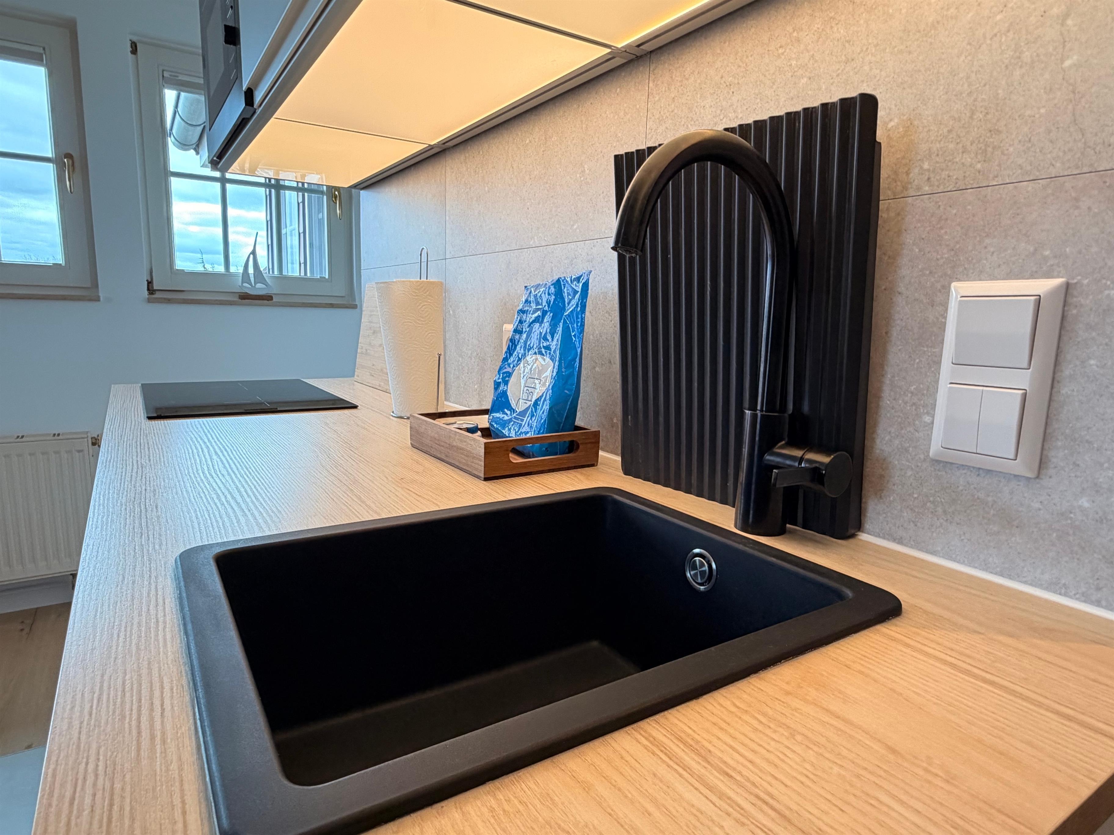 Auf 42 Quadratmetern bietet sie alles, was Sie für einen erholsamen Aufenthalt benötigen. Genießen Sie Ihre Lieblingssendungen mit SAT-TV und Radio oder bereiten Sie sich in der Küchenzeile köstliche Mahlzeiten zu. Der Schlafbereich ist mit einem komfortablen Boxspringbett mit durchgehender Matratze ausgestattet, um erholsame Nächte zu garantieren. Das frisch sanierte Badezimmer verfügt über eine kuschelige Fußbodenheizung, eine entspannende Dusche und ein WC. Eine Kammer bietet Platz für Schuhe und andere Utensilien.