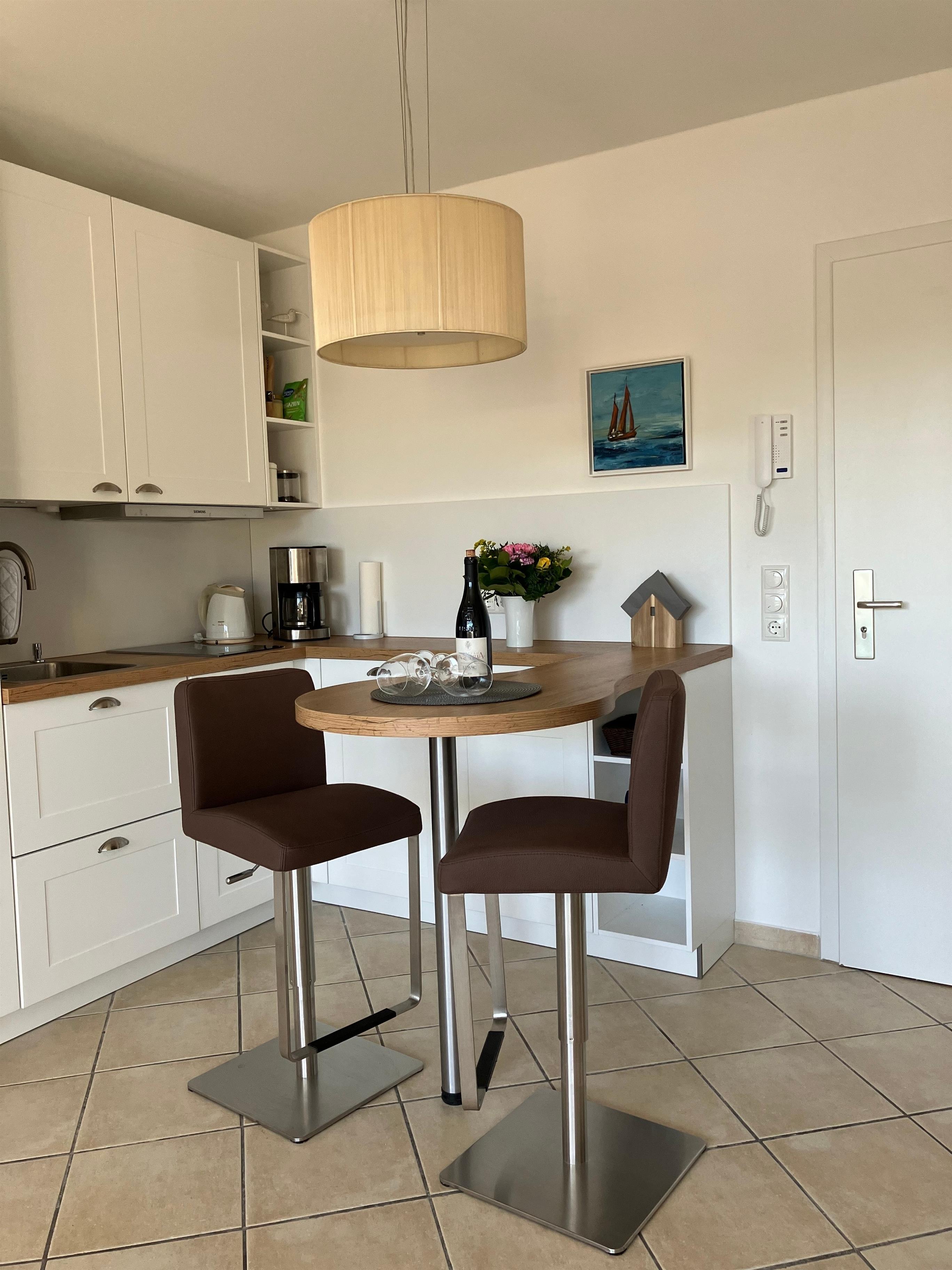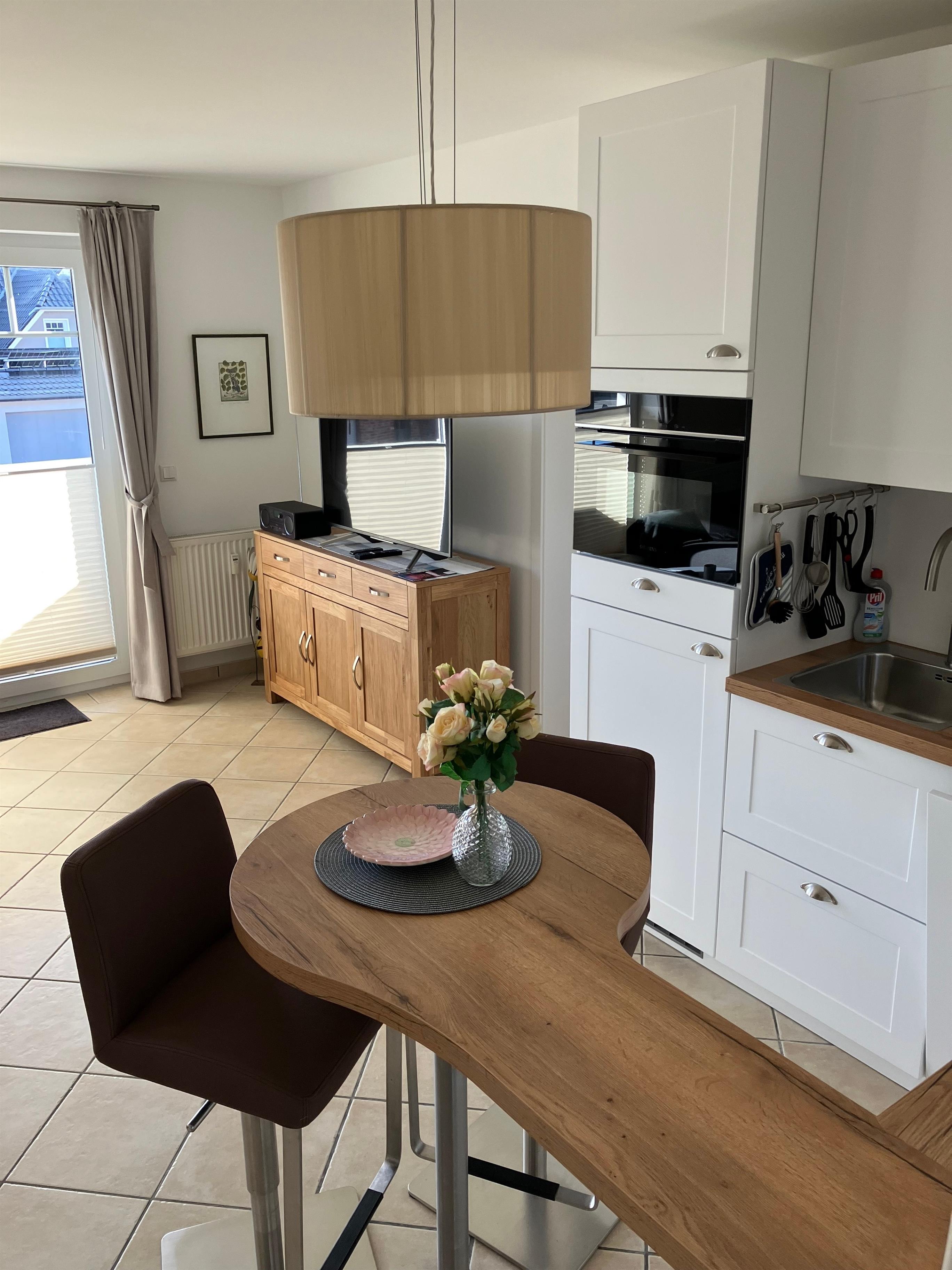 Das neue Bad mit hochwertiger Einrichtung lässt einen den Morgen unter der Regendusche gut starten. Das Badezimmer hat ein Veluxfenster und ist somit nicht nur hell und freundlich, sondern läßt sich gut lüften. Eine moderne Küche inkl. Geschirrspüler, Ceranfeld, Backofen mit integrierter Mikrowelle bereitet beim Kochen für Zwei; großes Vergnügen. Der Wohnraum verfügt über ein sehr hochwertiges Schlafsofa (1,60 x 2,00) - "Bruno-Das Bett" - und bietet daher einen sehr guter Schlafkomfort. Das Bett ist mit einem Ausziehmechanismus leicht zu bedienen. Eine passende Polsterbox hinter dem Sofa lässt die Bettwäsche wunderbar unsichtbar verschwinden. Die Wohnung verfügt über Wlan und liegt in ruhiger, beliebter Lage, in fußläufiger Strandnähe in Zingst. Ein besonderes Highlight ist der große Südbalkon mit einem Tisch und zwei Sitzmöbeln. Hier lässt sich nach einem Strandtag gemütlich das Glas Wein am Abend genießen. In dem separaten Abstellzimmer im Wohnbereich ist die Garderobe integriert und bietet Stauraum für alles, was nicht in den Wohnbereich gehört. Neben einem eigenen Parkplatz ist auch der großzügige separat abschließbare Abstellraum für Fahrräder und Sport- , bzw. Strandequipment hervorzuheben. Bitte auch hier die Koffer abstellen.