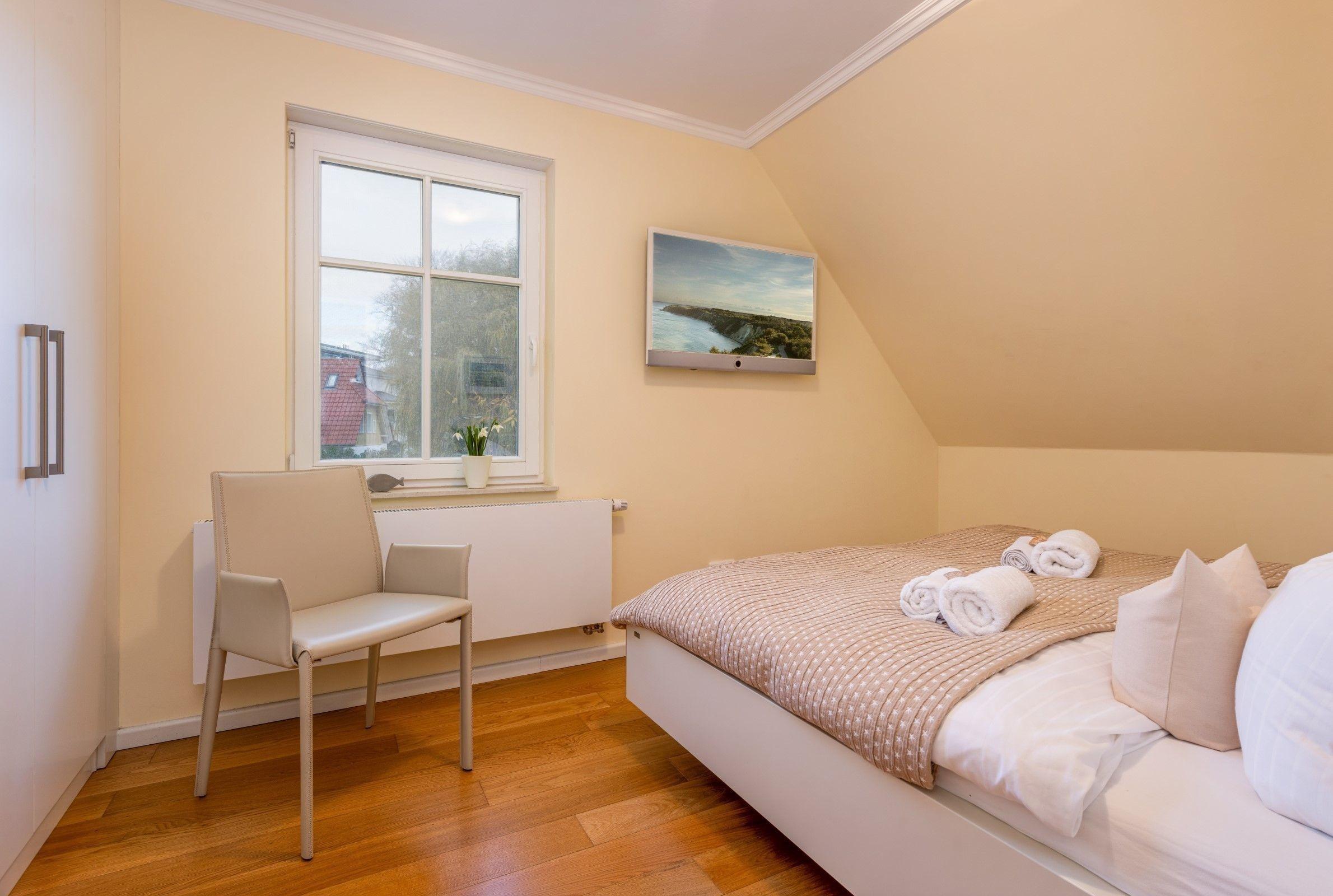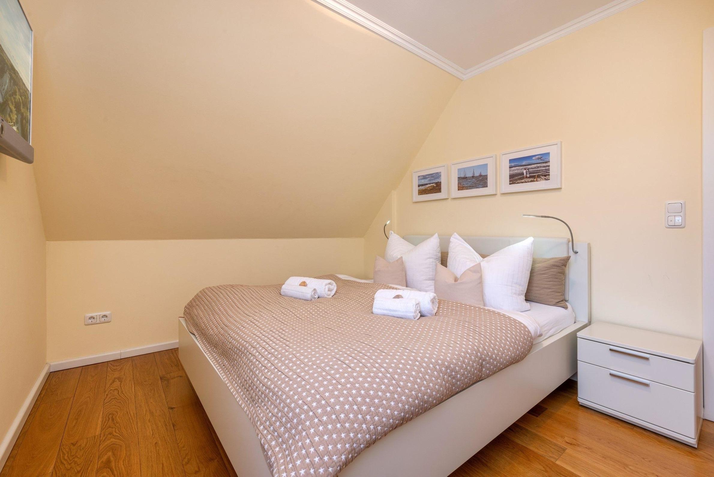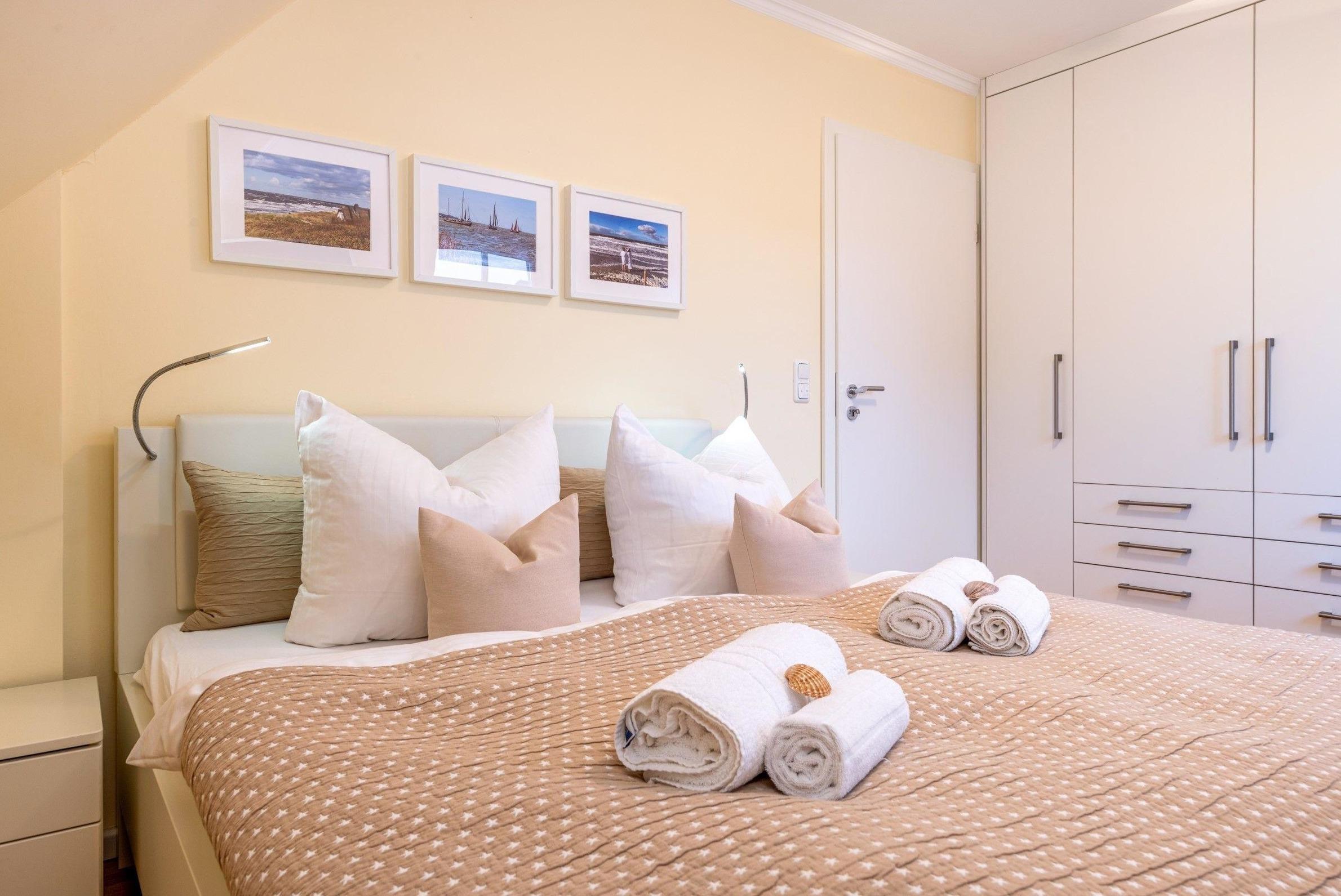Die Ferienwohnung bietet ein ideal ausgestattetes Zuhause für entspannte Aufenthalte. Sie verfügt über zwei Schlafzimmer, die mit zwei Doppelbetten sowie einem Kinderbett ausgestattet sind, und bietet somit Platz für Familien oder Gruppen. Zwei moderne Badezimmer mit bodengleicher Dusche und Kosmetikspiegel sorgen für zusätzlichen Komfort.