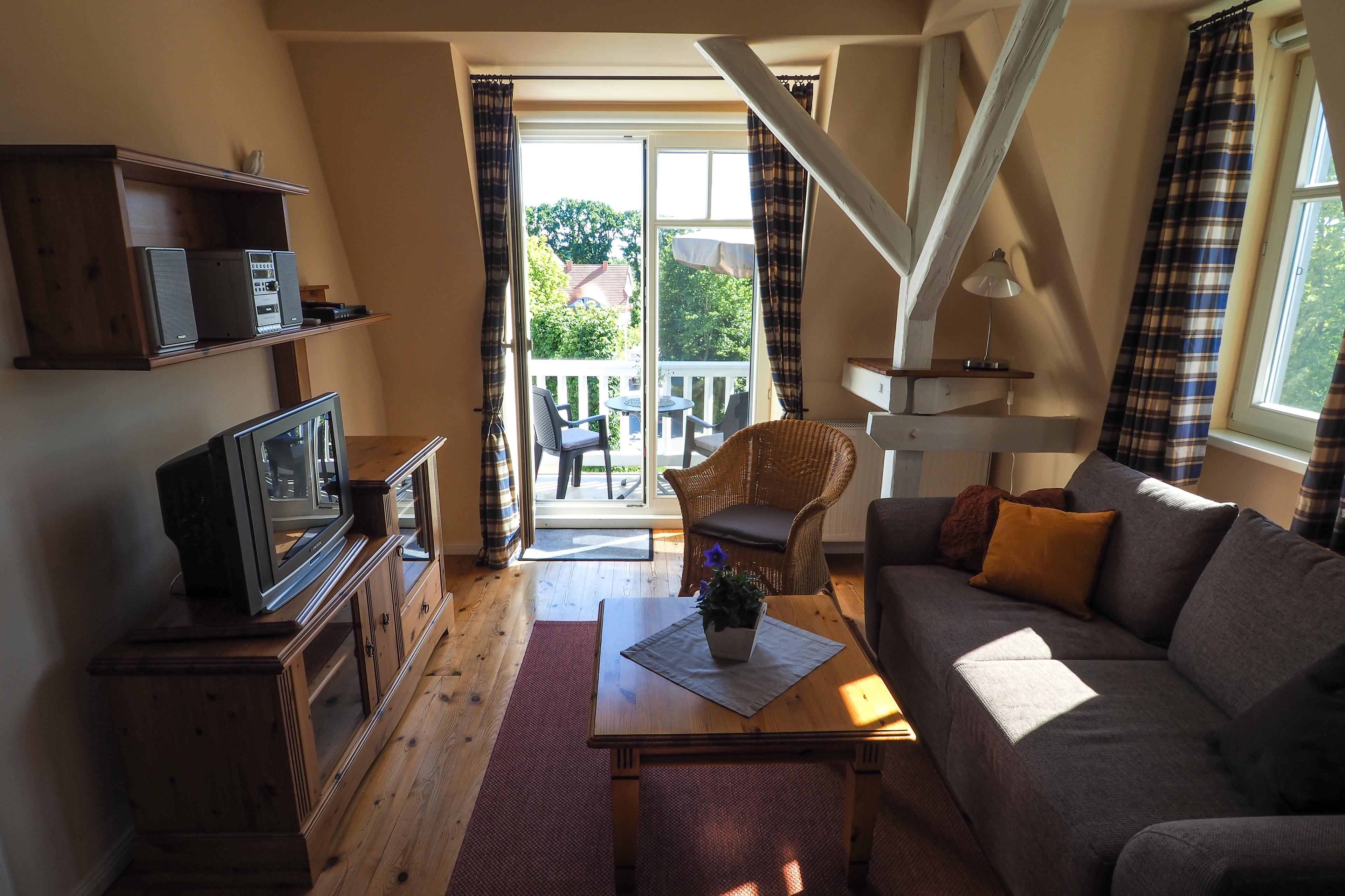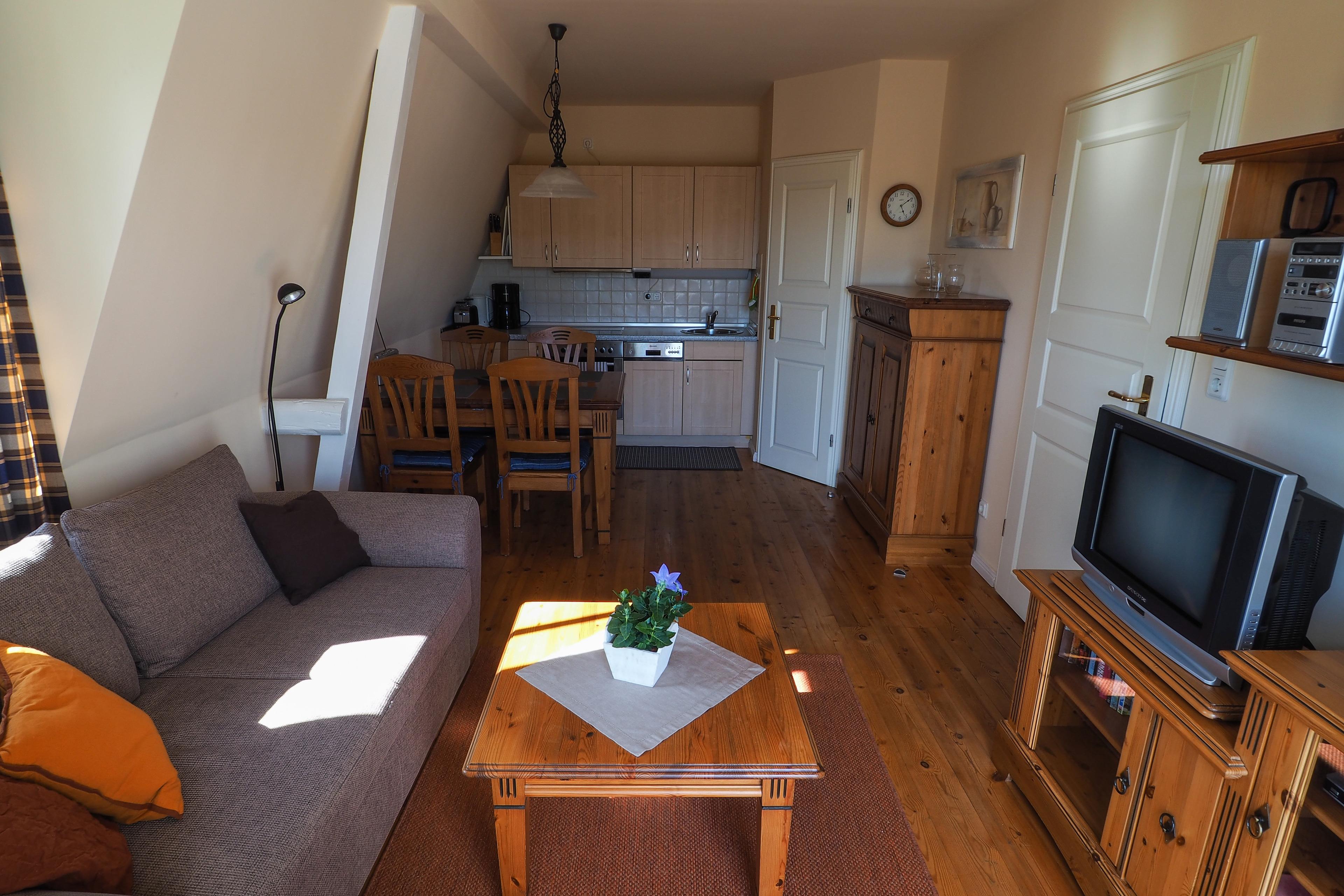 Die Ferienwohnung verfügt neben dem kombinierten Wohn-Essbereich über ein separates Schlafzimmer. Für kleine Familien kann das Sofa im Wohnzimmer als Schlafcouch mit Federkernmatratze genutzt werden. Der schöne Balkon lädt nach dem Strandbesuch zum Verweilen ein.
