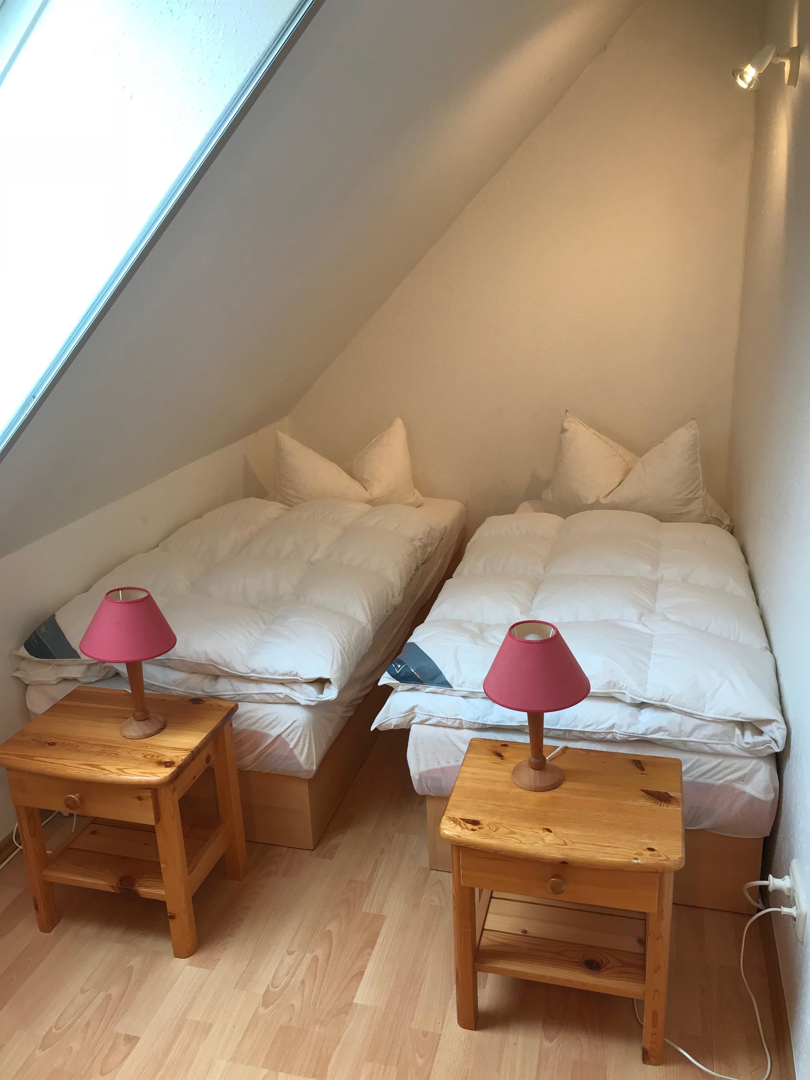 Im Obergeschoss befindet sich ein Schlafzimmer mit einem Doppelbett und ein offenes Schlafzimmer mit zwei Einzelbetten.