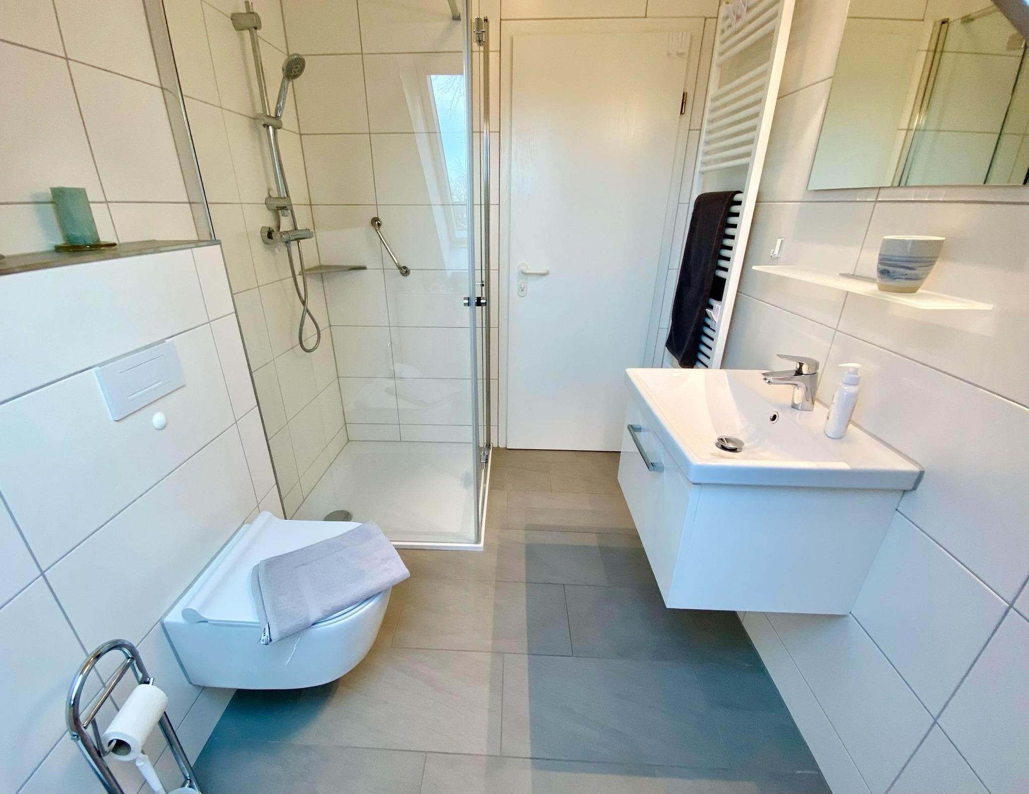 Die 72 qm große Wohnung liegt im 2. Stock. Eine Wendeltreppe führt auf den ausgebauten Spitzboden mit Galerie zum Wohnzimmer - besonders beliebt zum separaten Wohnen von Kindern. Hier hat man über ein Rundfenster einen guten Ausblick über den Boddendeich bis hin zur Meiningenbrücke. Die separate Küche und ein gerade restauriertes modernes Duschbad erhöhen den Wohnkomfort.